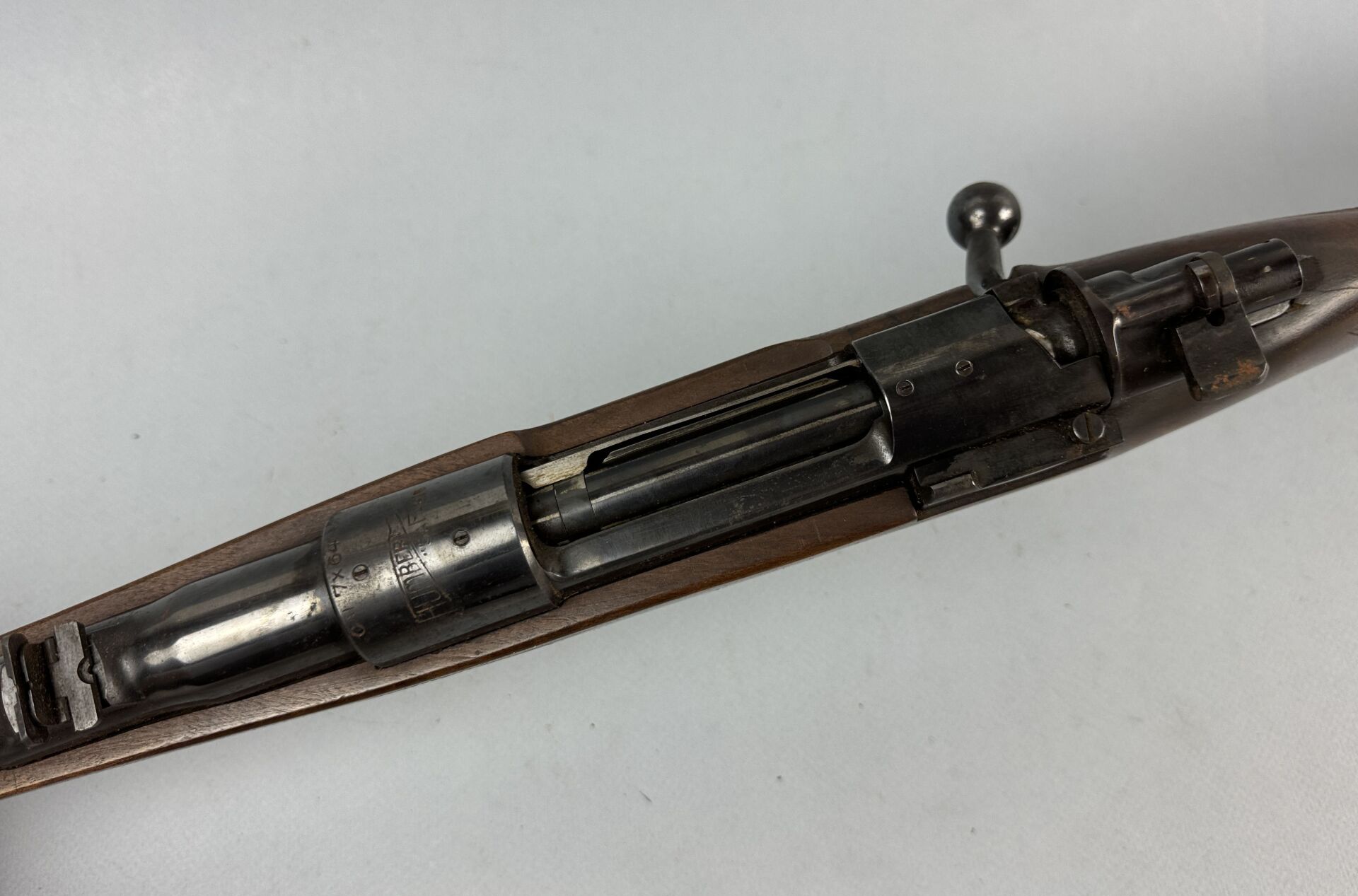 Carabine grande chasse système Mauser 98 vendu par Humbert à Saint Etienne, calibre 7 x 64, monture à fut court vernie joue et dos de cochon, boite de culasse civile (pas de passage pour le pouce), hausse réglable, fond de magasin démontable. Canon de 610 mm. Quelques piqures superficielles sur le bronzage du canon. Mécanisme fonctionnel.