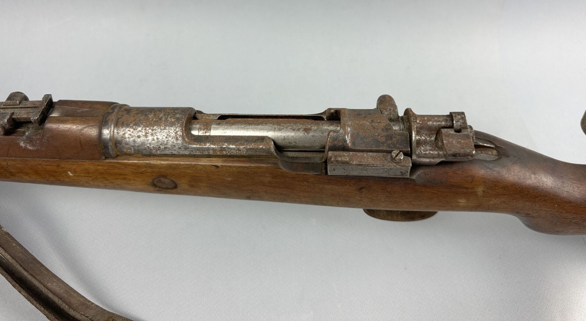 Carabine règlementaire allemande modèle 98 A, fabrication Arsenal Impérial d’Erfurt en 1909, culasse au numéro, arme complète avec sa bretelle, très bon canon pour le tir, arme à nettoyer couverte d’une mousse de rouille superficielle avec une dragonne allemande de compagnie en laine effilochée