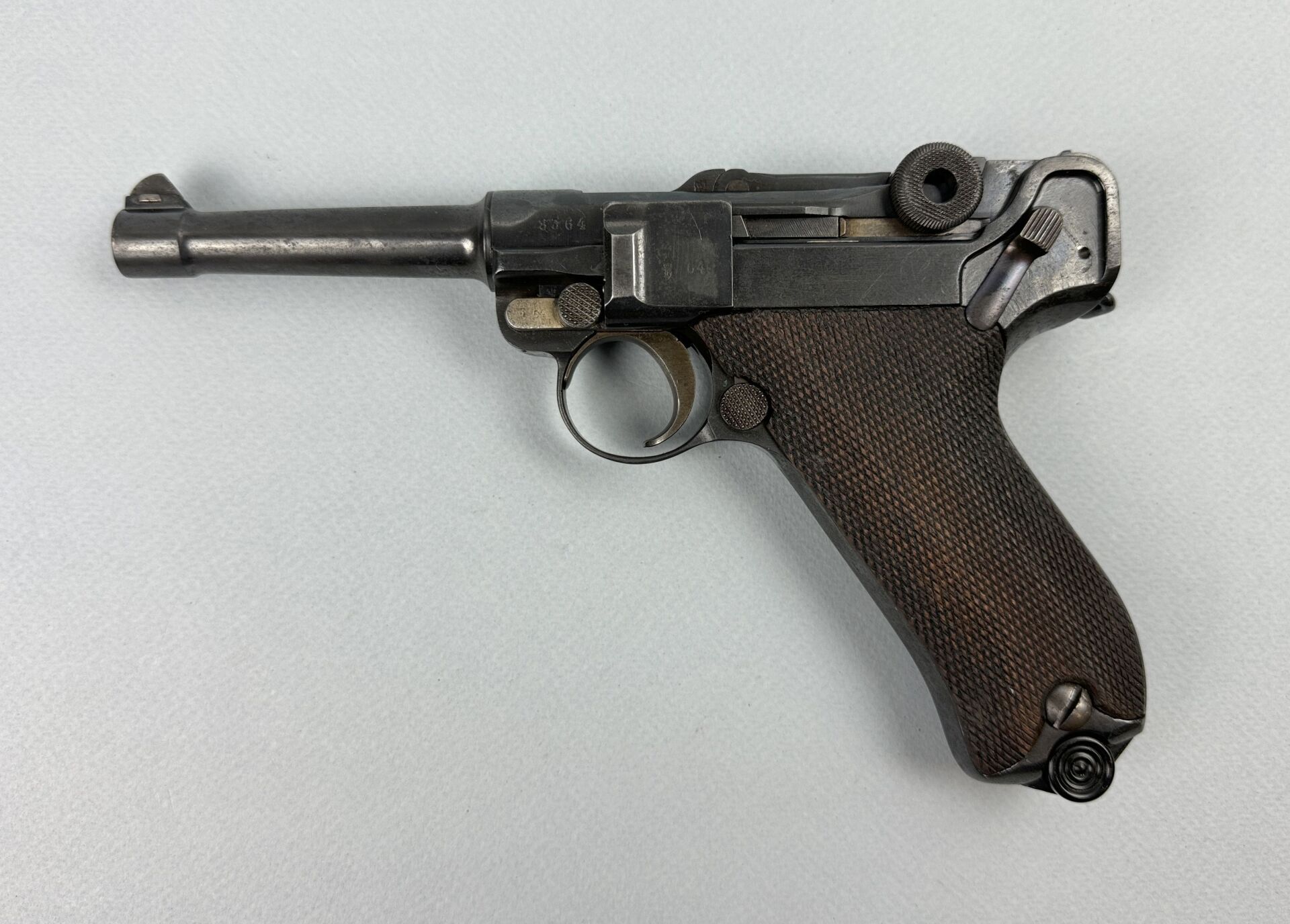 Pistolet P08/14, fabrication Erfurt, l’arme a été rebronzée au sel et la date sur le tonnerre a été effacée lors du repolissage, version primitive sans prise de crosse, toutes les pièces périphériques ont été remises en couleur. Arme livrée avec deux chargeurs (un chargeur moderne et un chargeur fond aluminium) dans une réplique d’étui cuir rigide.