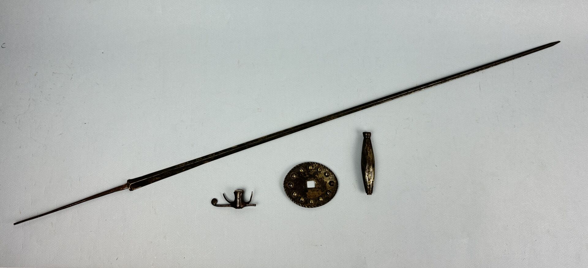 Épave incomplète d’une épée de Cour XVIII°, lame triangulaire à trois pans creux, plateau de garde ovale à décor interne de cabochons facettés, fusée fer à facettes renflée en son centre, quillon et pas d’âne figuratif, manque branche de garde et pommeau, pas de fourreau.