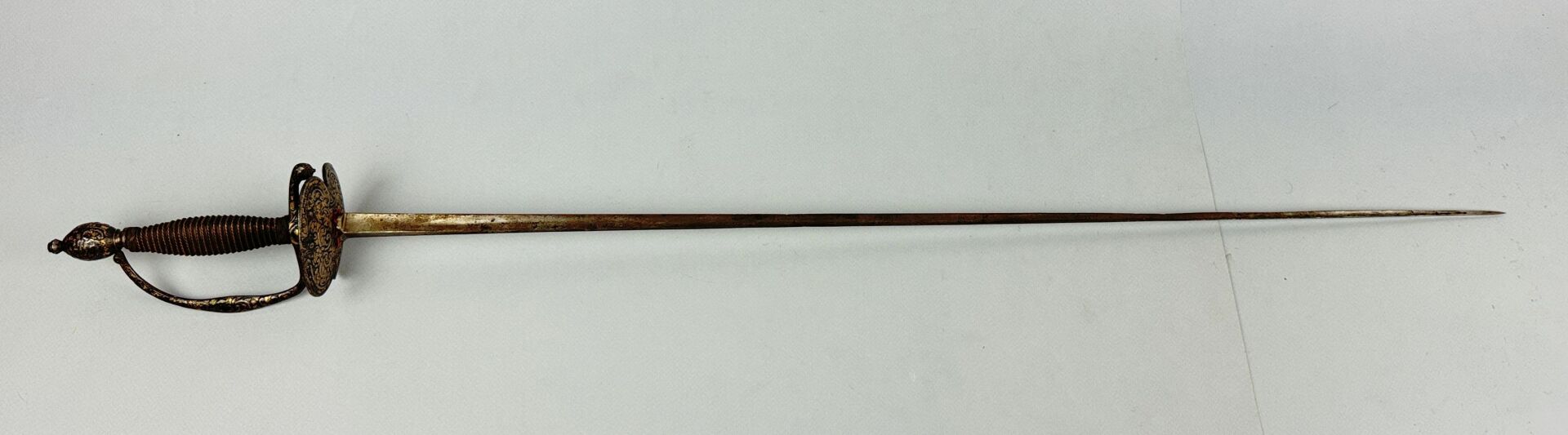 Belle épée à la française, lame triangulaire à trois pans creux vierge de marquages ou de décorations d’une longueur de 755 mm, épée montée fer doré, plateau de garde bivalve à décor rocaille en suite avec le reste de la décoration de la monture. Pommeau ovale à bouton de rivure proéminent, branche de garde unique évasée en son centre, quillon arqué vers l’avant, pas-d’âne figuratif, fusée à quatre pans arrondis galbée en son centre recouverte d’un fin filigrane de fils de cuivre et terminée par deux tresses de filigranes entrelacés, pas de fourreau.