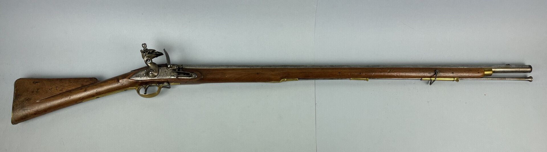 Fusil réglementaire Anglais à silex Brown-Bess calibre 69, platine réceptionnée à l couronne et au initiales « G.R » Pour Georges Rex, chien à espalet, réception au « broad arrow ». Belle monture en noyer clair vernie poinçon « PDL ». Mécanisme fonctionnel. Longueur du canon 1000 mmm. Longueur totale 1393 mm.