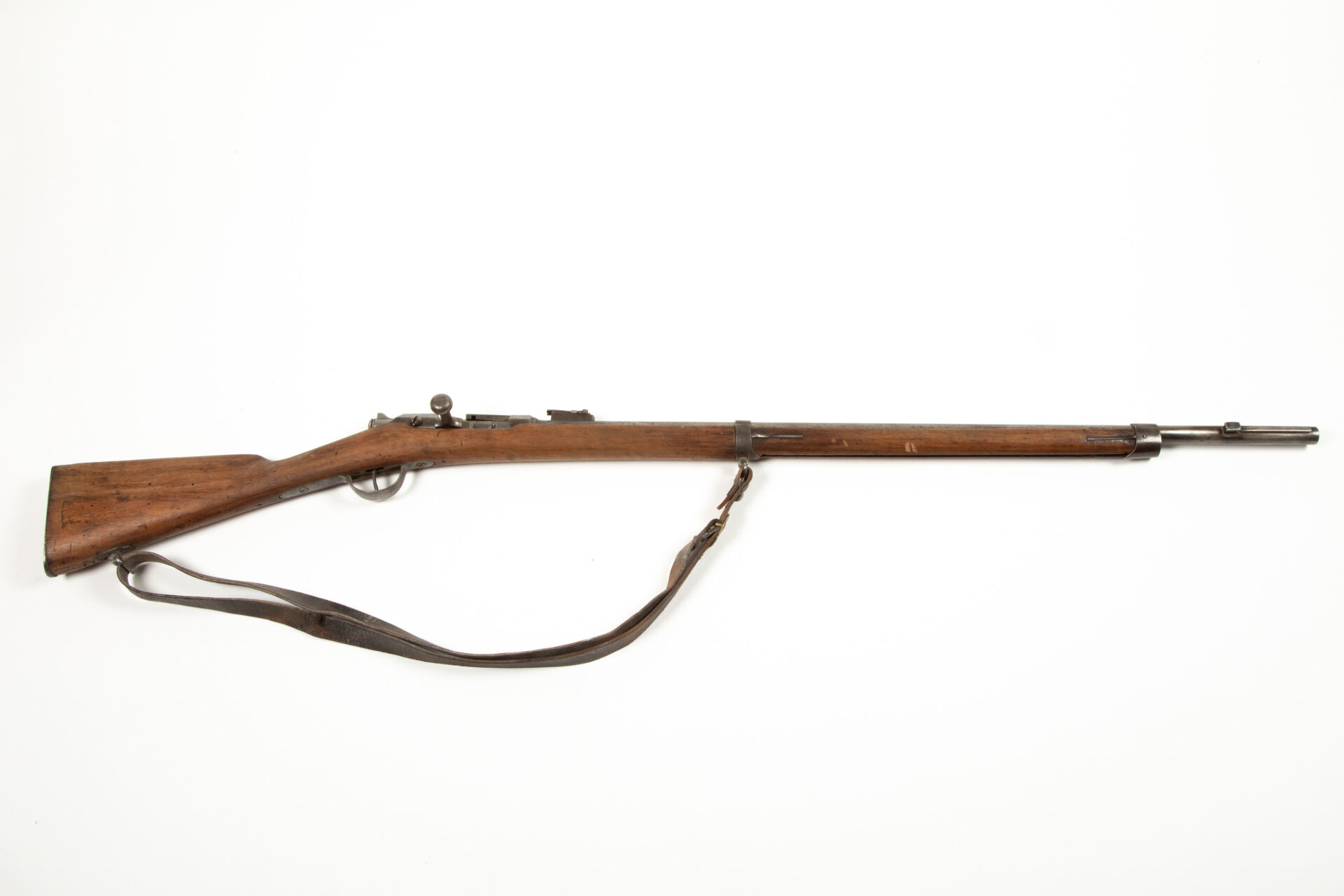 Joli petit fusil de bataillon scolaire type Andrieu, arme fictive de petite proportion imitant un fusil Gras d’Infanterie, crosse marquée H100, avec sa bretelle et sa directrice de baïonnette.