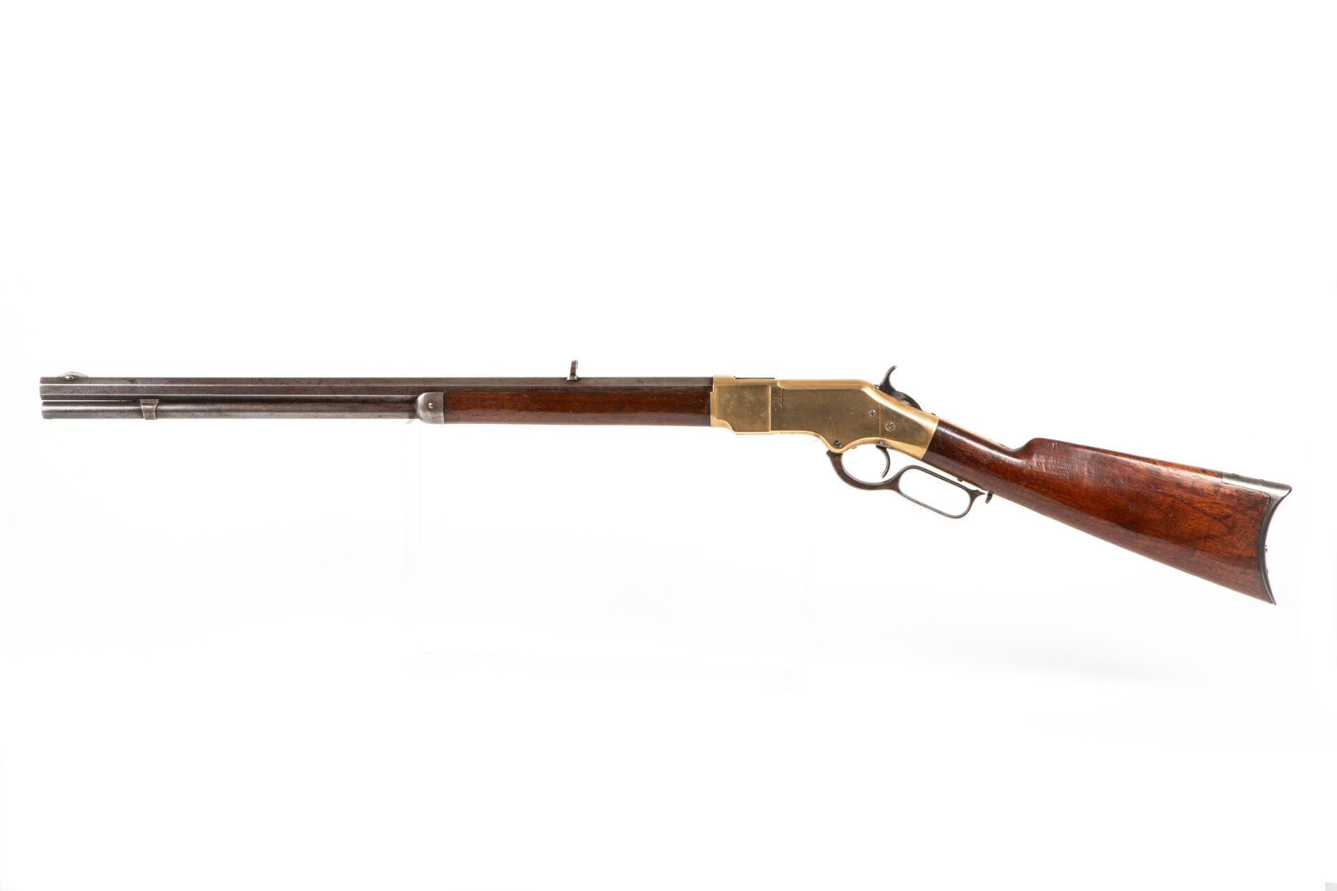 Rare rifle Winchester 1866, calibre 44 CF, canon octogonal portant les marquages de la firme Winchester bien visibles sur deux lignes, finitions du canon ayant viré au tabac, long guidon en maillechort sur queue d’aronde, hausse fixe dérivable par queue d’aronde. Boite de culasse bronze, tube magasin se prolongeant jusqu’à la bouche, canon de 620 mm. Très bon canon pour le tir, monture en noyer américain vernis, devant bois à mi-canon terminé par une capuche fer. Crosse à plaque de couche incurvée à fort retour, belle rayure pour le tir. Mécanisme fonctionnel.