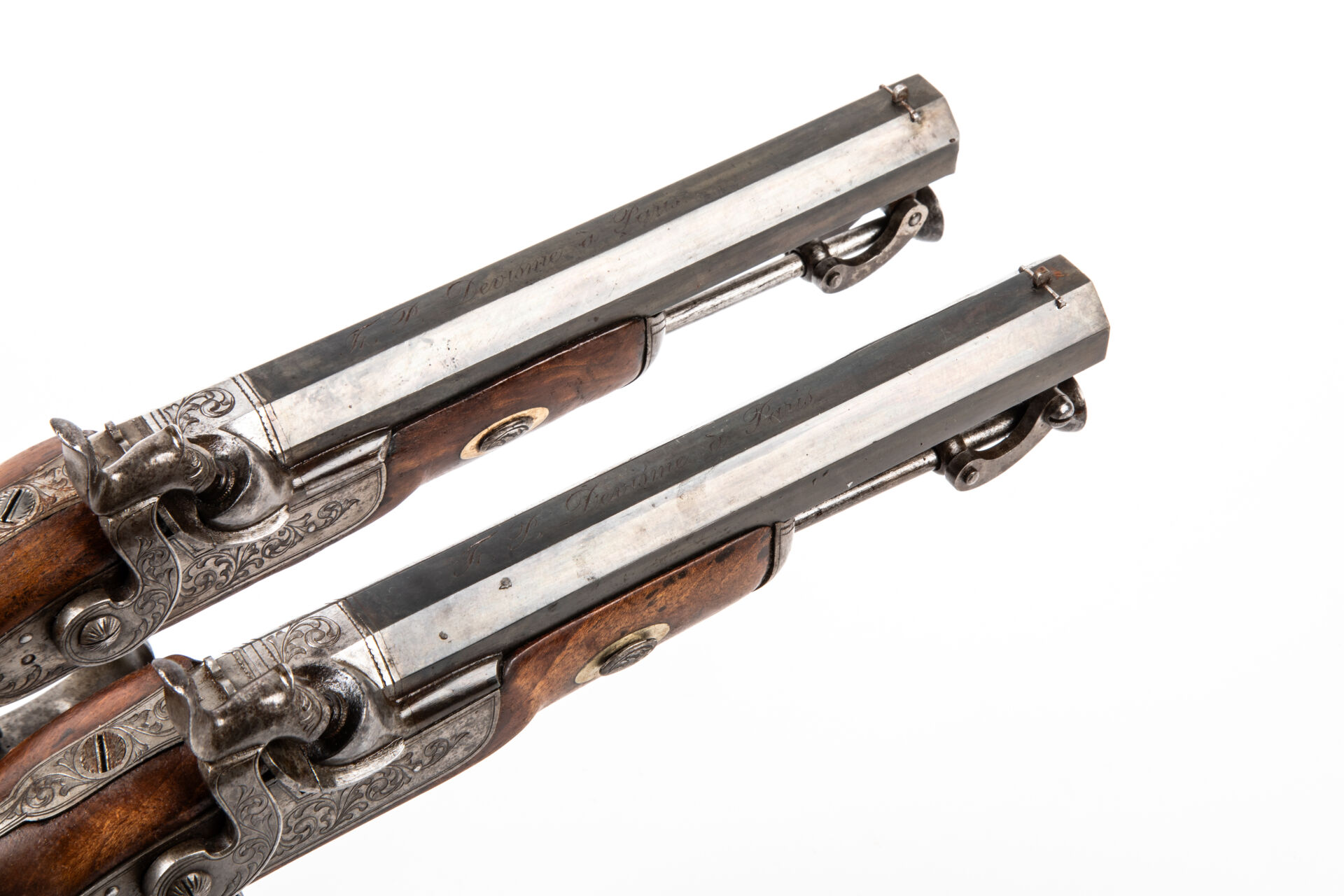 Coffret contenant une grande paire de pistolets de combat à percussion et platine à l’avant, canons octogonaux au calibre de 16 balles à la livre, rayures panier, guidon dérivable sur queue d’aronde, poinçon d’épreuve belge sur les canons (?), baguette fer articulée imperdable, les canons ont été remis en couleur au bronzage à froid et portent le marquage apocryphe en lettres cursives « F.P. Devisme à Paris » (le prénom de Devisme était Louis François), gravure sans garantie ou repassée. Platines à l’avant plates gravées tout comme le chien de rinceaux de feuillages, cheminées sur masselotte usinées dans le bouchon de culasse, calotte ronde formant réserve d’amorces et portant à l’arrière un anneau de calotte, pontet rond, capuche fer ronde à l’avant de la monture, monture en noyer à l’anglaise vernie et quadrillée à la poignée, mécanisme fonctionnel.