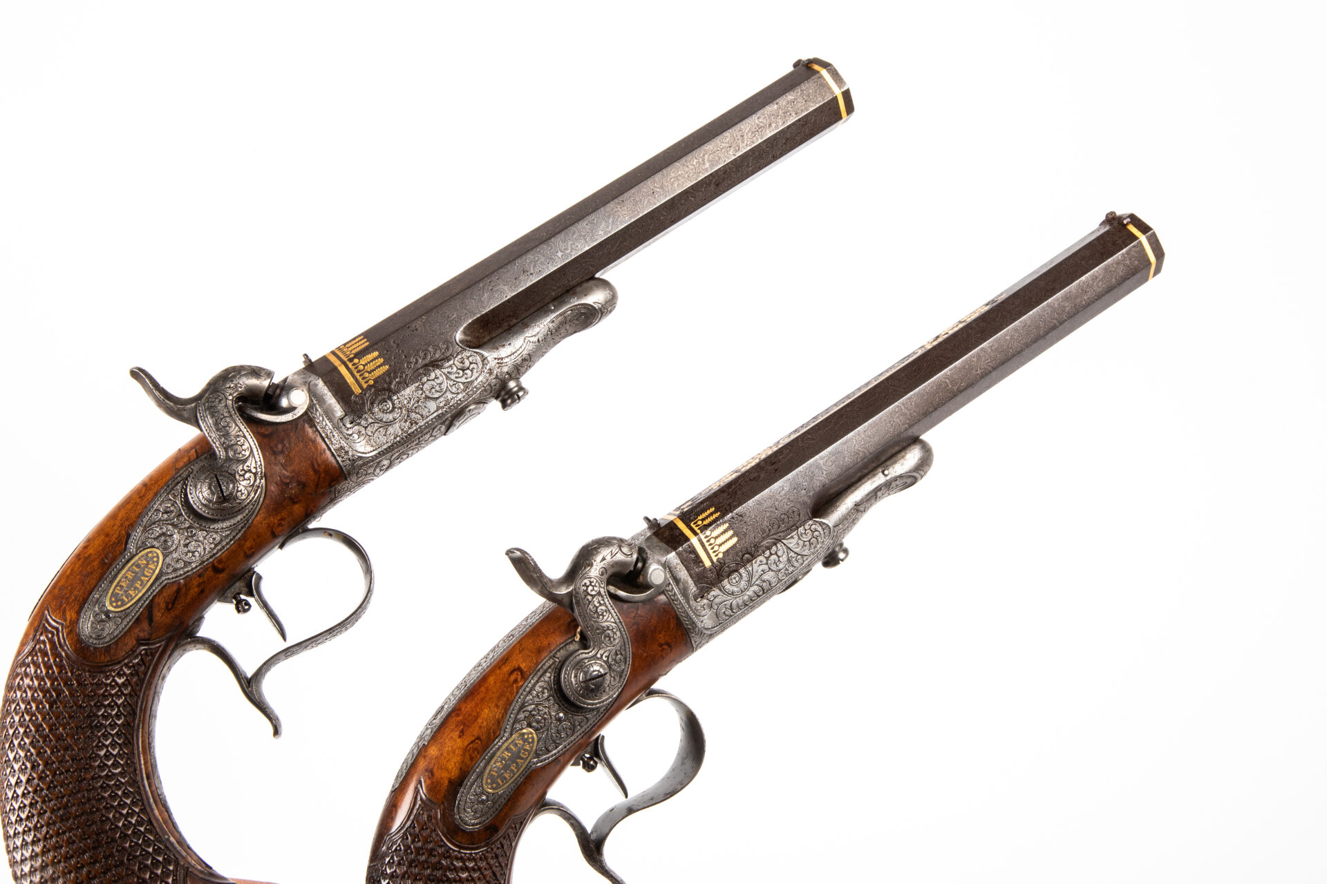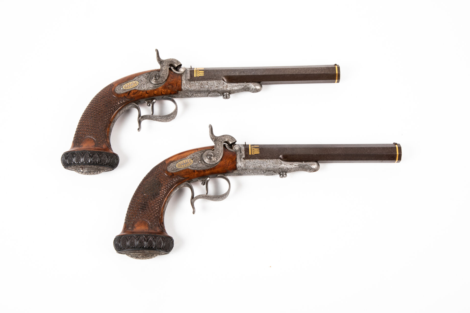 Dans une cassette montée à la Française et rhabillée sur lit de velours rouge se trouve une très belle paire de pistolets à percussion et canons pivotants pour le chargement par Perin Lepage, canons octogonaux en damas frisé et finitions feuilles mortes pivotant sur un axe découvrant la chambre pour les opérations de chargement par l’arrière. Canons rayés au calibre de 38 balles à la livre, les canons sont enrichis par la technique du tosia d’or à l’avant entourant le guidon d’un filet doré, à l’arrière d’une frise florale symétrique et sur le plat du canon dans un cartouche ovale à semi d’étoiles encadrées de volutes de feuillages dorées, le texte « INVON (invention) PERIN LEPAGE BREVETE A PARIS », manques à l’or de certaines lettres, quelques piqures résiduelles sous la finition. Garnie trempe grise finement gravée de volutes de feuillages et de crosses de fougères, bouton poussoir à l’avant du pontet commandant la rotation et le blocage en place du canon. Platines à l’arrière à terminaison rétrécie portant, dans un cartouche ovale, également à l’or, la signature « Perin Lepage », pontet à repose doigt, détente tendeur à basculage avant réglable, belle monture en loupe probablement de noyer, quadrillé écaille de poisson pointée à la poignée, calotte proéminente en ébène rapportée surmontée d’une calotte en dôme ovale à bord festonné. Mécanisme fonctionnel. Grain d’échappement de surpression en platine sur le flanc de la masselotte de cheminée.