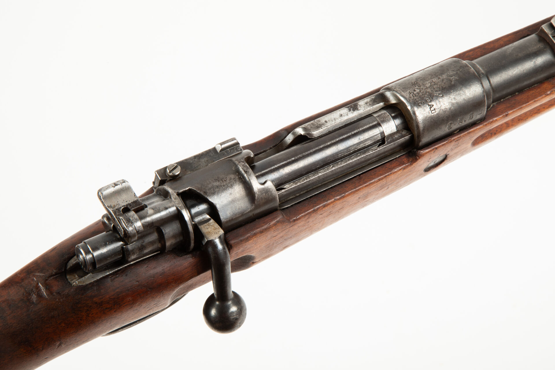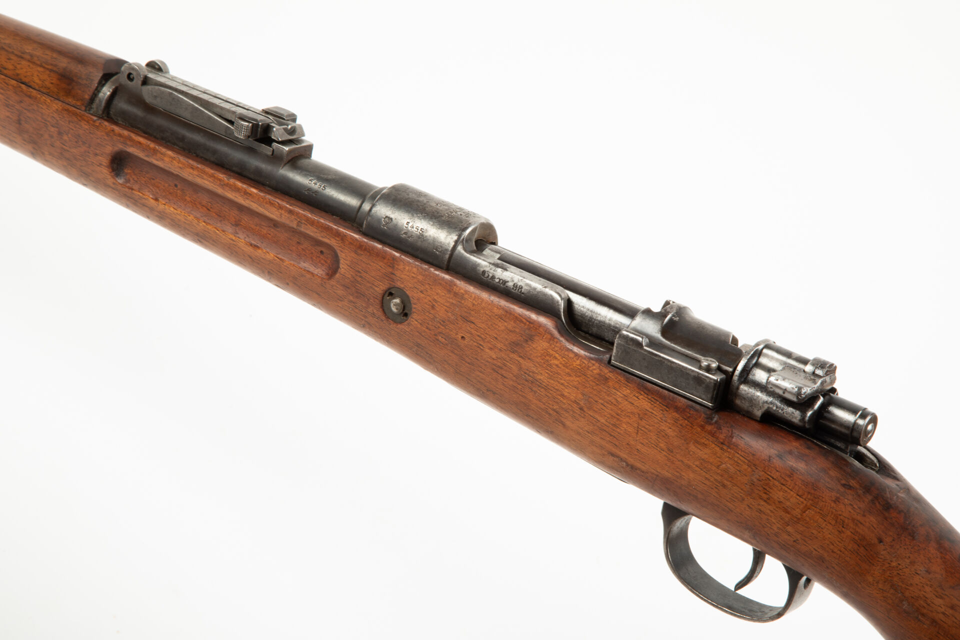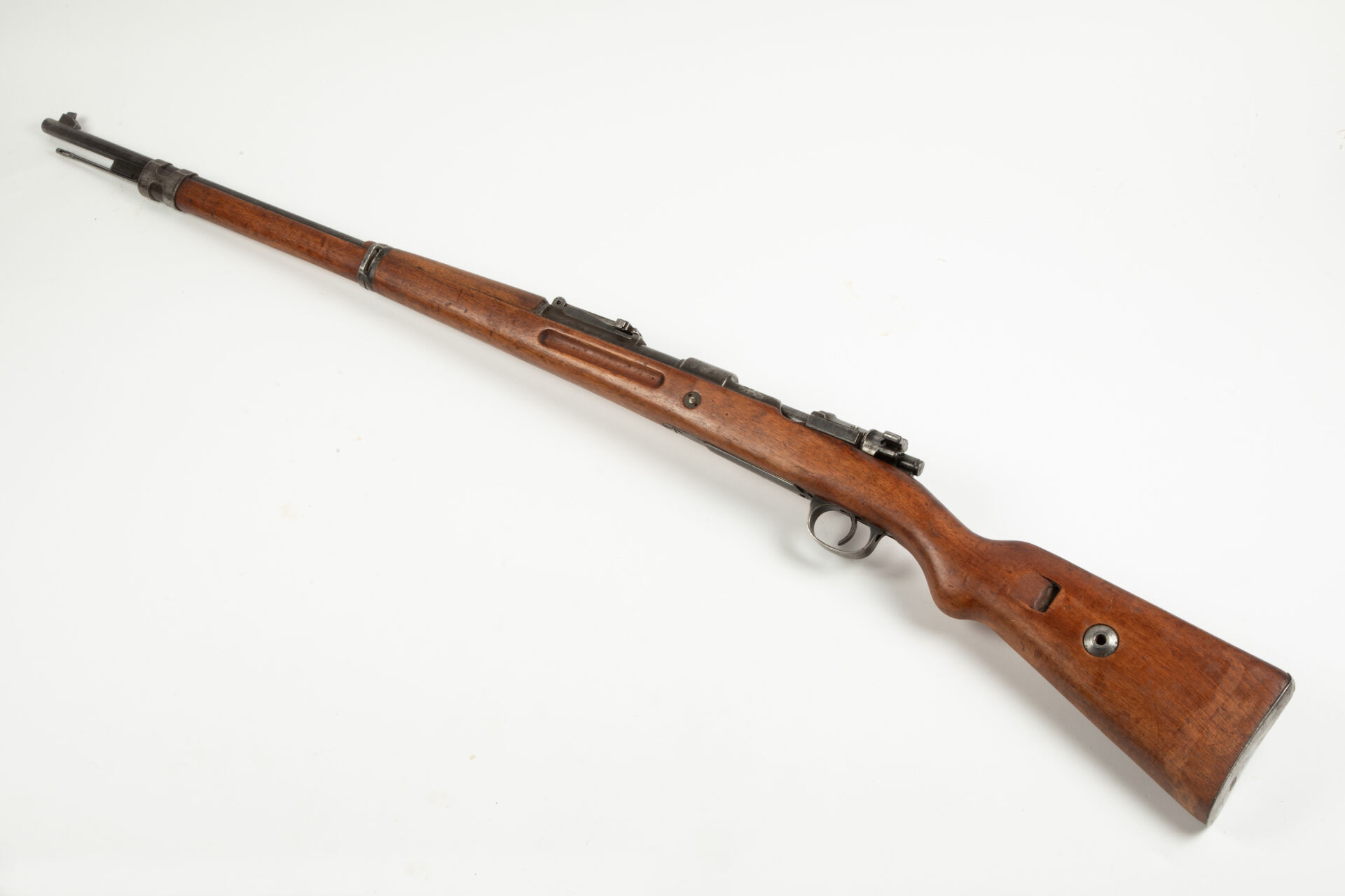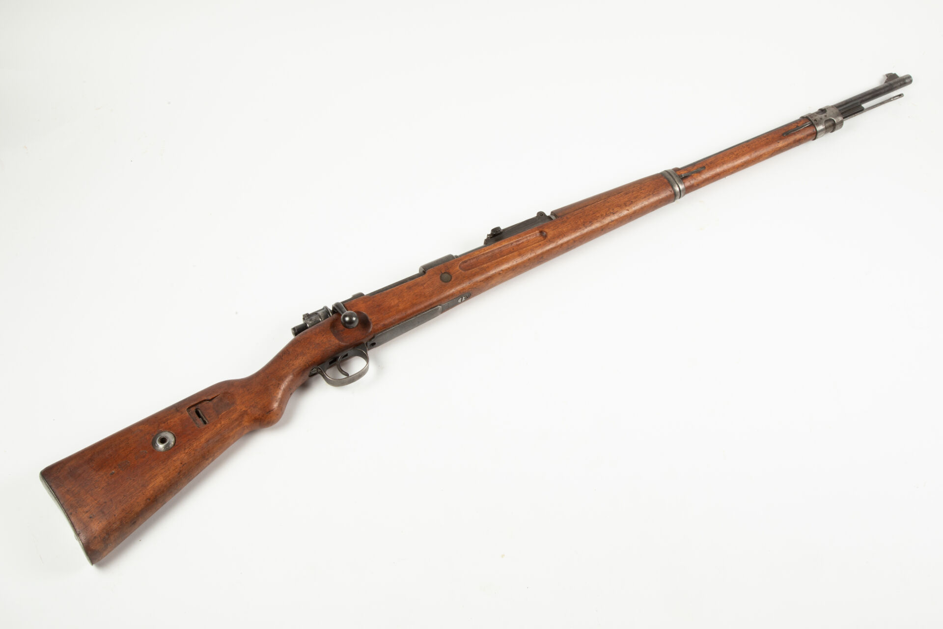 Fusil règlementaire allemand Mauser G98, fabrication Arsenal de Spandau en 1916, version modifiée sous la République de Weimar, culasse coudée (numéro effacé sur le levier), crosse avec oeillet de démontage de percuteur, fraisage de préhension du fût sous la hausse, hausse plate marquée S/42G (Modifié par Mauser en 1935), arme non monomatricule avec sa baguette, très bon canon d’origine pour le tir, calibre 8 x 57 JS. Mécanisme fonctionnel.