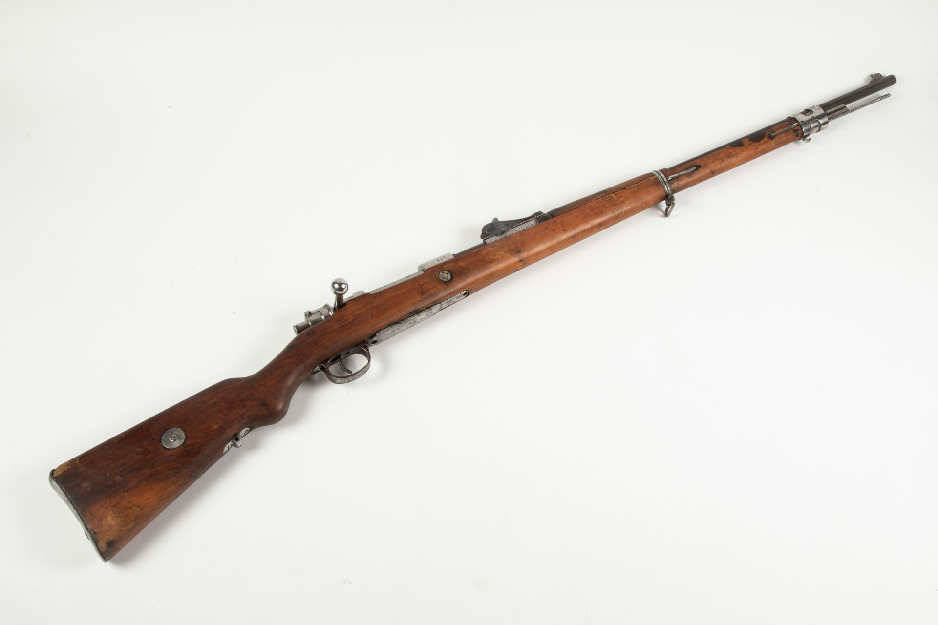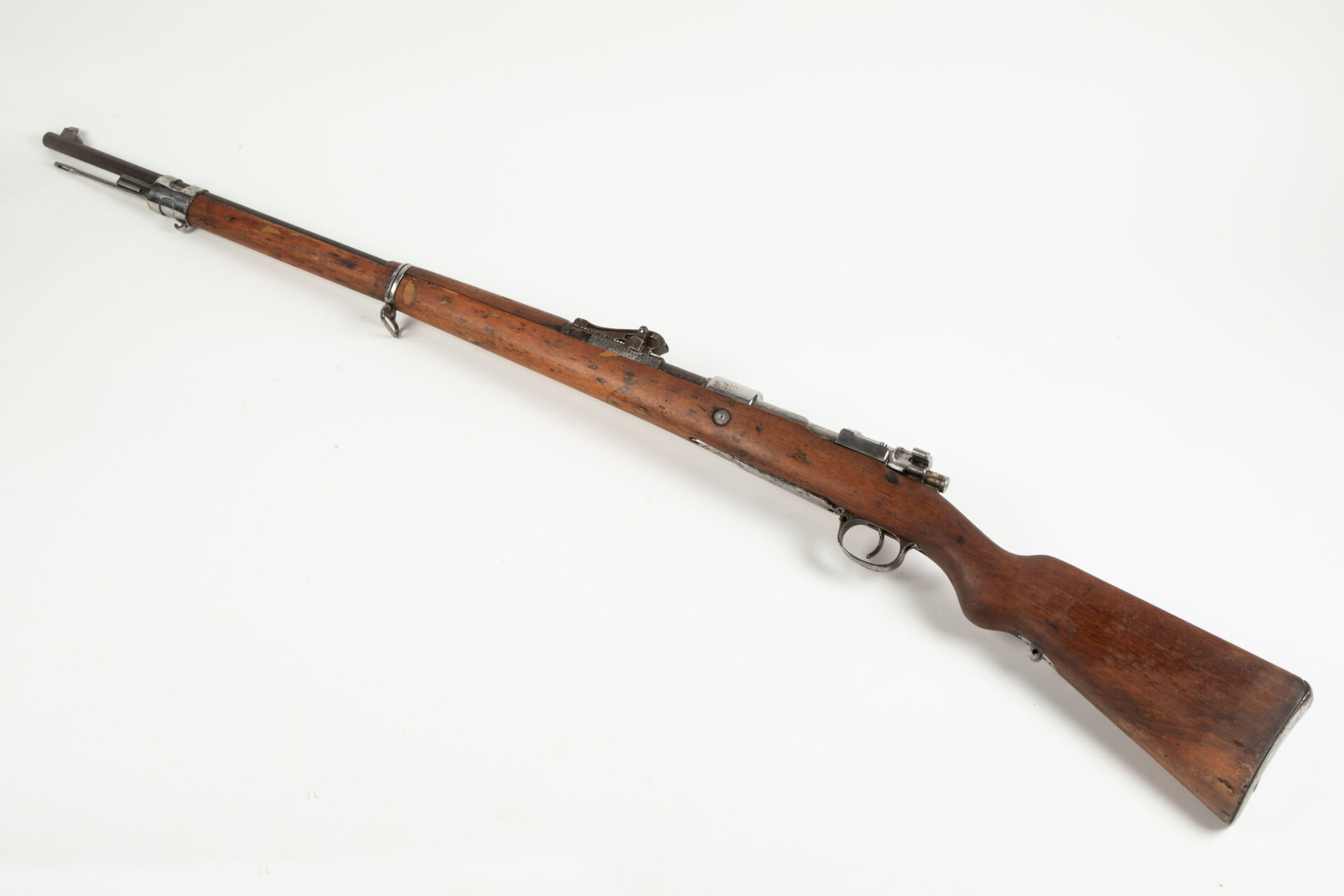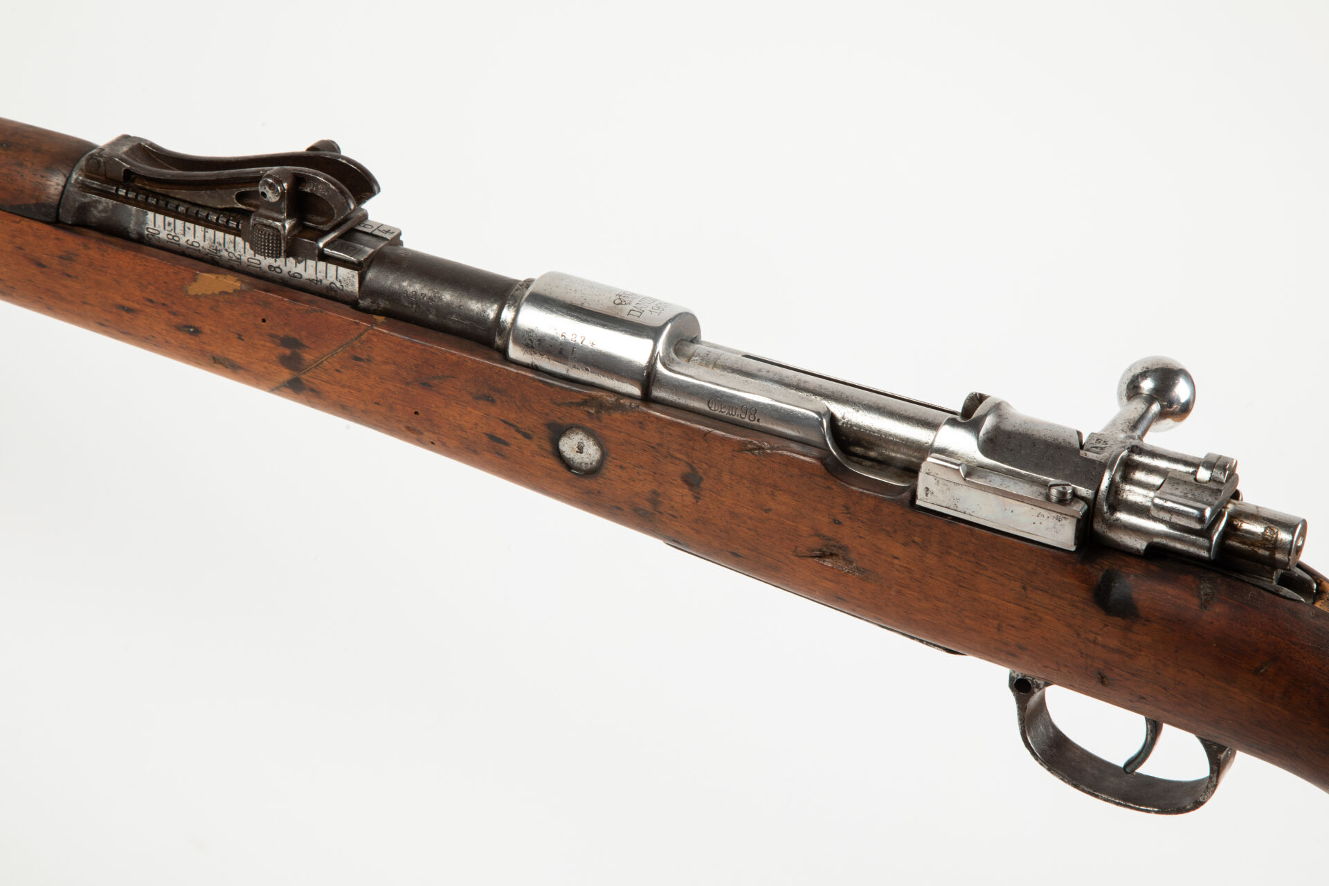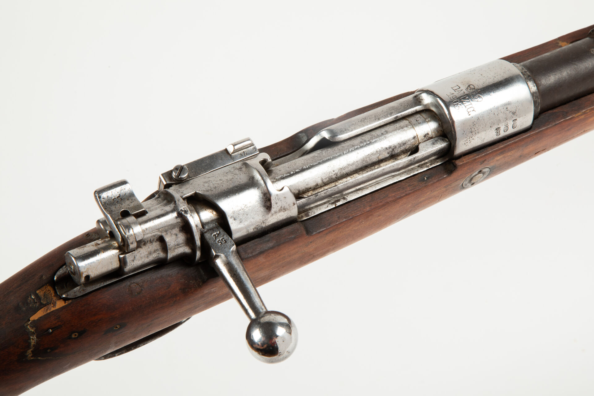 Fusil règlementaire allemand Mauser 1898, fabrication précoce Arsenal de Dantzig 1903, arme ayant subi la modification « S ». Hausse à 200m. Arme non monomatricule. Manque les contre-vis de sous garde. Monture enturée au niveau du fût avant sous la hausse. Affectation régimentaire « E.M.20.36 » (Marine ?). Action repolie blanc. Mécanisme fonctionnel. Très bon canon pour le tir.