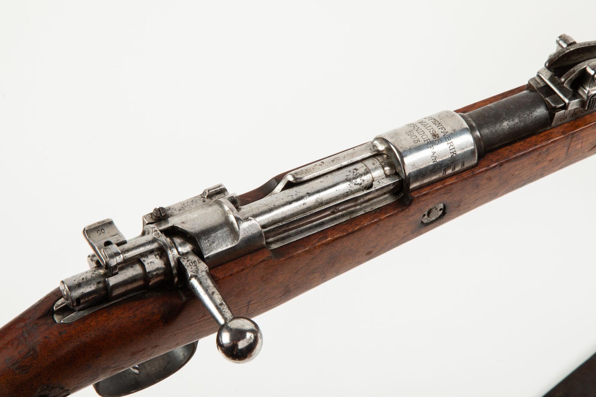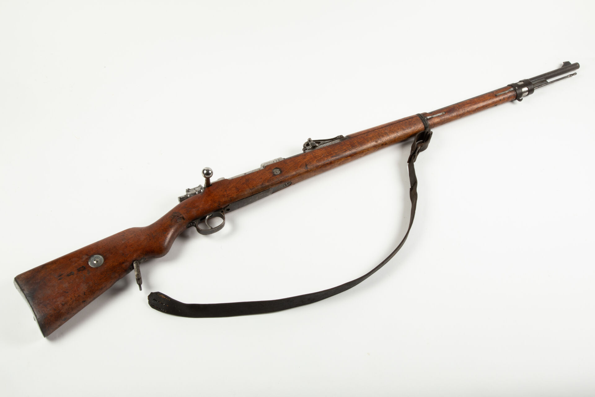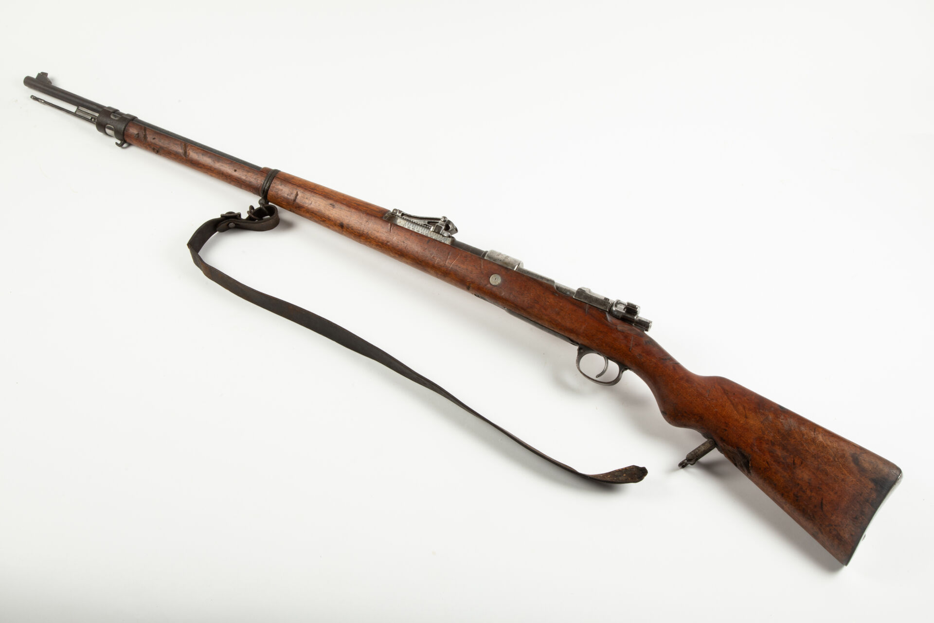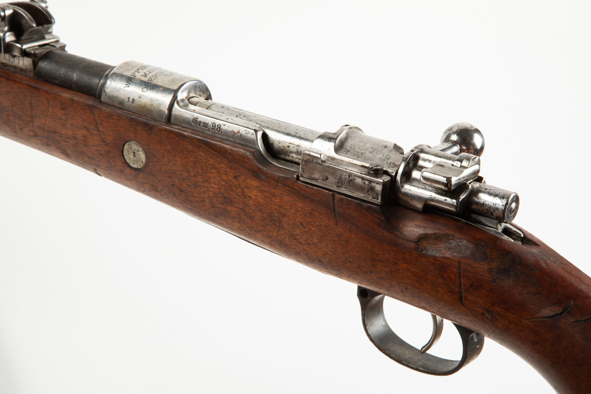Fusil règlementaire allemand Mauser G98, fabrication Waffenfabrik Mauser A-G Oberndorf A/N en 1903. Arme non monomatricule, modification « S », hausse commençant à 200 mètres, poignée de crosse impactée par un éclat d’obus n’affectant pas sa solidité, macaron de crosse régimenté 160.R.8.18 (18 eme arme de la 8 eme compagnie du 160e régiment d’Infanterie), tenon de baïonnette non fraisé sur ses flancs, boite de culasse et culasse repolies, bretelle présente (incomplète), bon canon pour le tir, baguette écrasée à la tête. (L’intérêt de cette arme réside dans le fait que c’est une réalisation relativement précoce et que le canon et la boite de culasse portent un petit numéro (18))