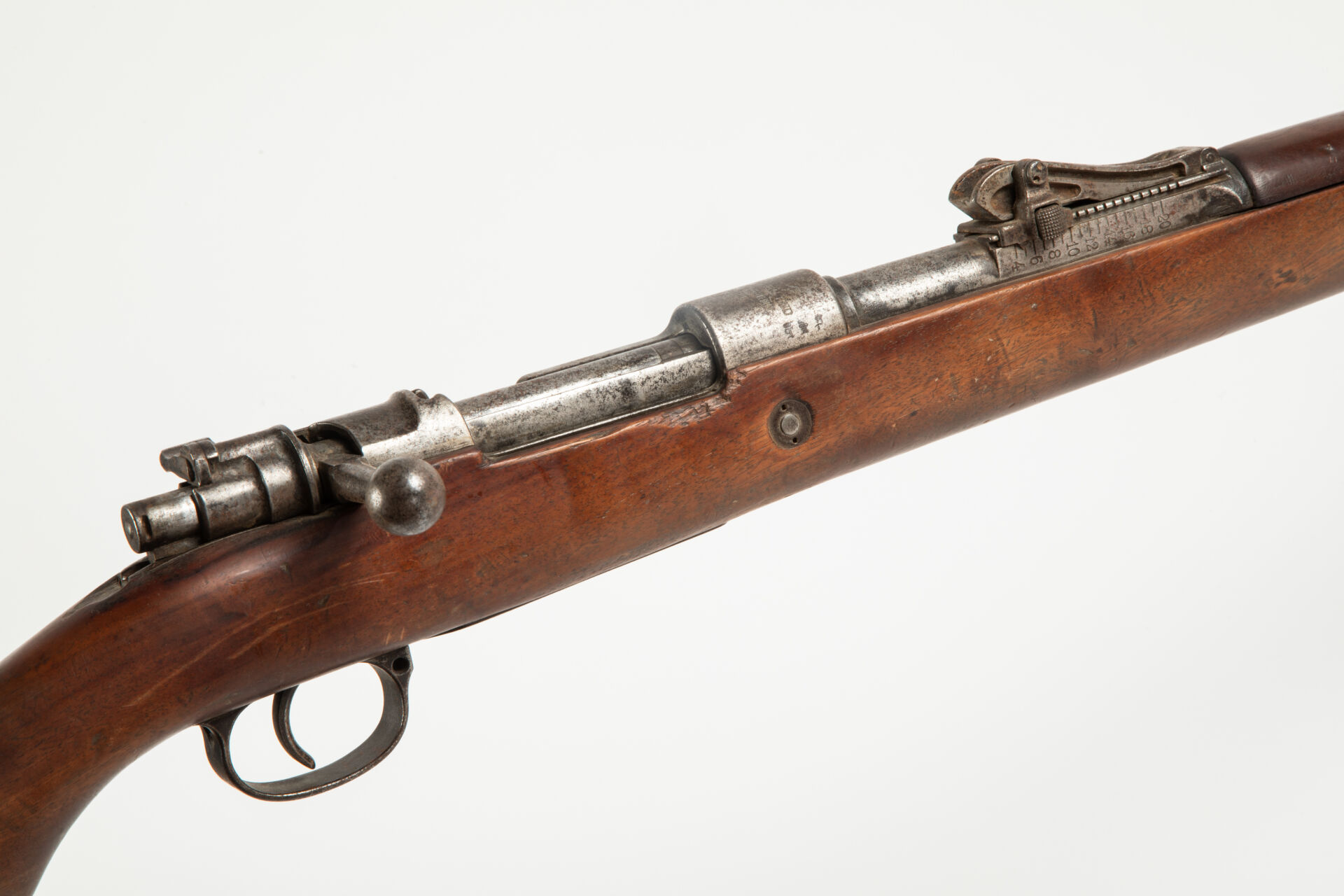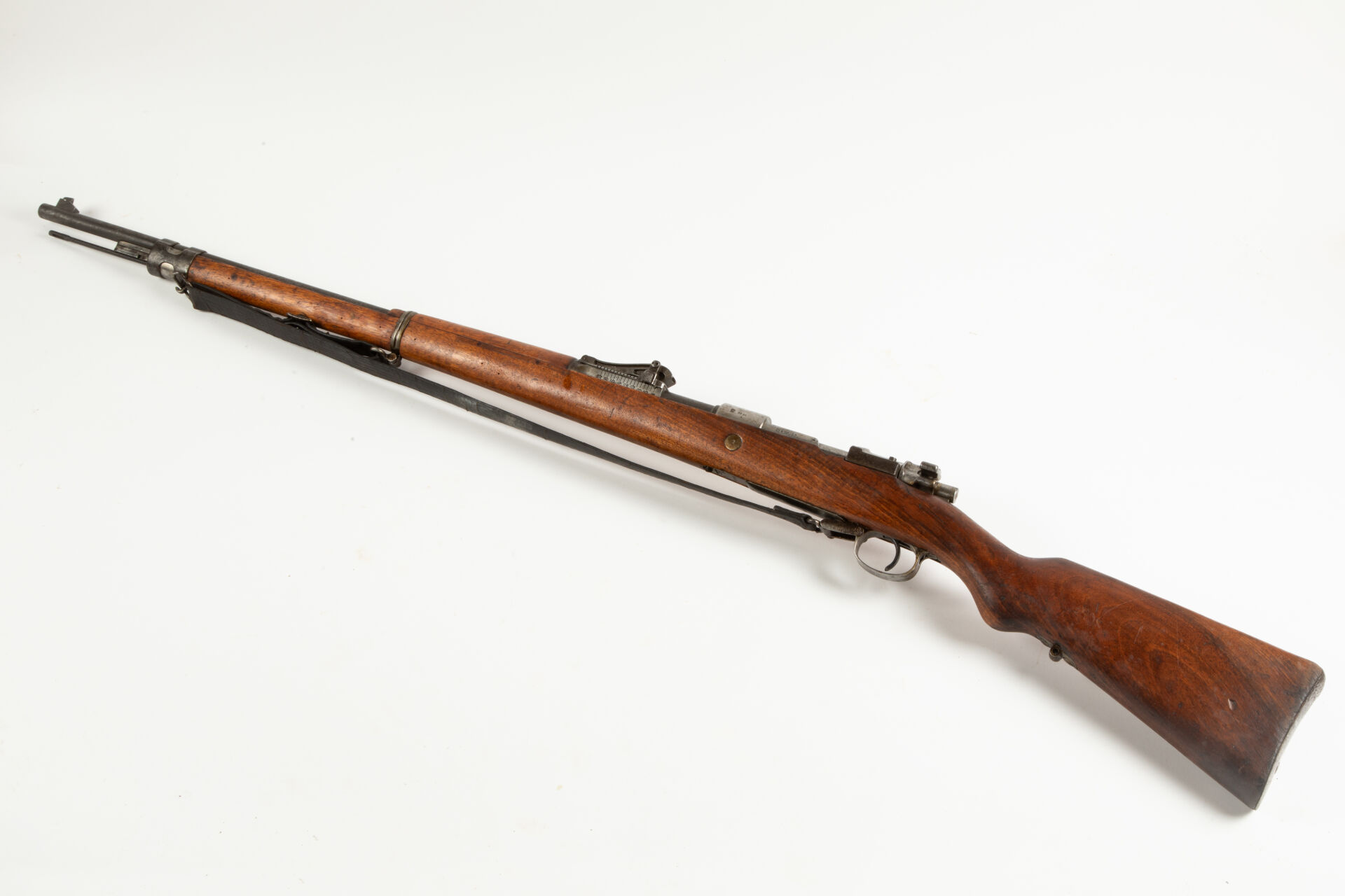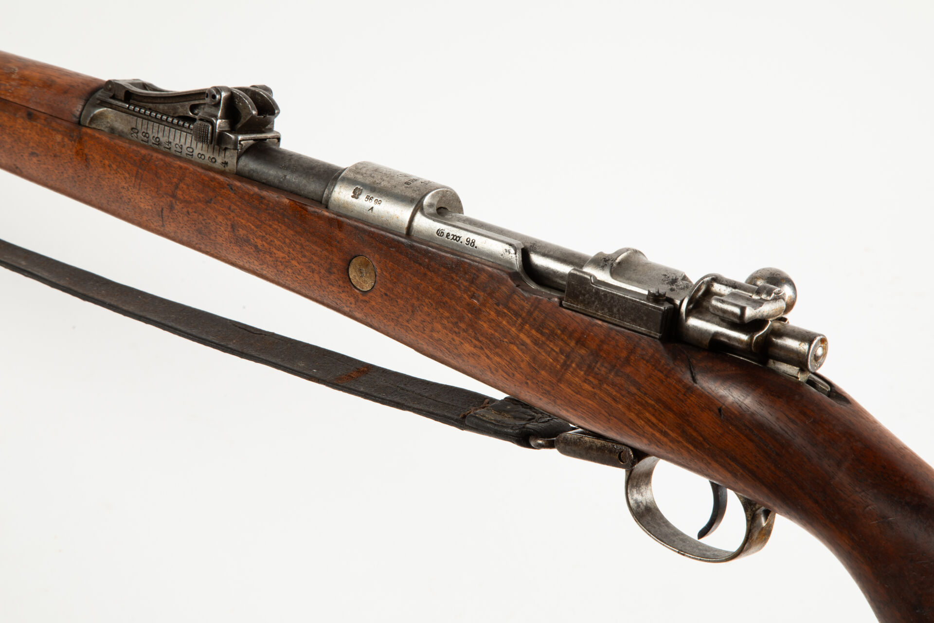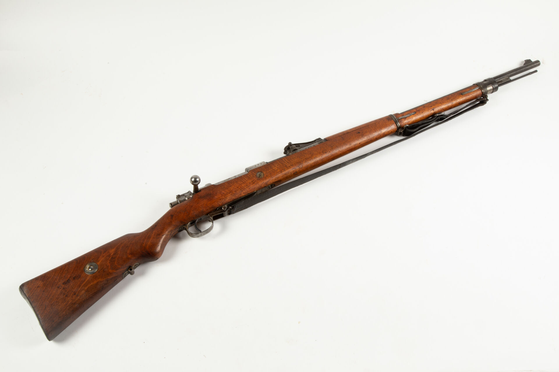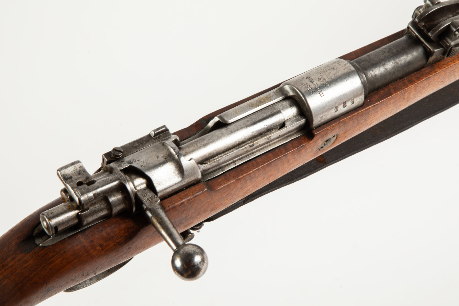 Fusil règlementaire allemand Mauser G98 issu de l’arsenal de Spandau 1915, arme non monomatricule. Modification « S ». Hausse commençant à 400 m. Embouchoir laissant voir le fraisage du tenon de baïonnette. Avec sa bretelle. Mécanisme fonctionnel. Bon canon pour le tir (à nettoyer).