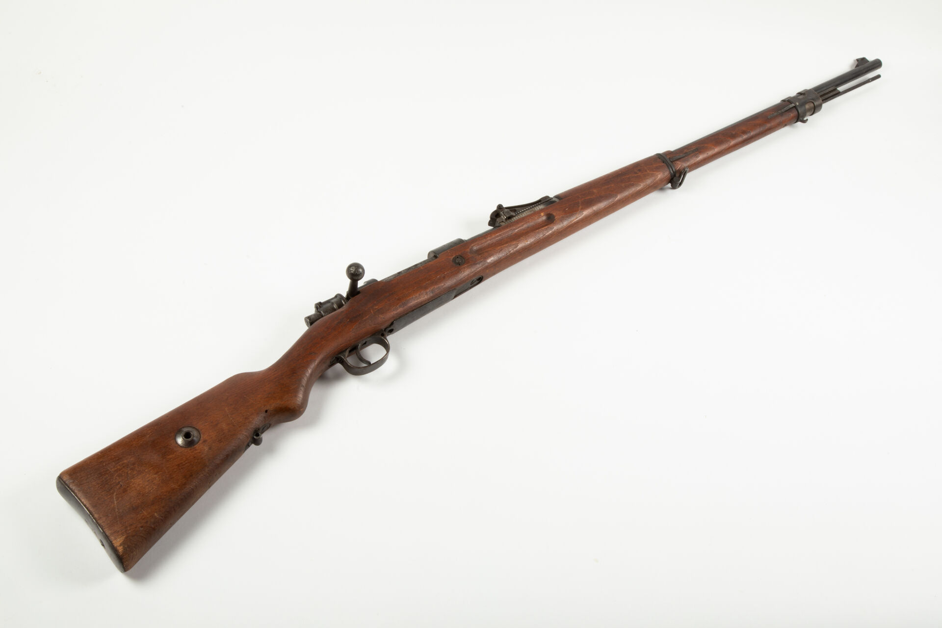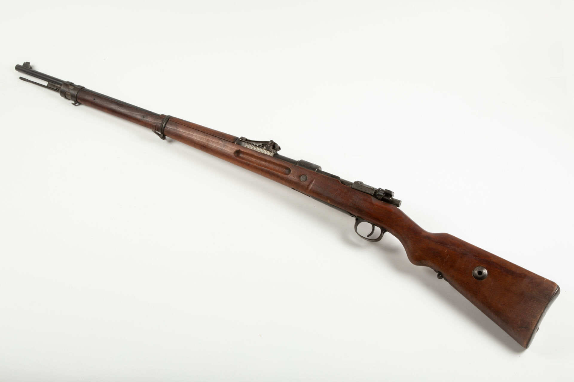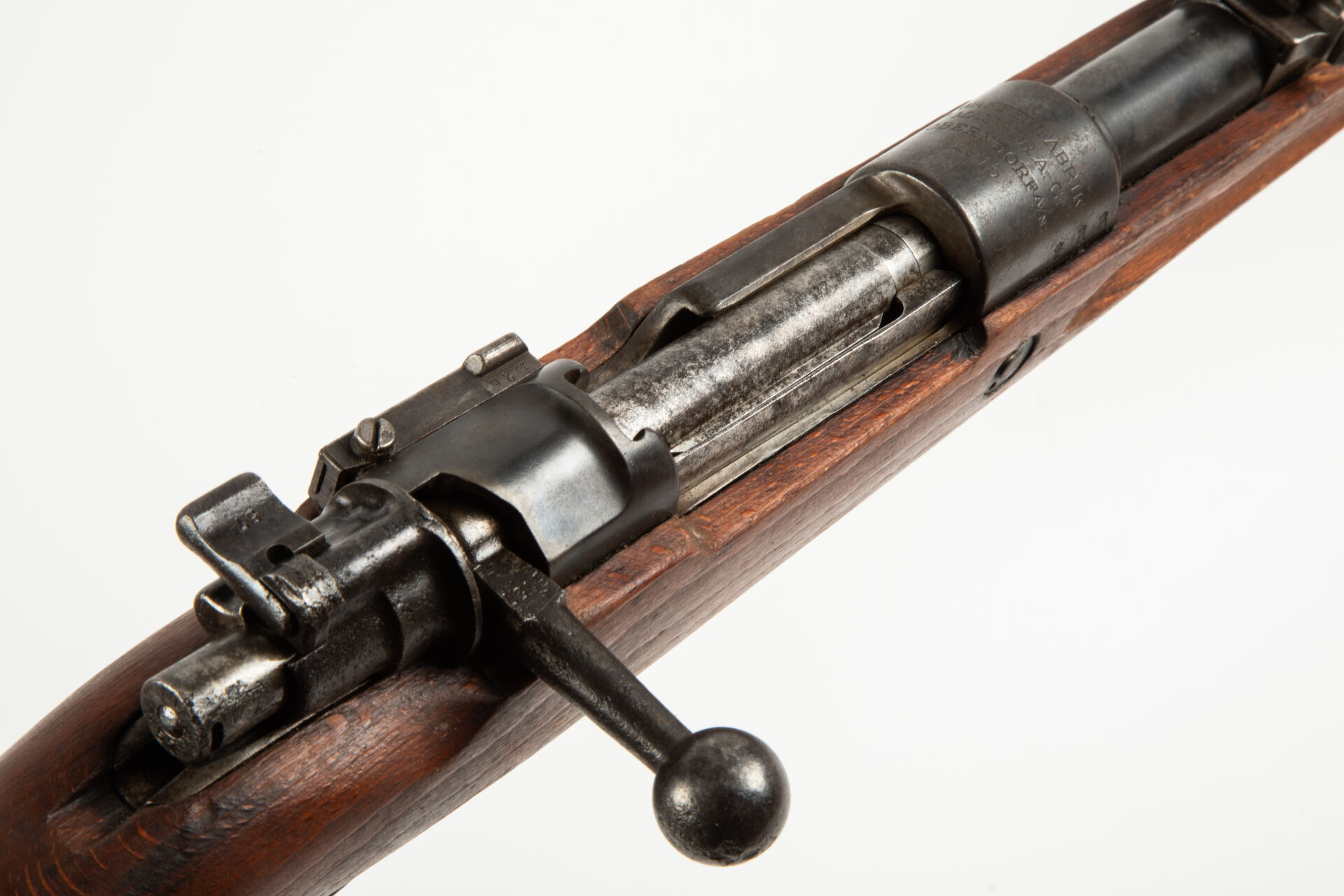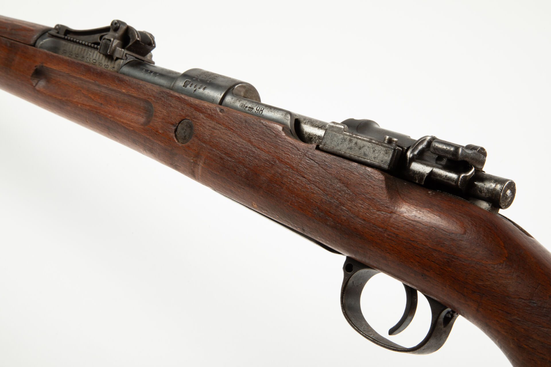 Fusil Mauser G98, fabrication Waffenfabrick Mauser en 1915, numéro composite, bon canon pour le tir. Version tardive de crosse avec œillet de démontage de percuteur et fraisage dans le bois sous la hausse. Hausse commençant à 400 m. Mécanisme fonctionnel.