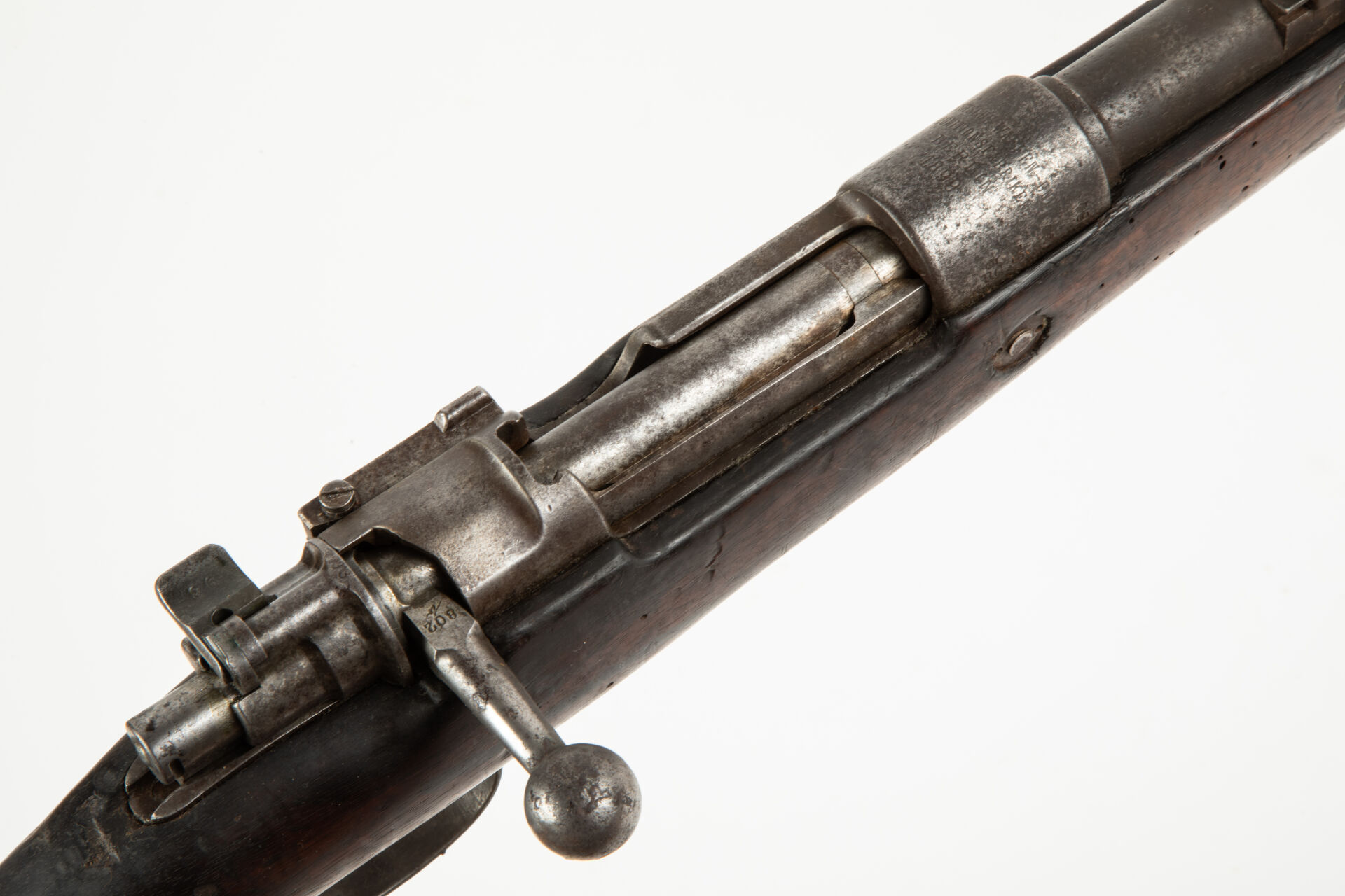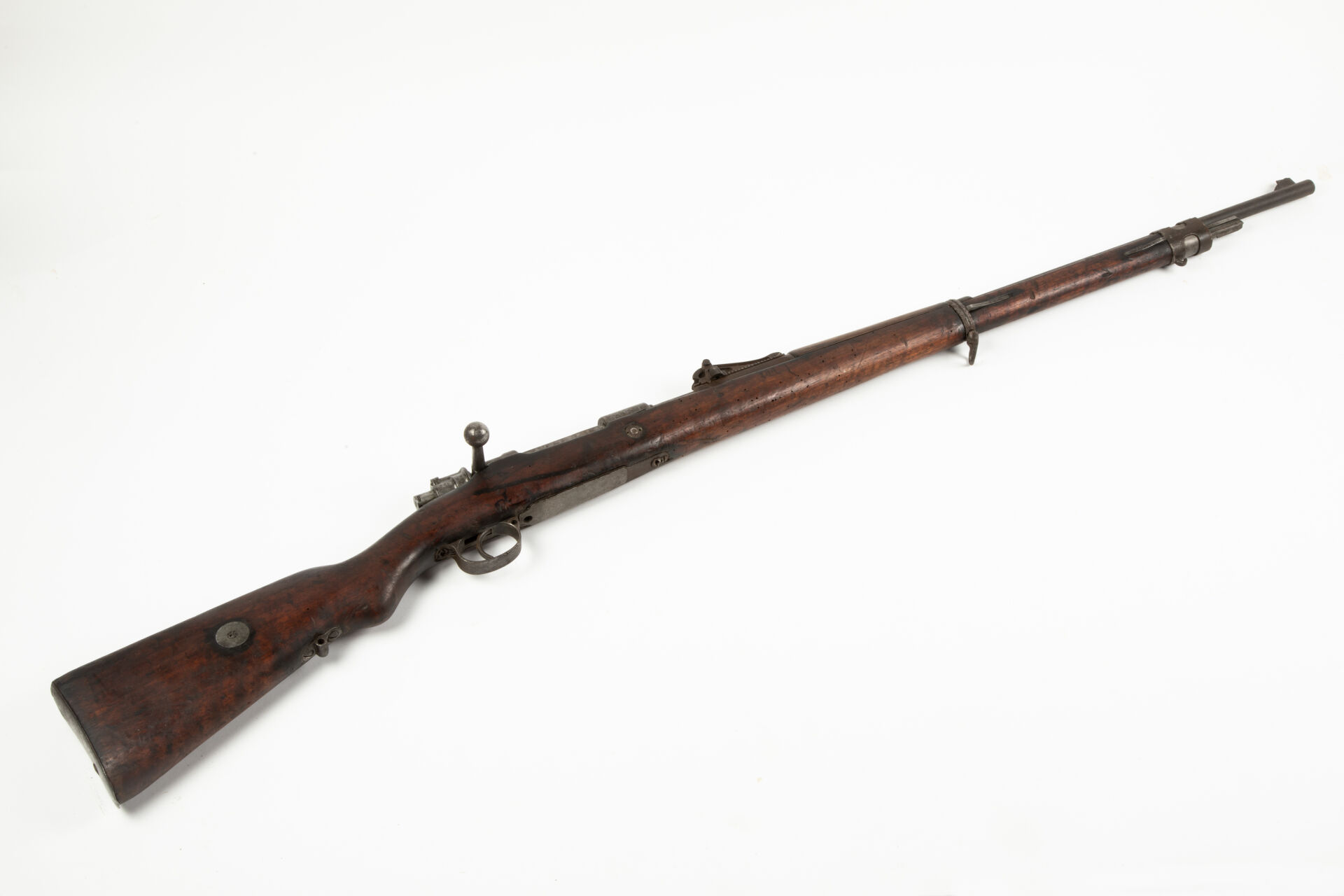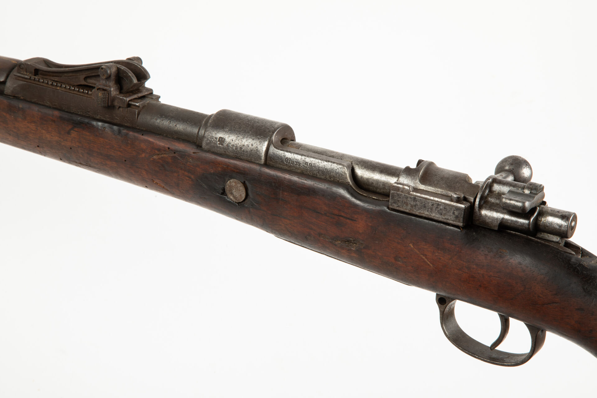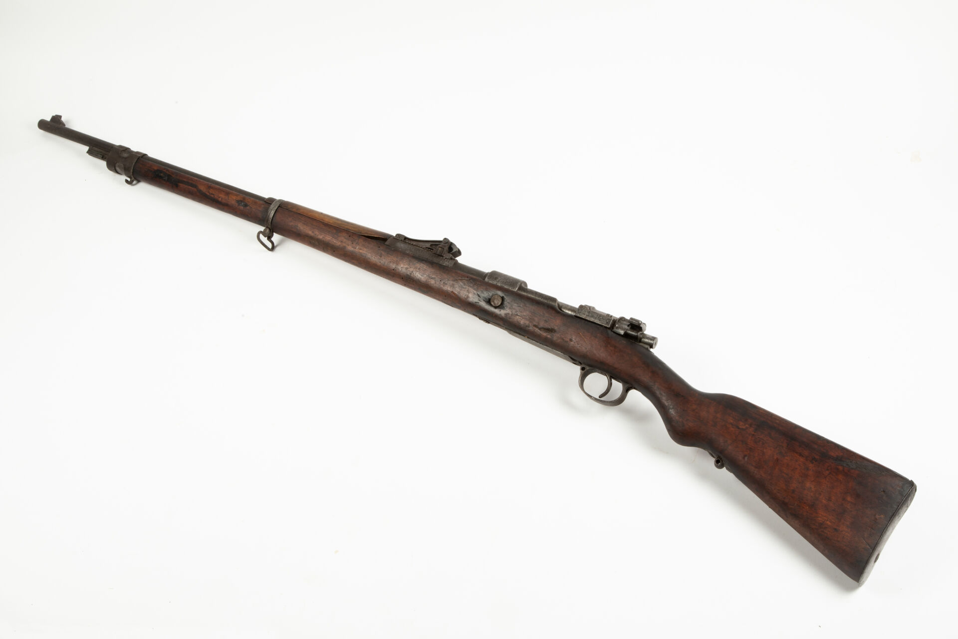 Rare fusil règlementaire Allemand Mauser G98, première année de fabrication (1899) issu de l’Arsenal D.W.M. Canon modifié « S », hausse commencant à 200 m. Arme non monomatricule, quelques impacts dans la crosse (éclats d’obus). Les deux vis de sou-garde ont été repercées. Peau d’orange généralisée. Malgré son état ce fusil reste assez convoitable vu la précocité de sa fabrication.