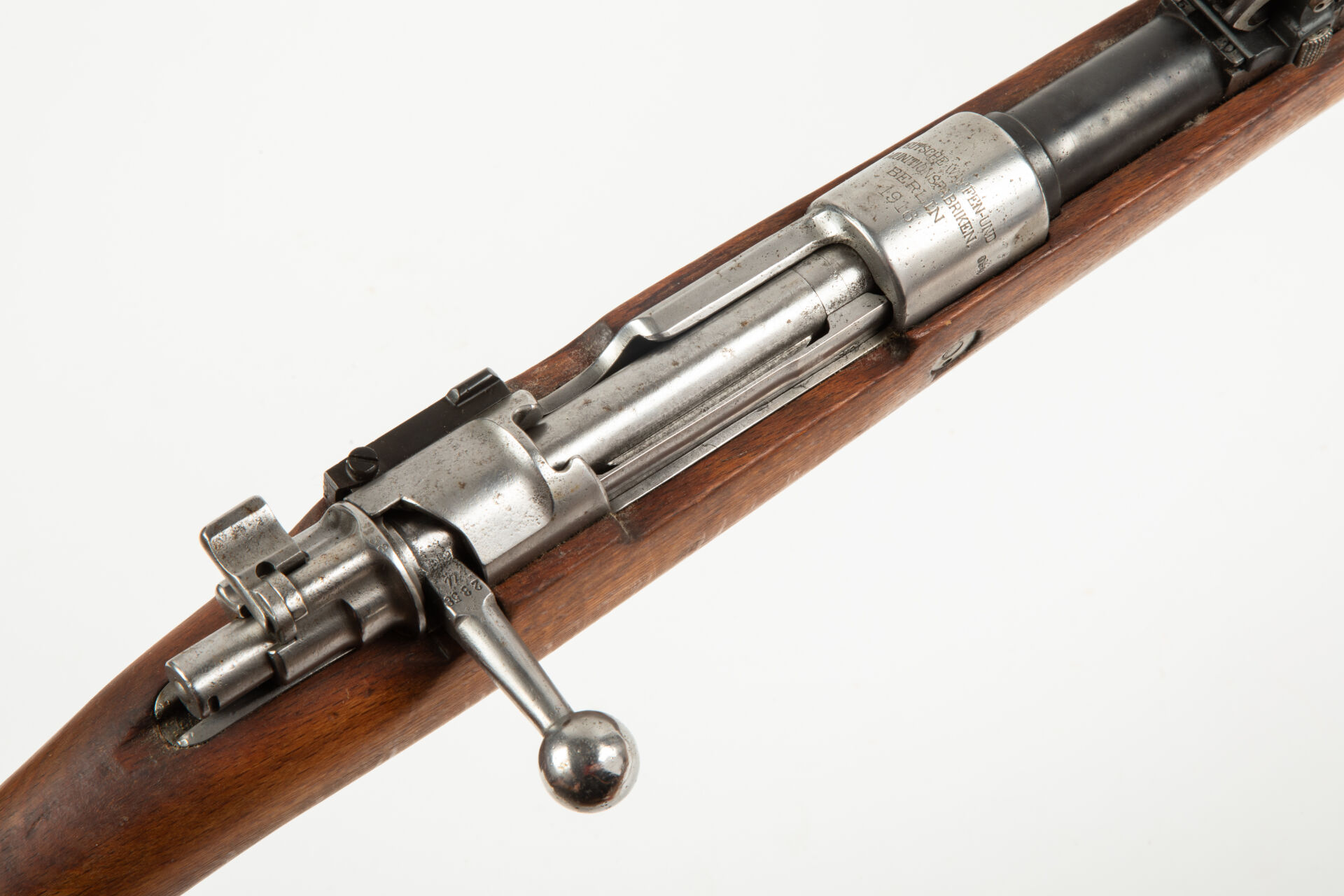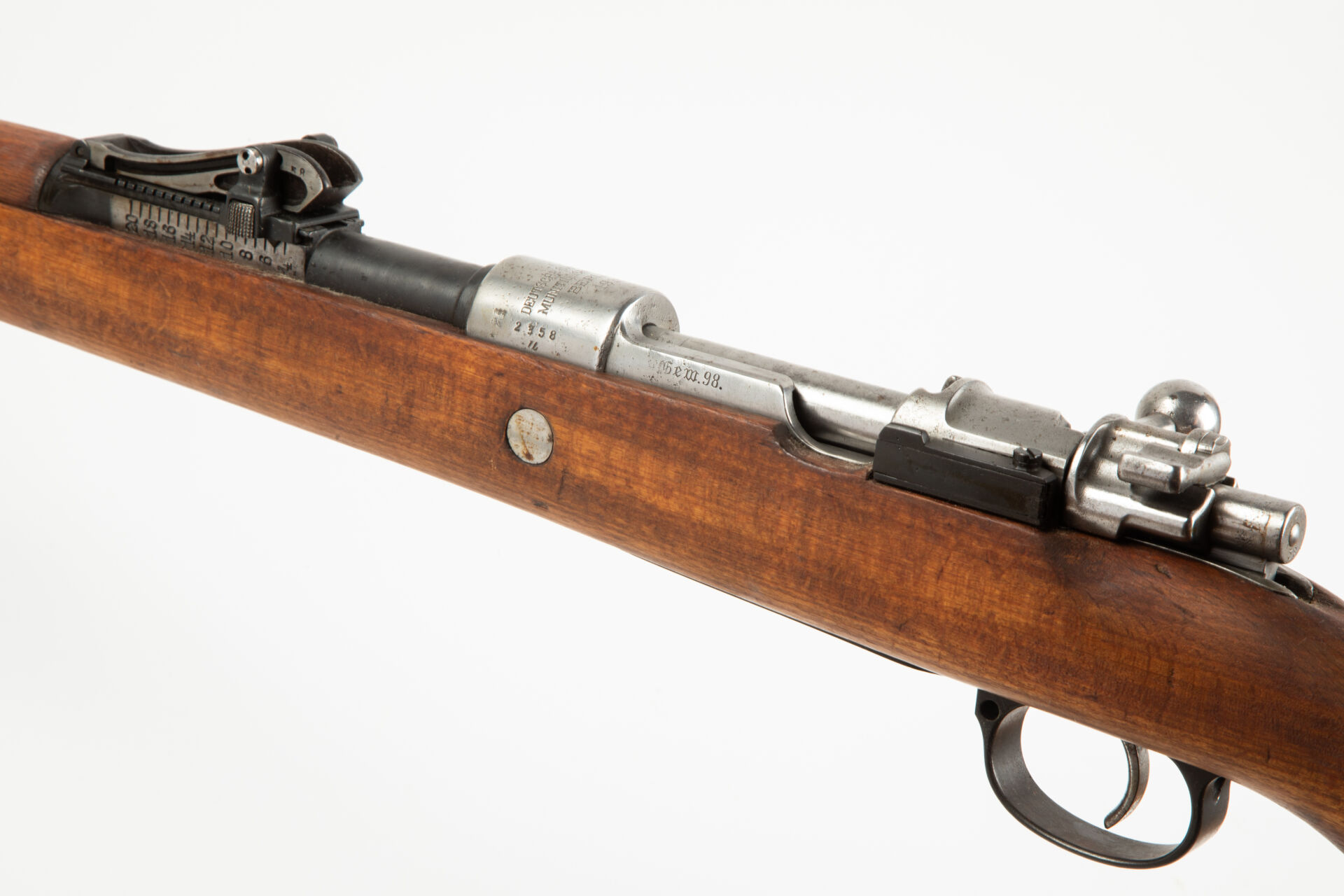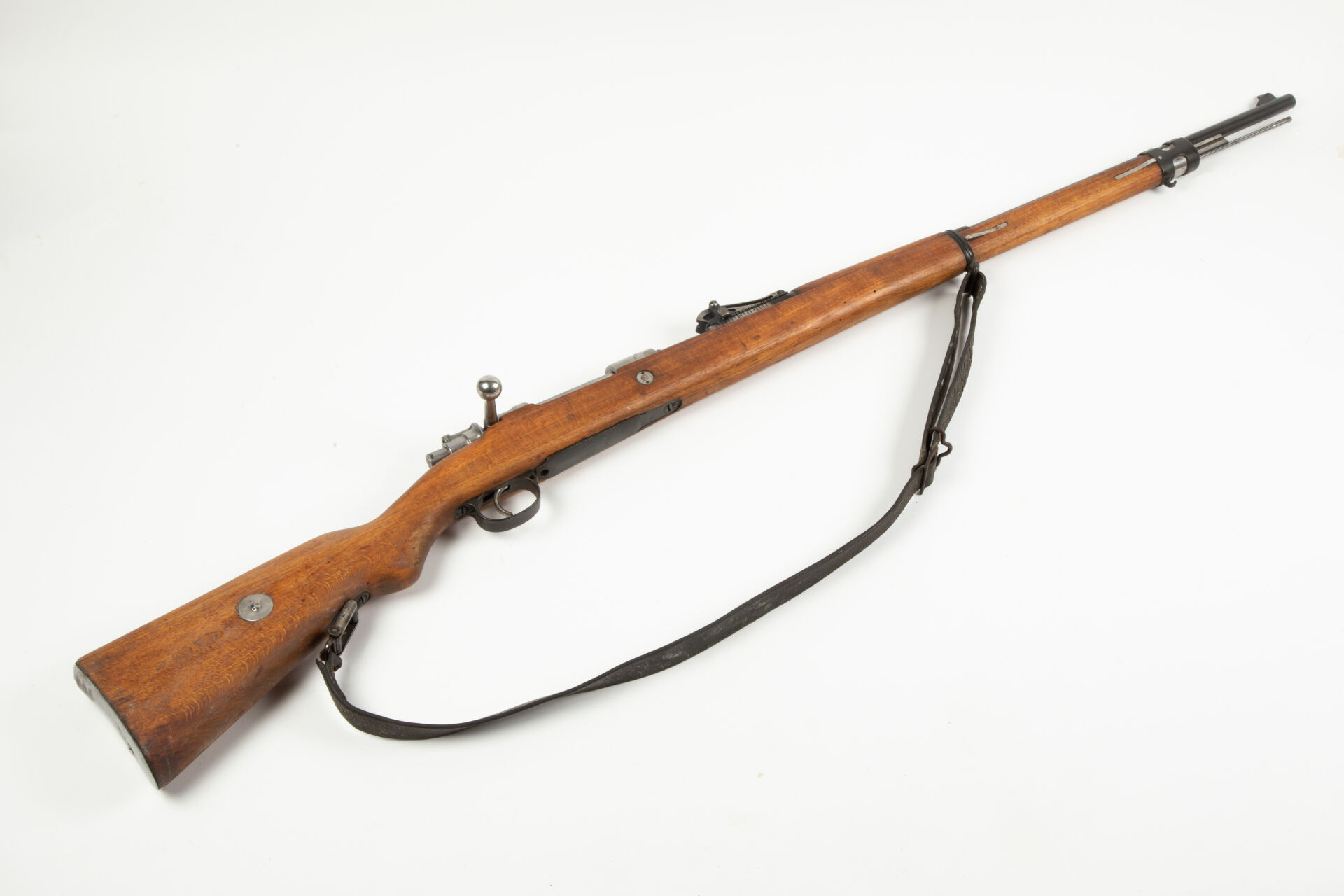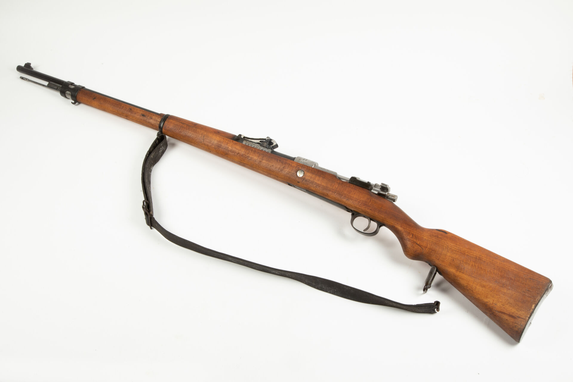 Fusil règlementaire Allemand Mauser G98, fabrication D.W.M. 1916. Hausse commençant à 400 m, quelques pièces non au numéro. Arme rebronzée avec bretelle cuir incomplète. Très bon canon pour le tir.