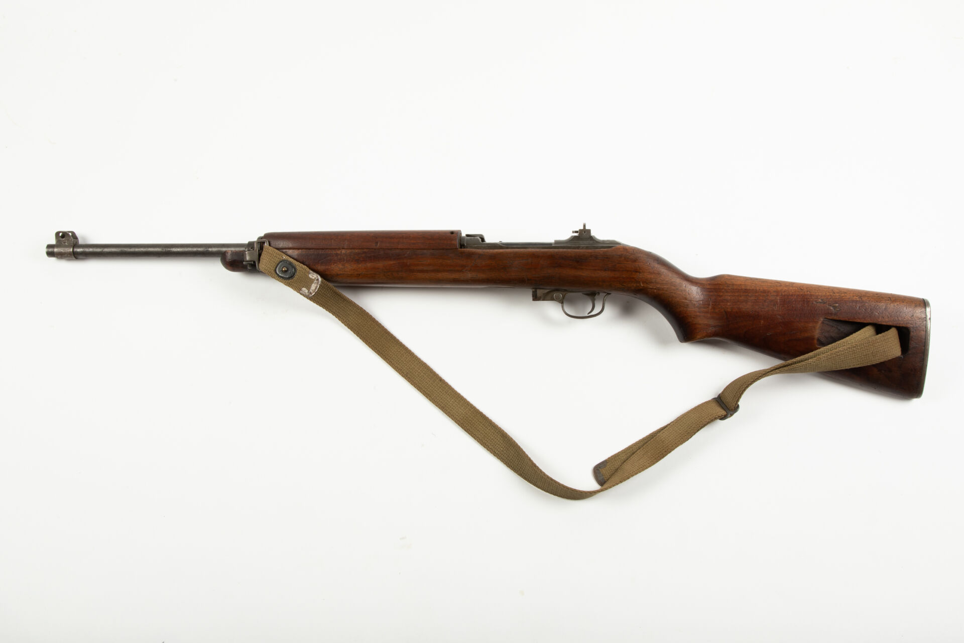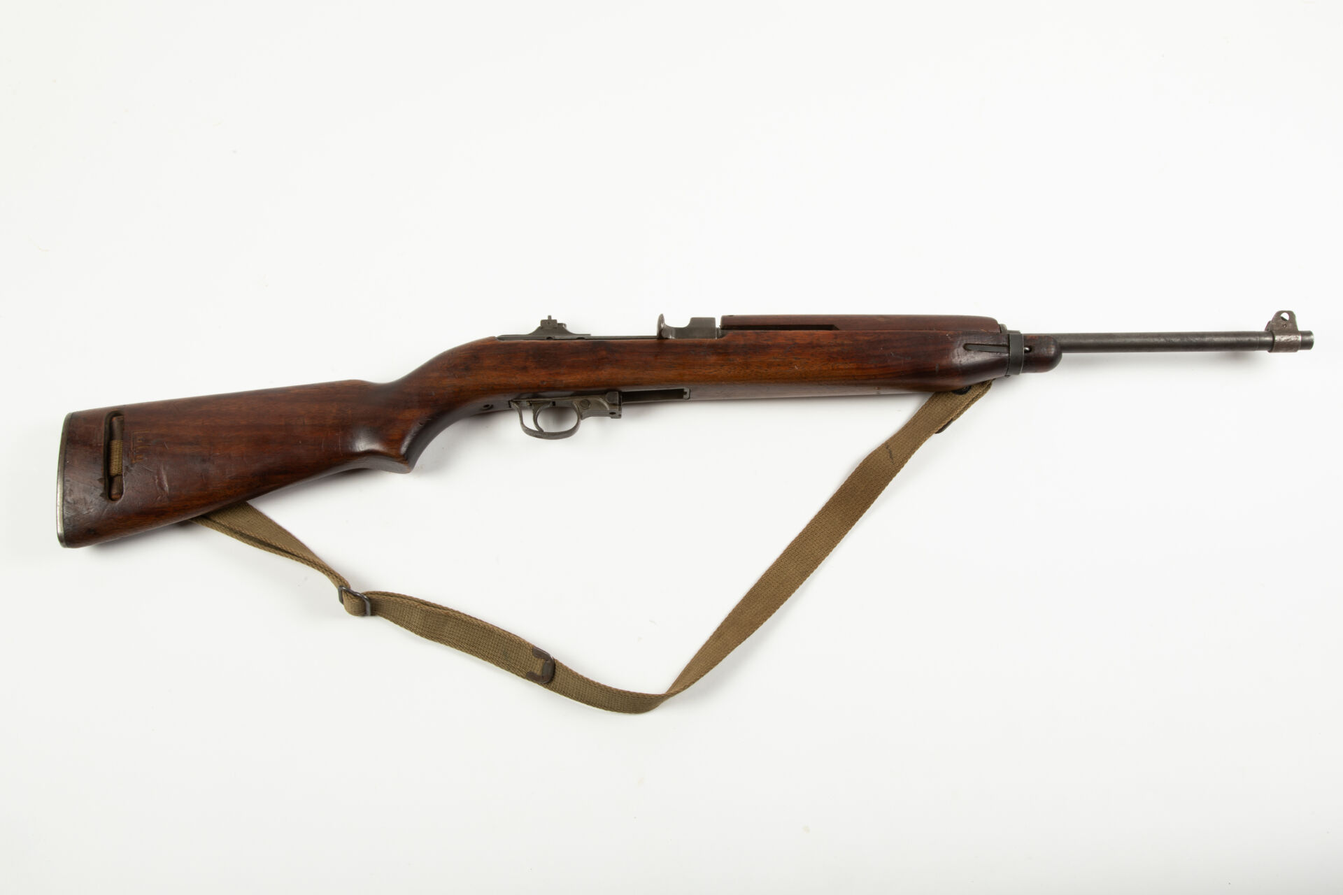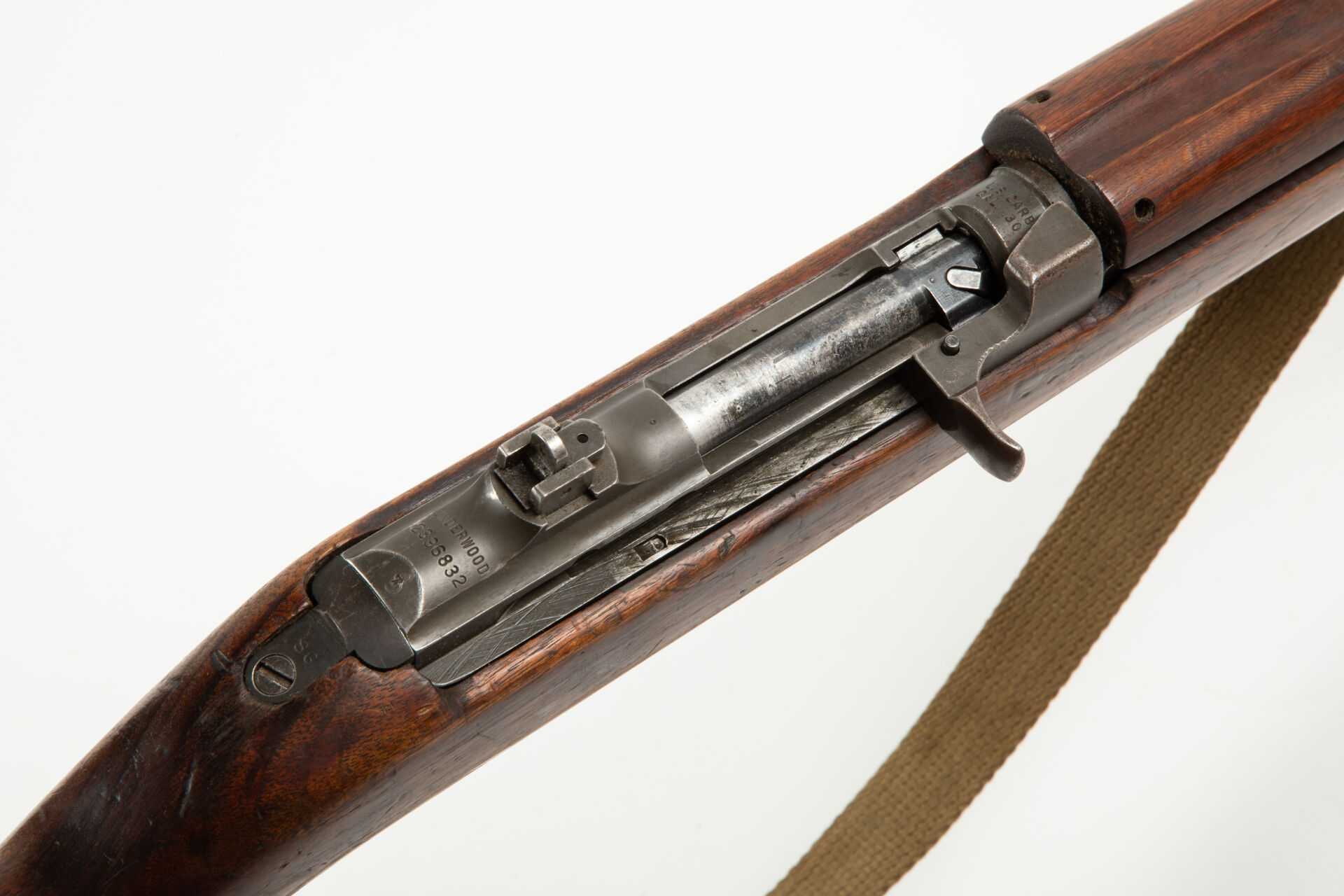 Carabine semi-automatique US-M1, calibre 30 M1, fabrication Underwood, canon underwood daté 11-42, réception à la grenade, culasse ronde, hausse premier type, poussoir de sureté traversant lisse, pontet soudé arrêtoir de magasin non marqué « M », crosse low wall, logement de bretelle ovale, marquage gravé au niveau du logement de l’huilier « Lulu », huilier de retenue de bretelle remplacé par un morceau de bois, crosse réceptionnée à la grenade et lettres « SG » dans un rectangle avec un chargeur 15 coups bronzé marqué « SI ». Carabine avec sa brettelle, mécanisme phosphaté, très bon canon pour le tir, mécanisme fonctionnel.