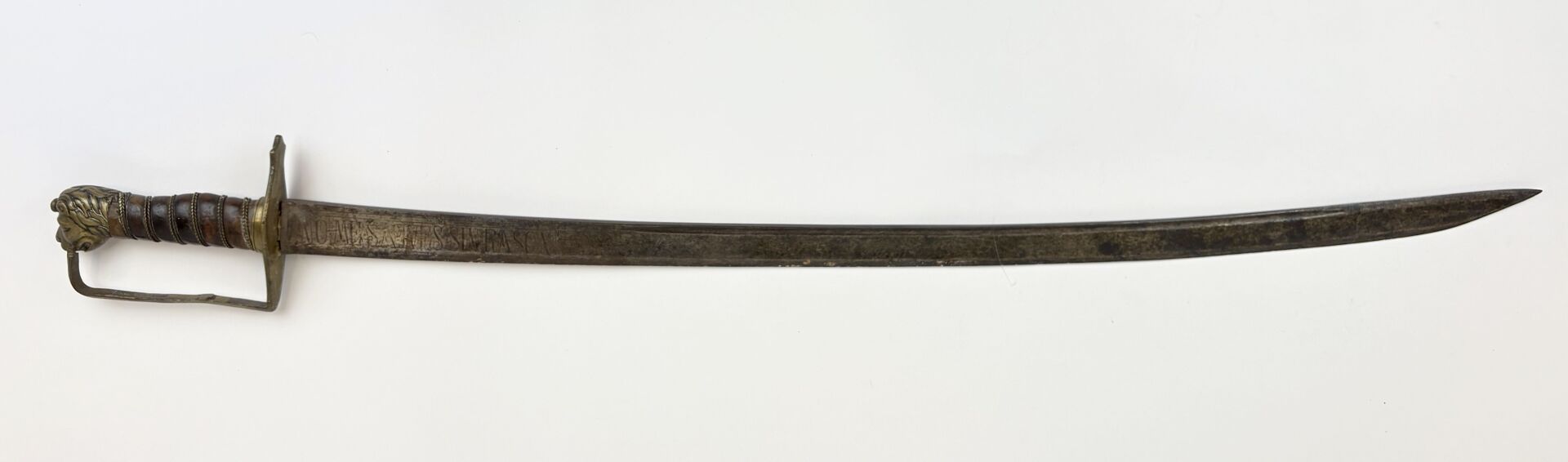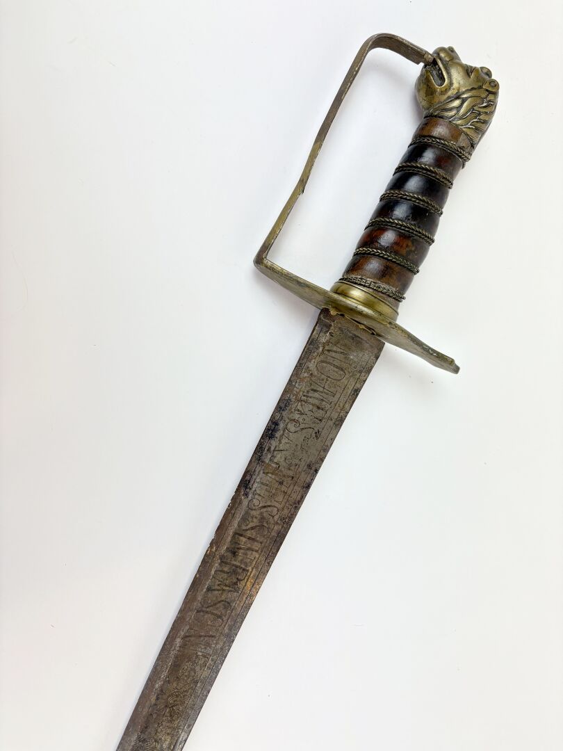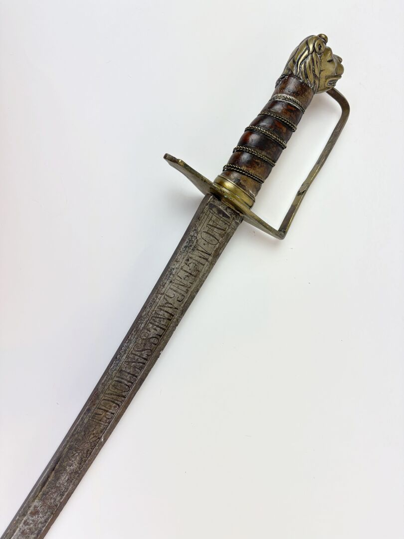 Court sabre d’Infanterie, lame à la Montmorency, large gorge portant en belles lettres la devise « No me saques sin rason » sur une face avec trophées de chasse et « No me engaines sin honor » sur l’autre face. Dos plat surligné d’une fine gouttière, monture bronze, pommeau léonin, branche de garde unique biseautée joignant à angle droit le plateau, quillon trilobé plat, fusée bois gainée de chagrin et ornée d’un filigrane laiton en double chevron. Pas de fourreau. Garde à refixer.