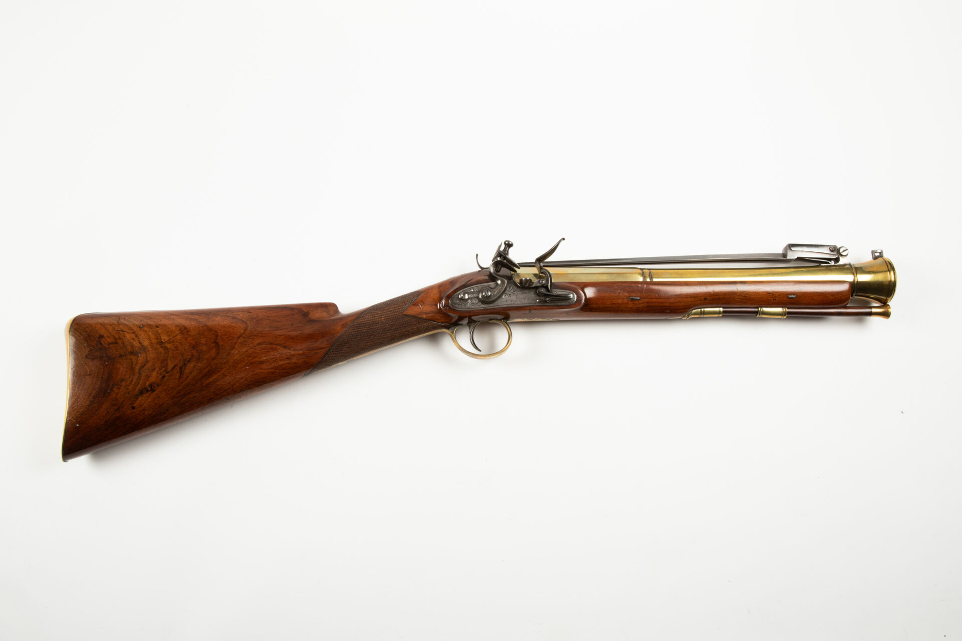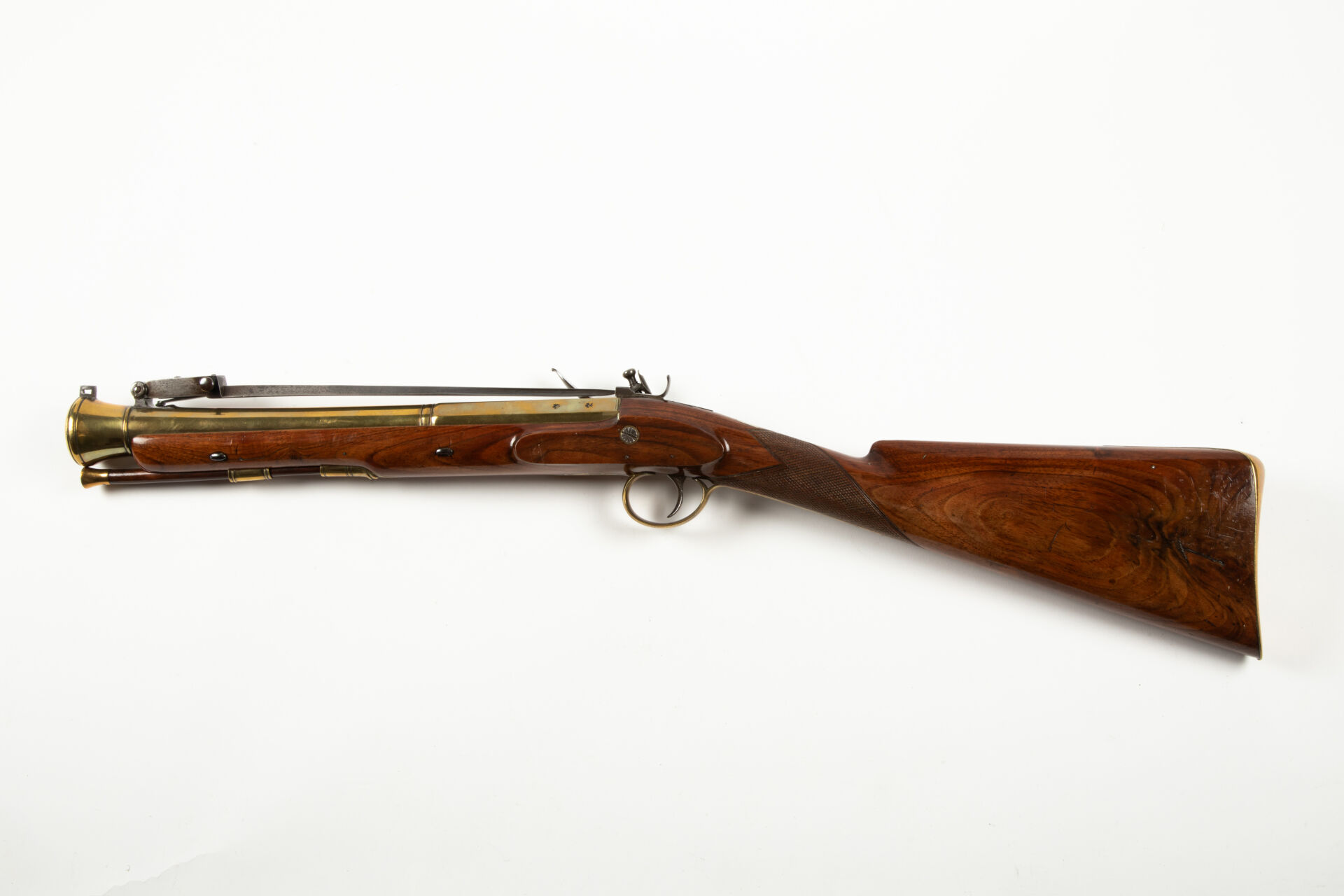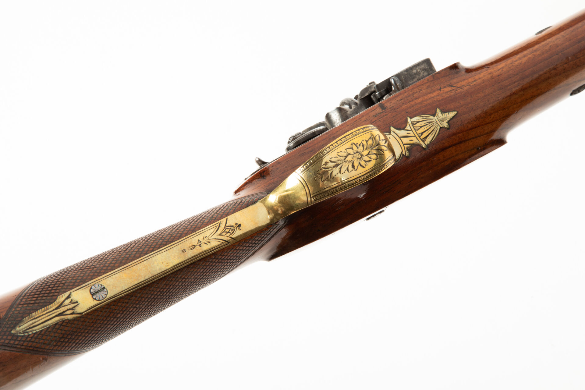 Monture en noyer, poignée quadrillée, pièce bronze de pouce non gravée. Garnitures bronze gravées de motifs floraux. Baguette bois terminée par une pièce de laiton tulipée.