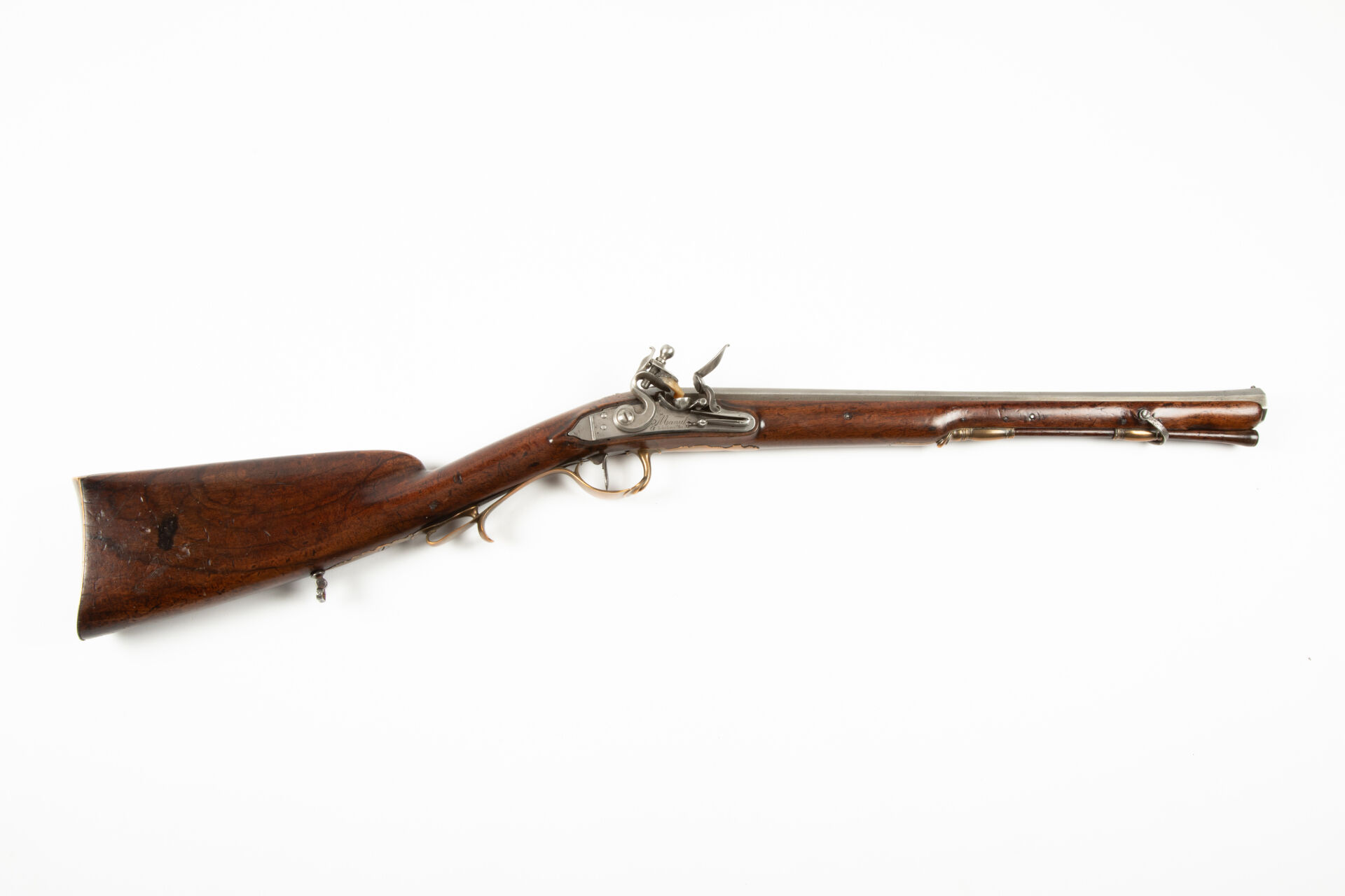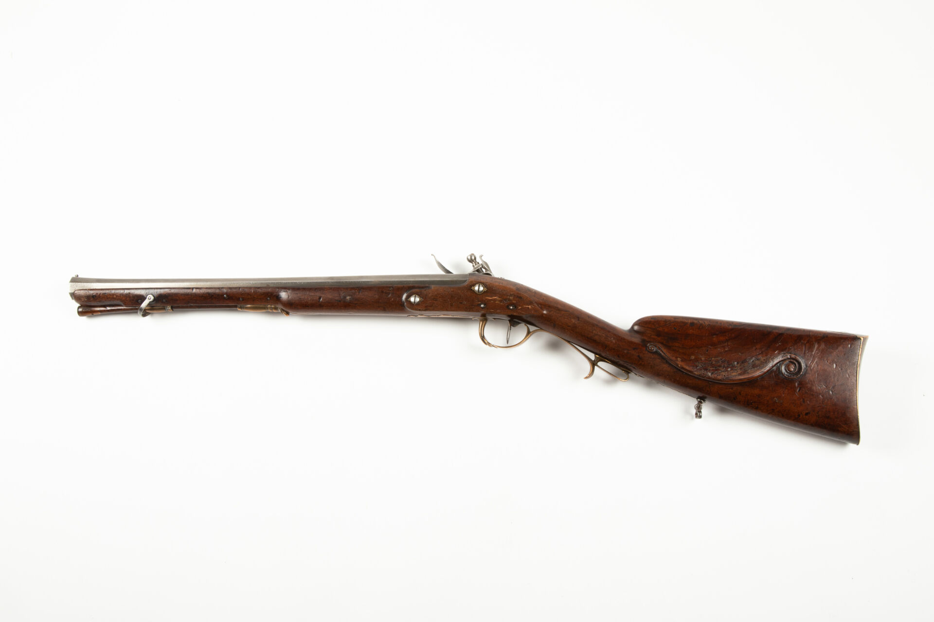 Belle carabine à silex dans le gout de la carabine de Versailles modèle 1793, canon octogonal légèrement évasé à la bouche au calibre de 14 mm, 48 rayures cheveux, longueur de 416 mm. Corps de platine plat, chien col de cygne (postérieur). Corps de platine marqué « Manuf. a Versailles ». Bassinet waterproof postérieur, batterie à rouleau postérieure. Ressort de batterie vissé de l’intérieur, toutes garnitures laiton, pontet à repose paume. Baguette bois à embout corne, crosse en noyer vernis dont le fût se prolonge jusqu’à la bouche, joue terminée en volutes à gauche, plaque de couche en laiton à retour découpé. Mécanisme fonctionnel. Course du chien trop courte.