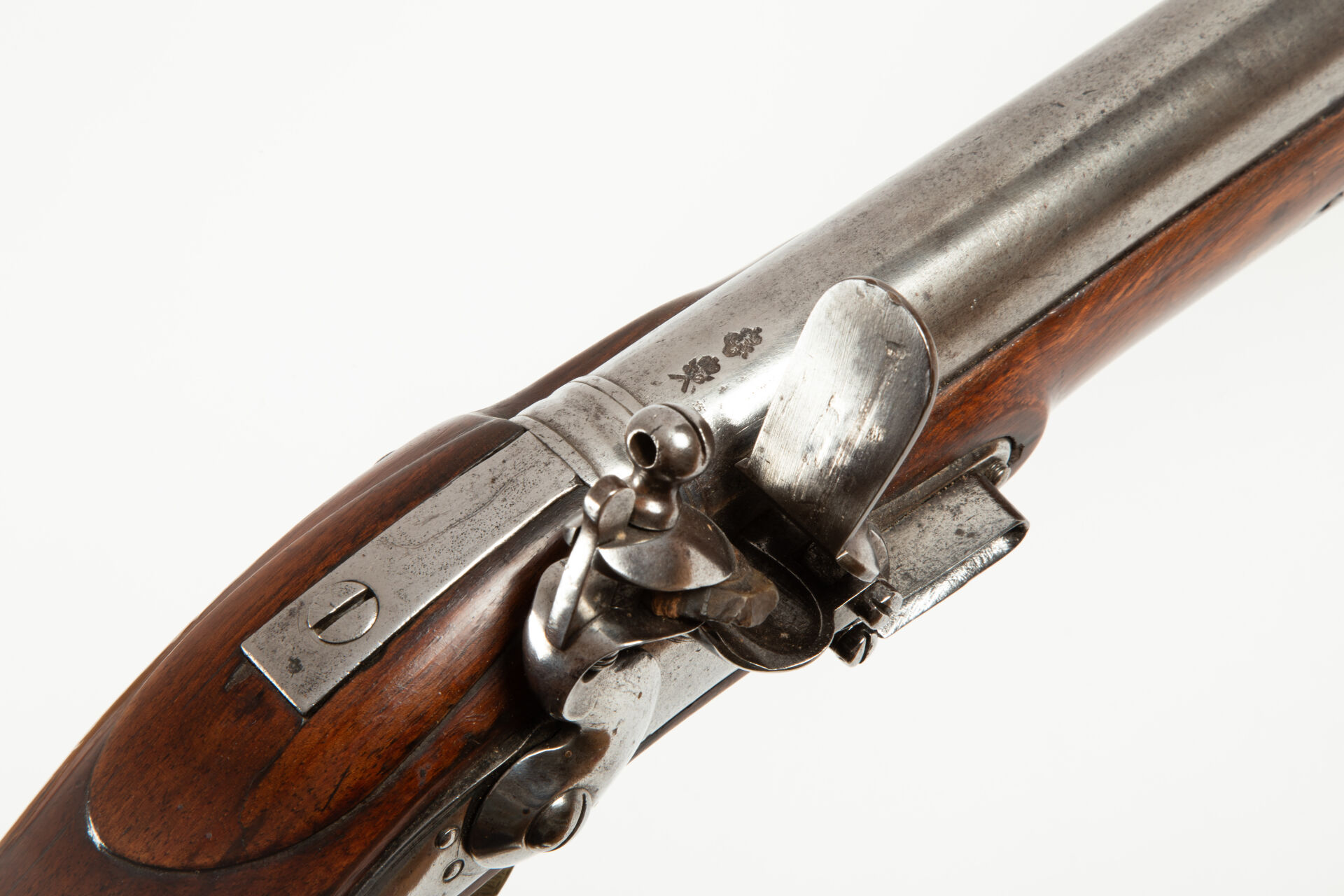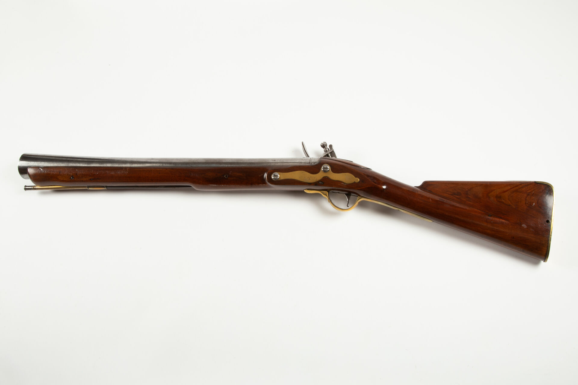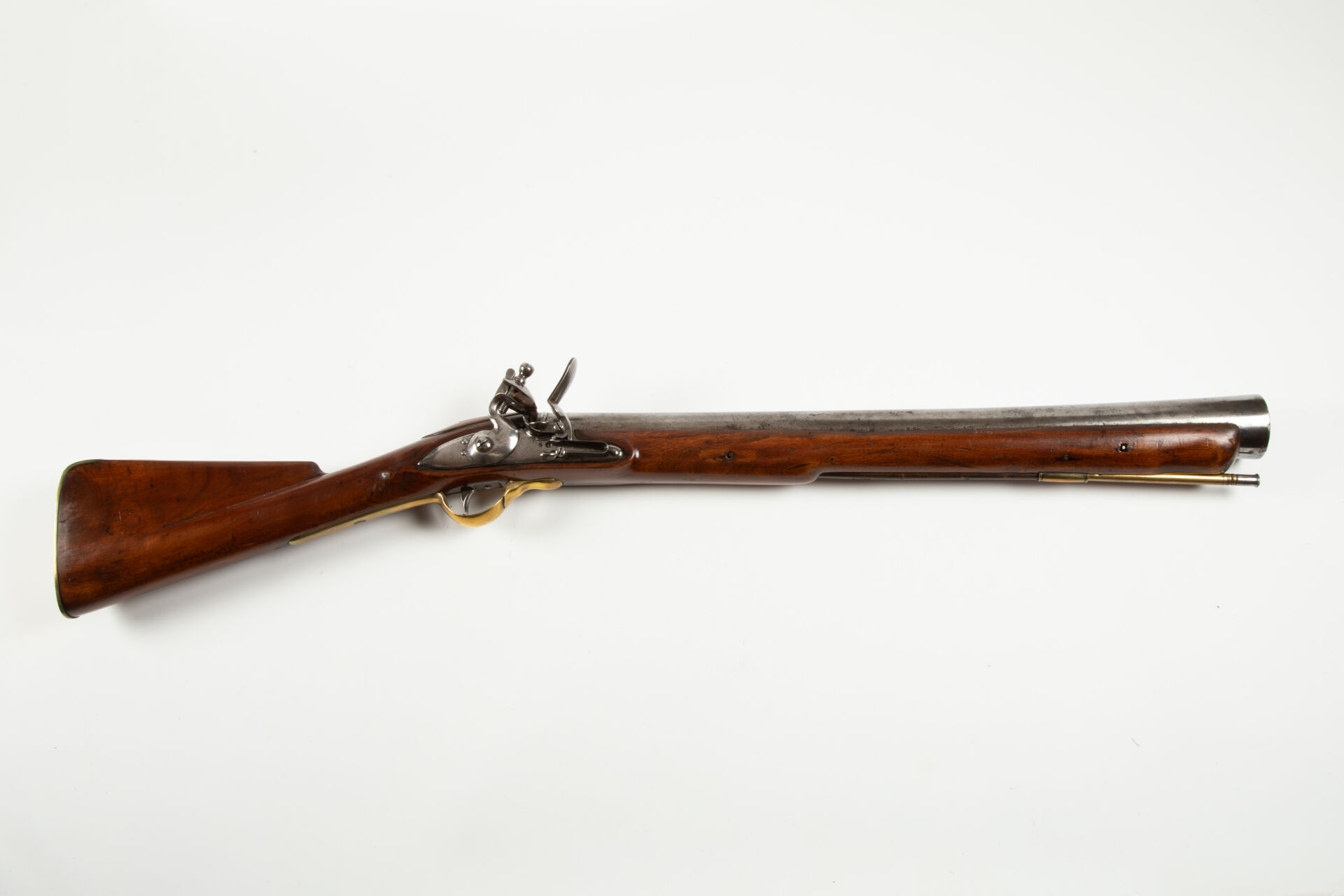 Fort tromblon à silex britannique, canon très étoffé en fer cylindrique légèrement évasé à la bouche, queue de culasse rectangulaire, deux poinçons britanniques au tonnerre, platine à corps rond, fort chien col de cygne renforcé, bassinet fer venu de forge, ressort de batterie vissé de l’intérieur, toutes garnitures laiton, contre-platine ondoyante, plaque de couche plate, monture en noyer vernis se prolongeant jusqu’à la bouche, canon retenu sur cette dernière par des goupilles (2). Baguette à long embout fer et virole laiton. Bouche de 40 mm. Mécanisme fonctionnel