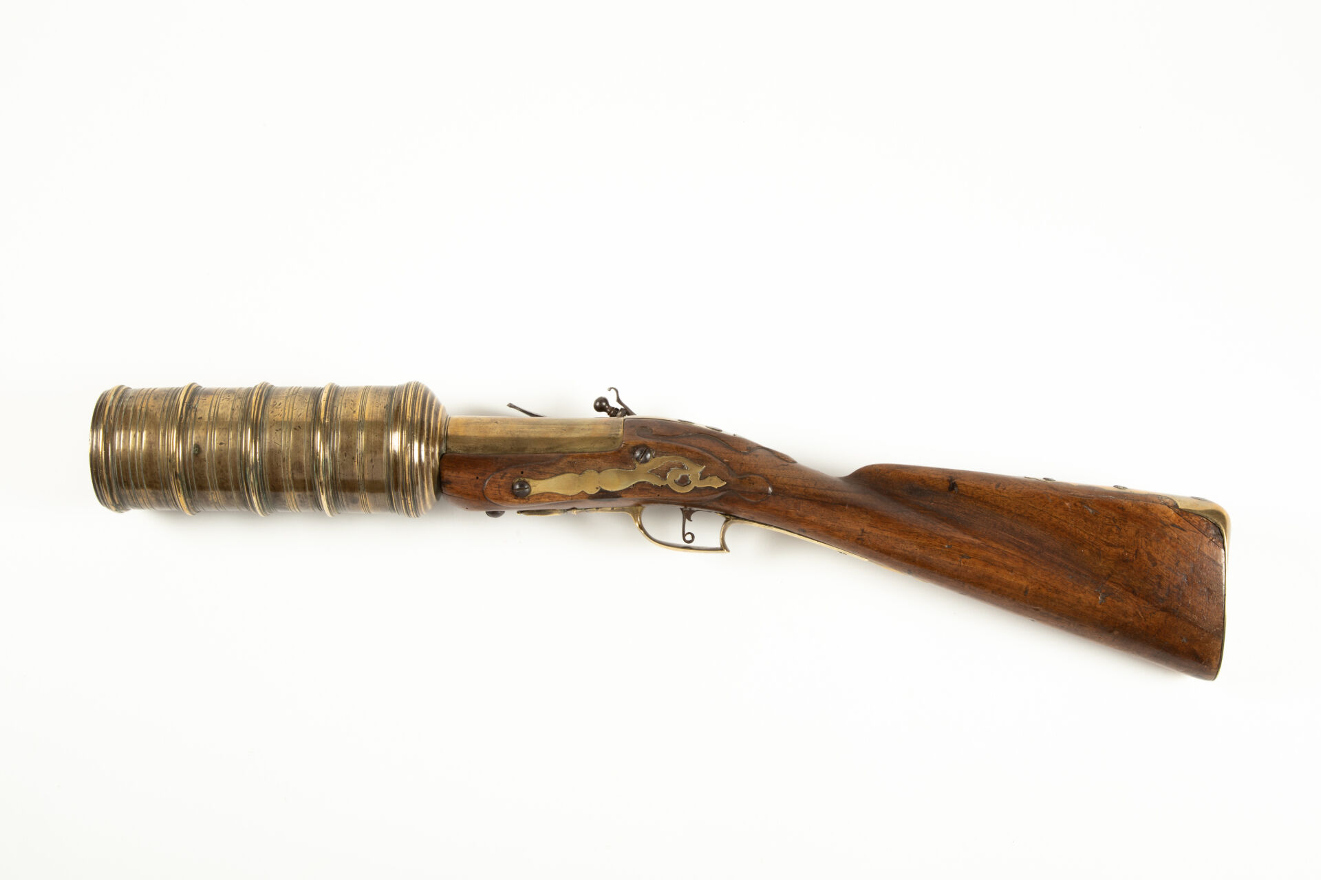 Important lance grenade à silex, canon bronze pot lance grenade cylindrique usiné dans la masse au calibre de 70 mm. Le pot est orné de cinq bourrelets de renfort. Queue de culasse triangulaire assujettie à la monture par deux vis, belle platine à corps plat, bassinet fer à pans venu de forge, ressort de batterie vissé de l’intérieur, chien col de cygne plat. Détente à terminaison enroulée, toutes garnitures laiton, la mise en bois des garnitures (contre-platine, queue de culasse et platine) est surlignée d’une larme. Plaque de couche en laiton à long retour, arme très imposante et surdimensionnée dans le but d’absorber le recul monstrueux que génère l’expulsion d’un projectile d’un tel poids. Monture fendue légèrement dans le prolongement du retour de la plaque de couche, enture légère et discrète au flanc gauche en haut de la plaque de couche. Mécanisme fonctionnel.