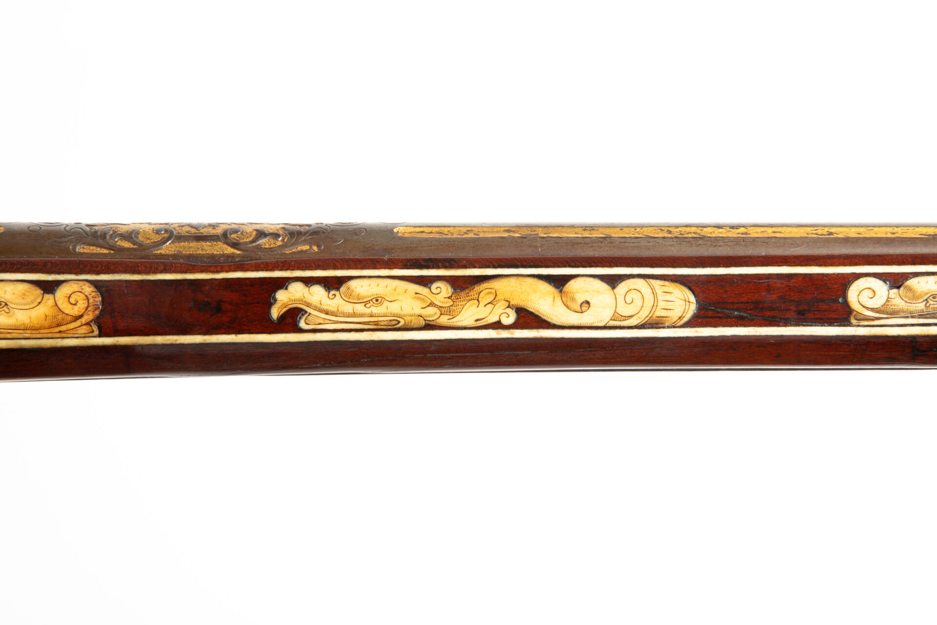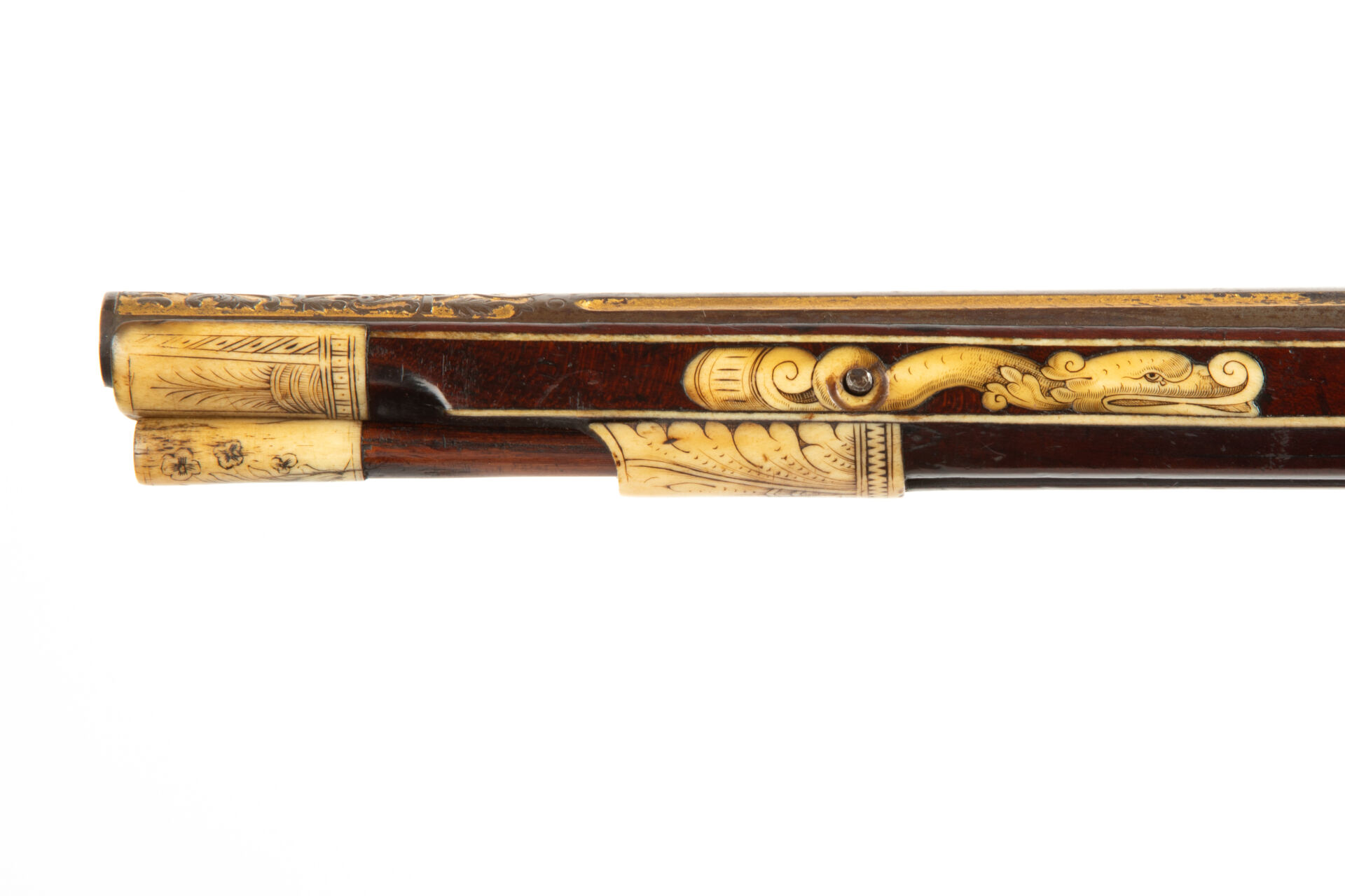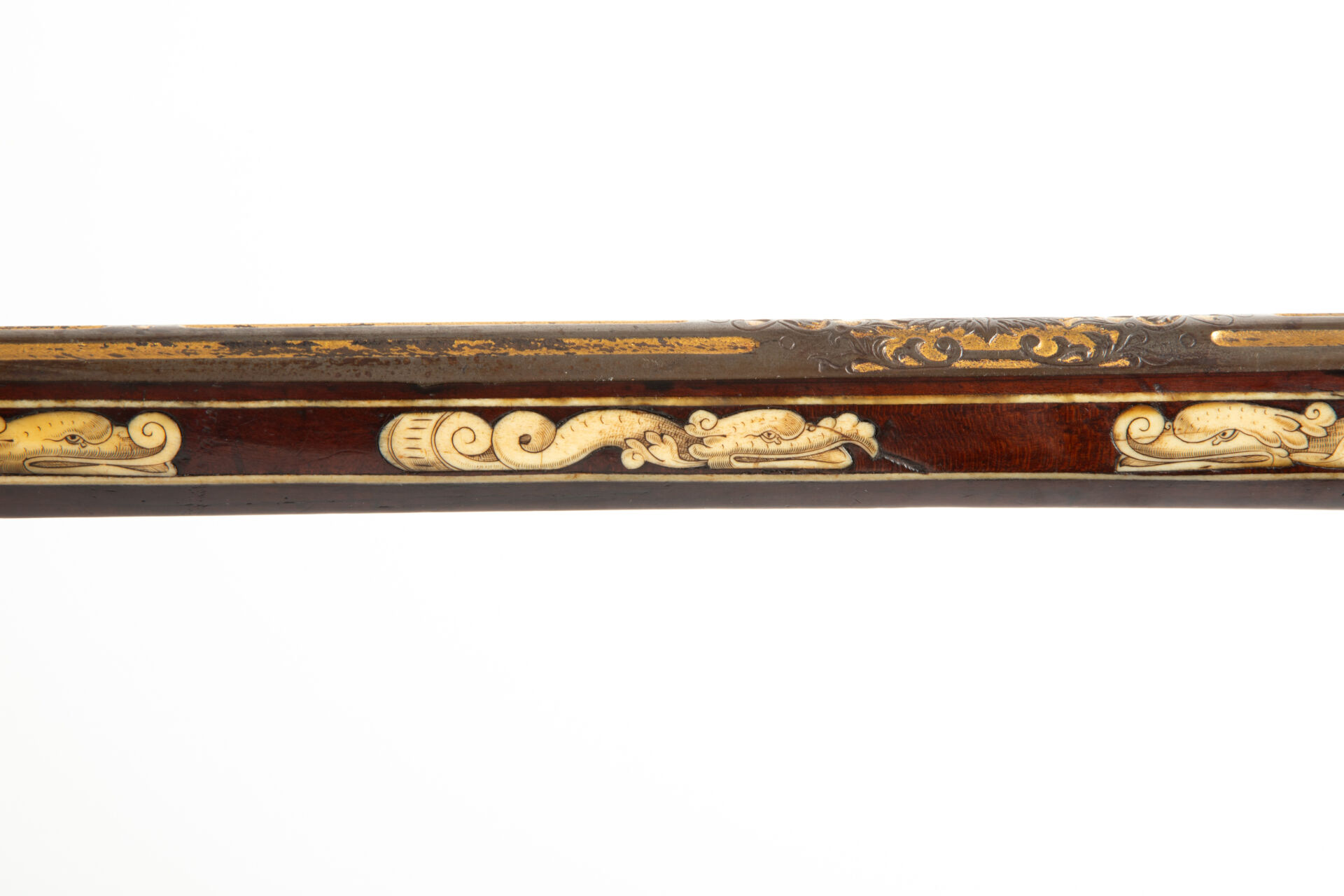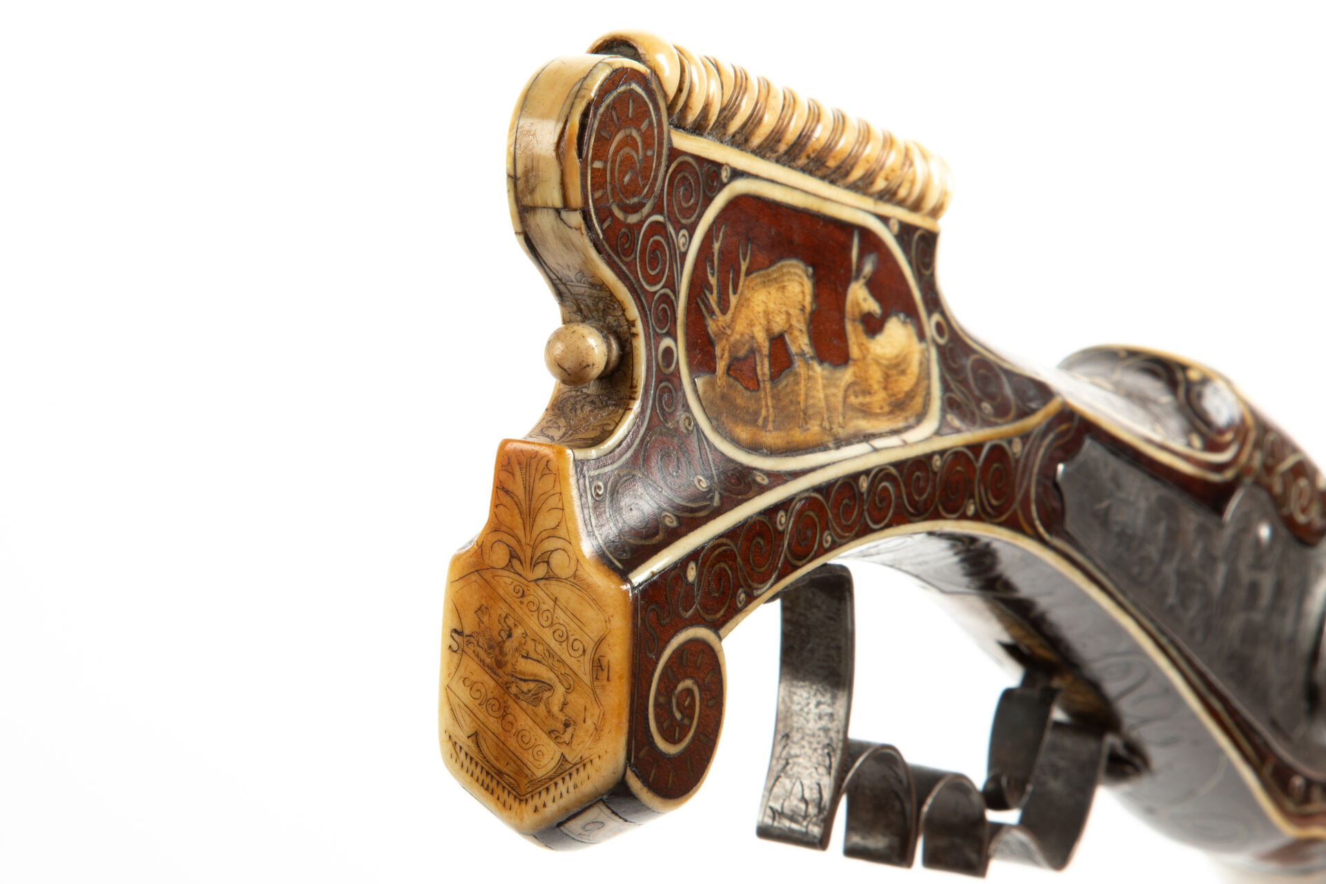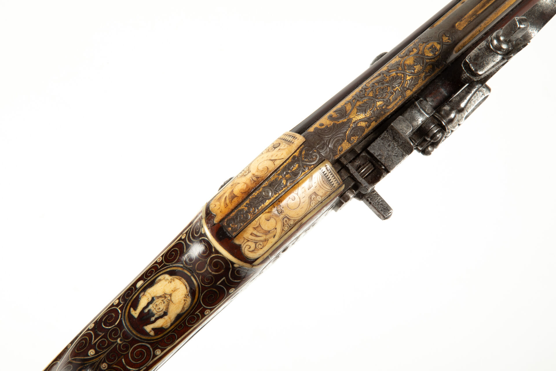Les armes de prestige munichoises du début du XVIIème siècle sont célèbres pour le raffinement de leurs décors. La gravure en relief à fond d’or du canon est typique de cette production d’élite. Hieronymus Borstorffer (actif entre 1597 et 1637), travaillant en collaboration avec de grands fabricants tels Daniel Sadeler (actif entre 1602 et 1632) ou Caspar Sät (vers 1611-1691) fut l’un des plus fameux artistes spécialisés dans l’incrustation d’ivoire sur les armes destinées non seulement aux princes électeurs de Bavière, mais également aux cours européennes. L’utilisation d’ivoire de morse est très intéressante car rare dans la production. elle peut s’expliquer notamment par la présence de l’animal sur les côtes Nord du Pays ainsi que par les rapports entre les principautés germaniques et les royaumes scandinaves du Nord.