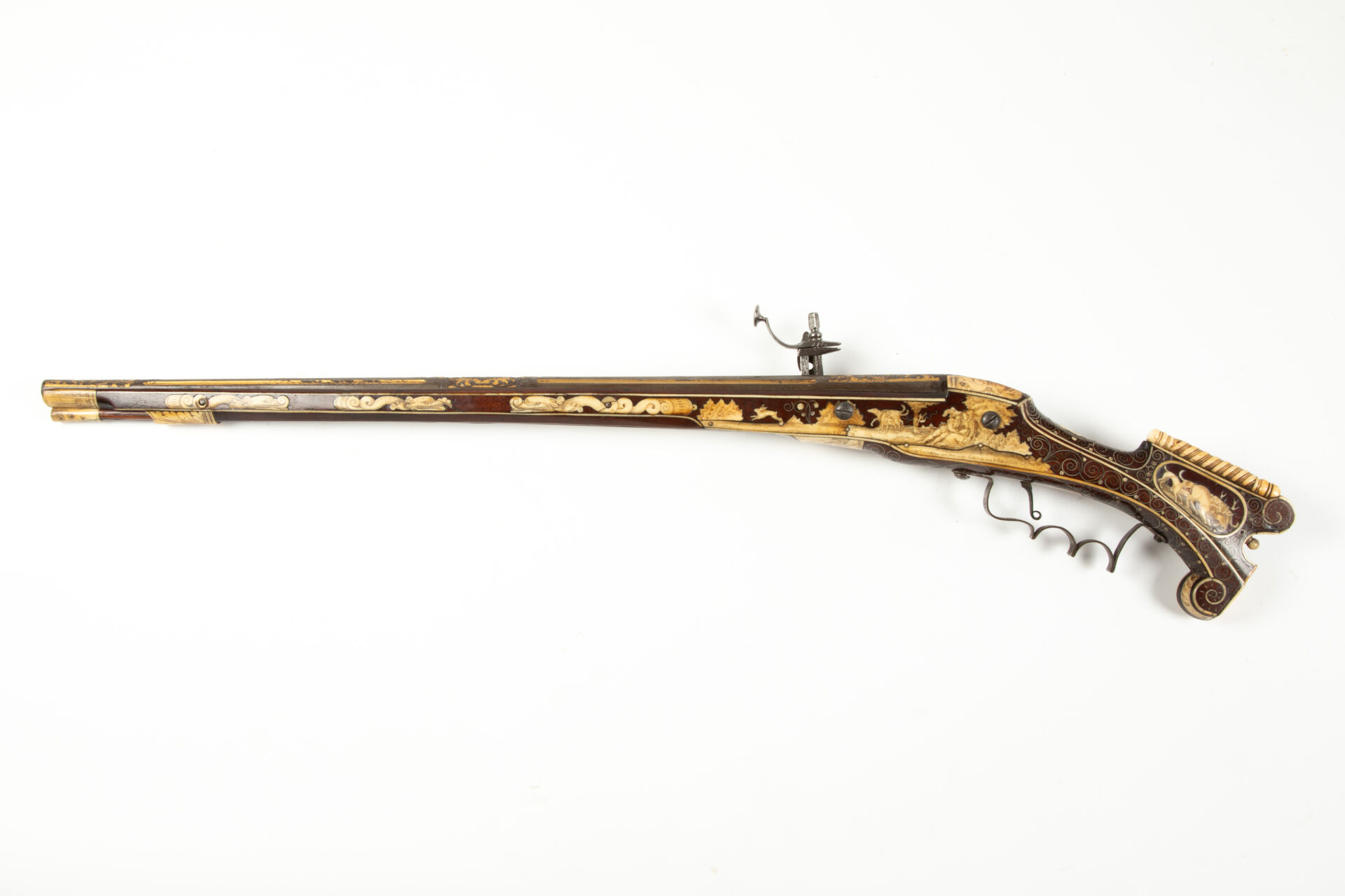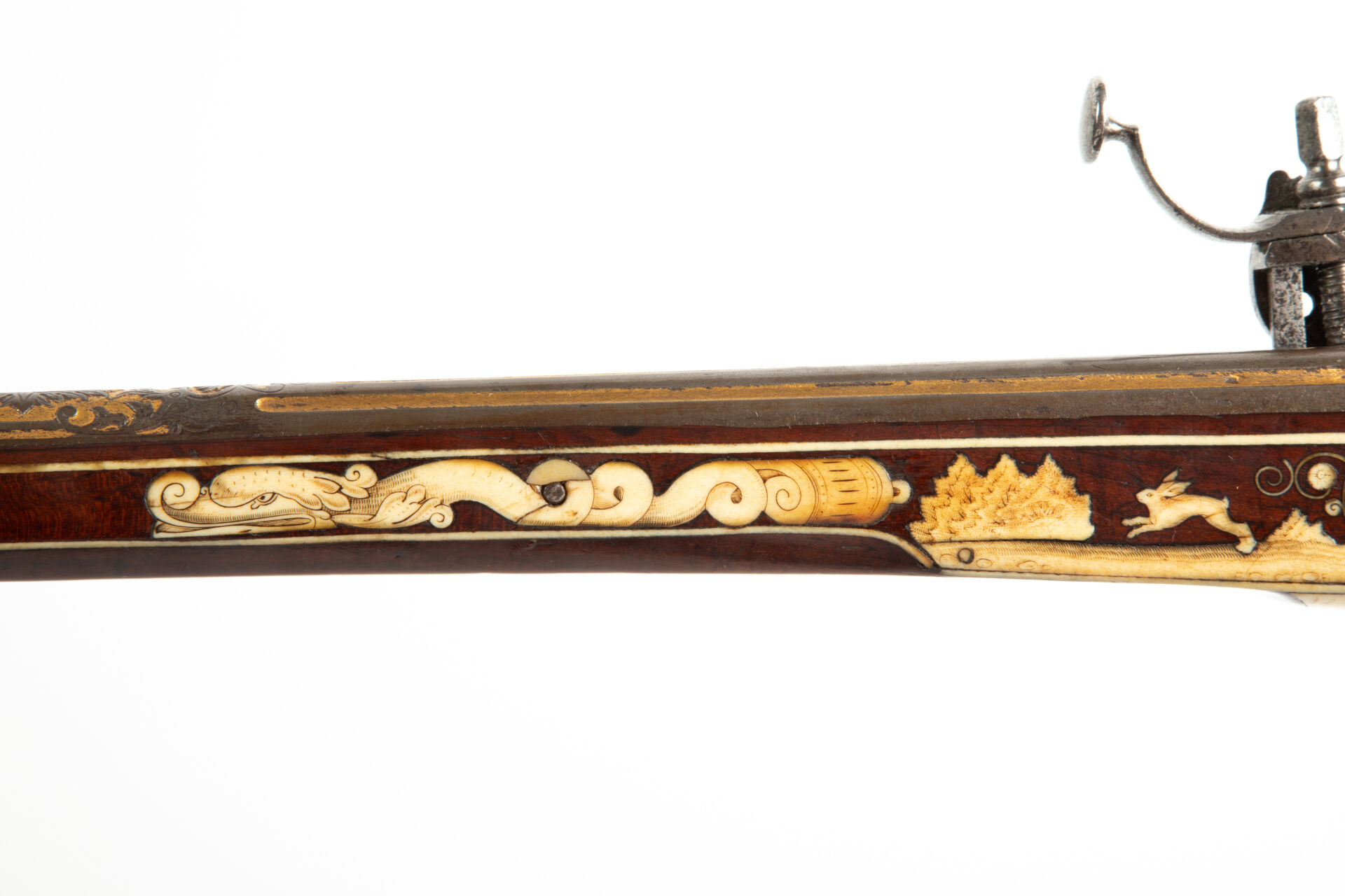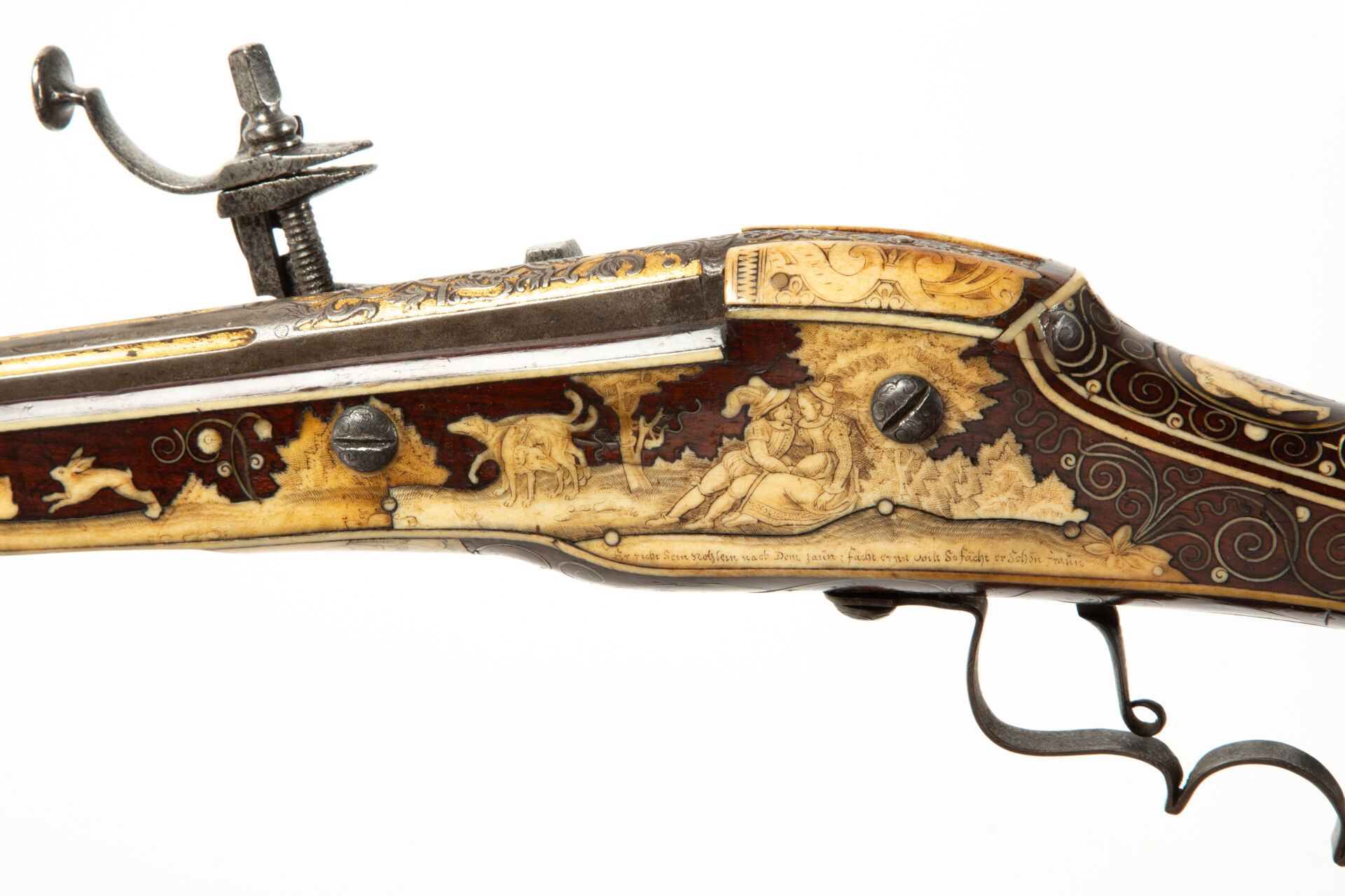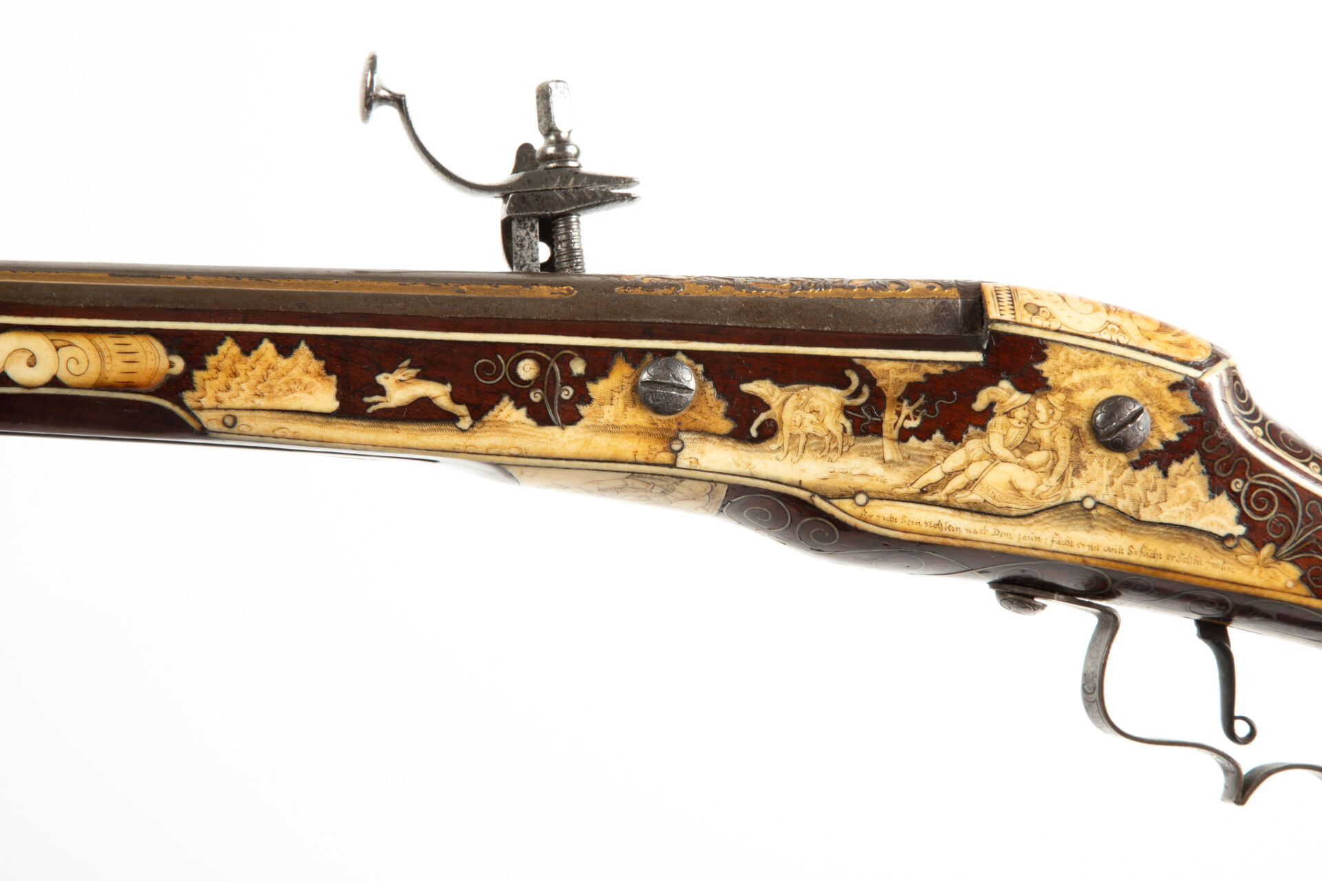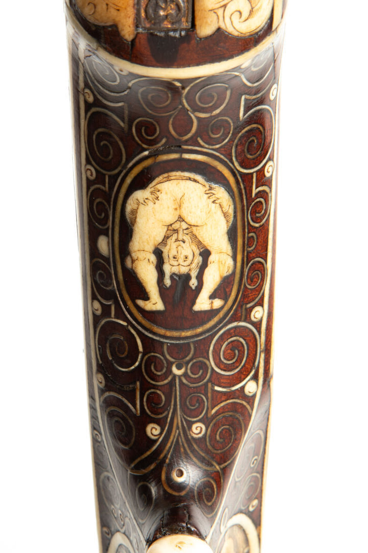 Sur les flancs de la crosse à droite cerf et biche au repos, à gauche cerf et chiens de meute affrontés. La pièce de pouce représente une polissonnerie sous la forme d’un personnage épicurien vu de dos d’une grande souplesse. A l’emplacement de la contre-platine, une plaque d’ivoire de morse représente un chasseur lutinant sa compagne adossée à un buisson, ses chiens attachés à un arbre, regardent, désespérés un lièvre s’enfuir, le texte suivant à la base complète la scène « Er richt reklein nach dem faun ernst noilt so facht er schon fraun ». Les goupilles de crosse sont habillées d’incrustations de serpents de mer lovés et affrontés, des entrelacs incrustés également en ivoire de morse, décorent tous les plats de la monture sauf le fût de l’arme. Une très belle plaque gravée selon la technique du schrimshaw montre un chasseur musicien armé de son coutelas et d’une cabrette discutant avec une servante d’auberge dont la main tient un pot de bière. Détente directe, pontet à repose doigts, la crosse au niveau de la plaque de couche est enroulée en volutes supérieures et inférieures, le centre est concave et l’emplacement du dos de la crosse est habillé par un cylindre rappelant un bâton de maréchal en ivoire de morse massif à décor spiralé. Baguette bois à embout en ivoire de morse postérieure (d’un plus gros diamètre que l’âme du canon). Mécanisme fonctionnel.