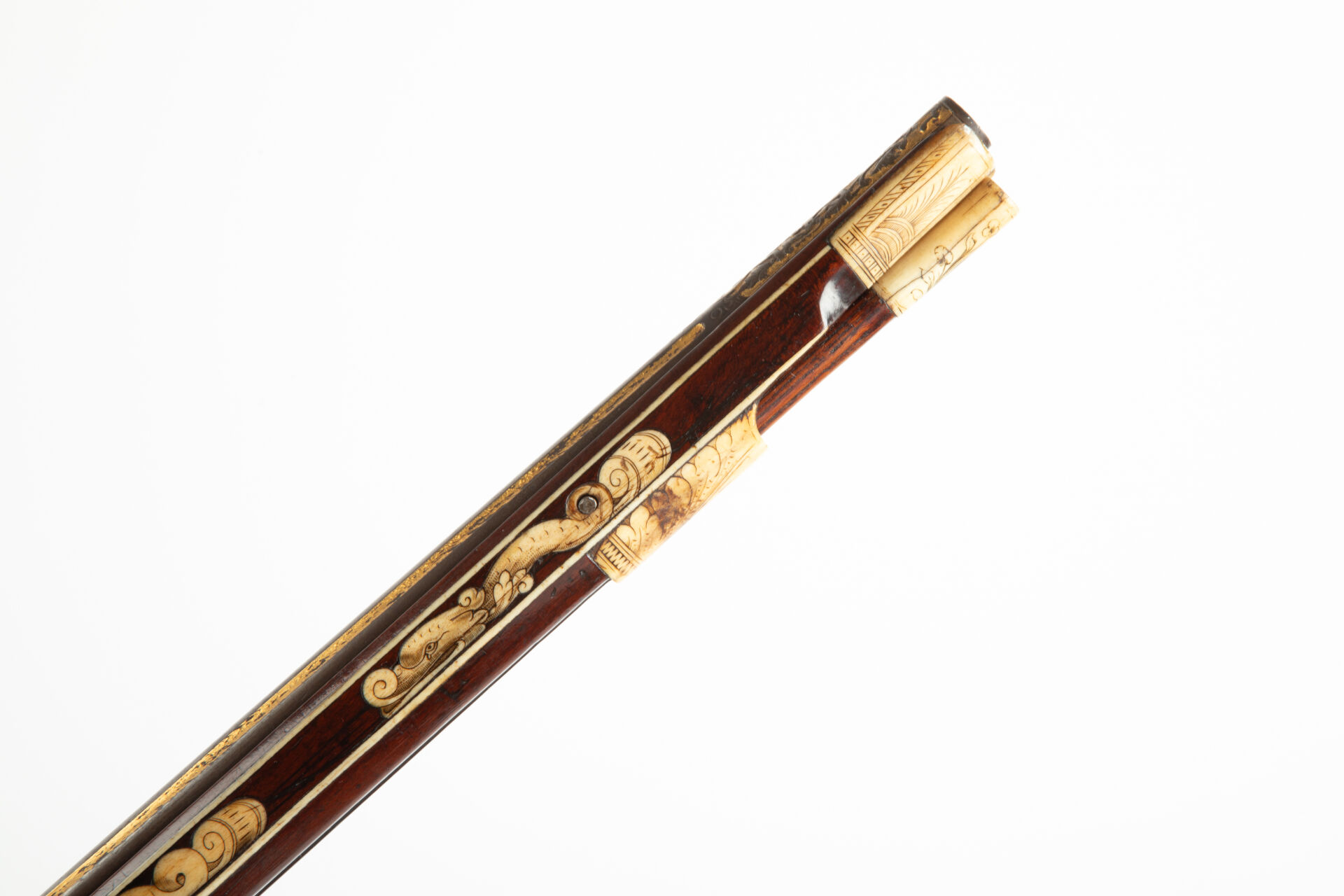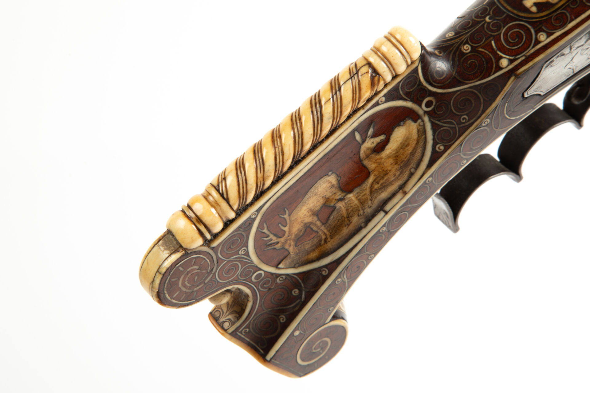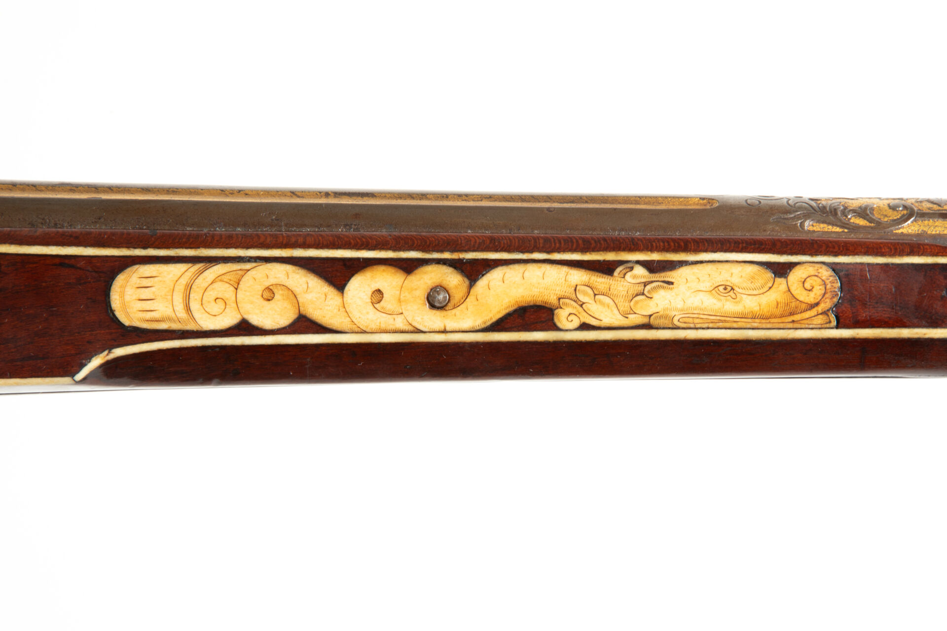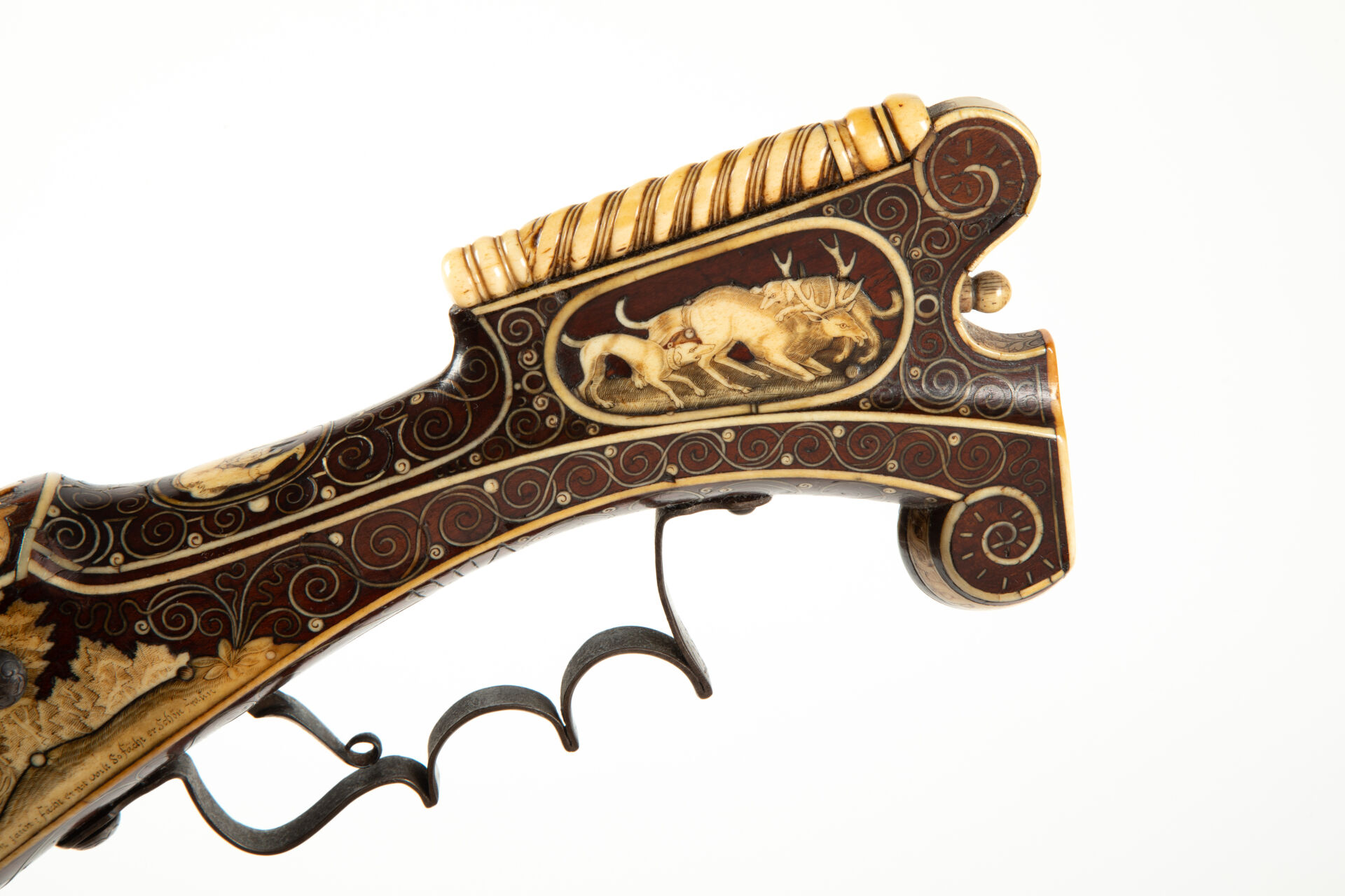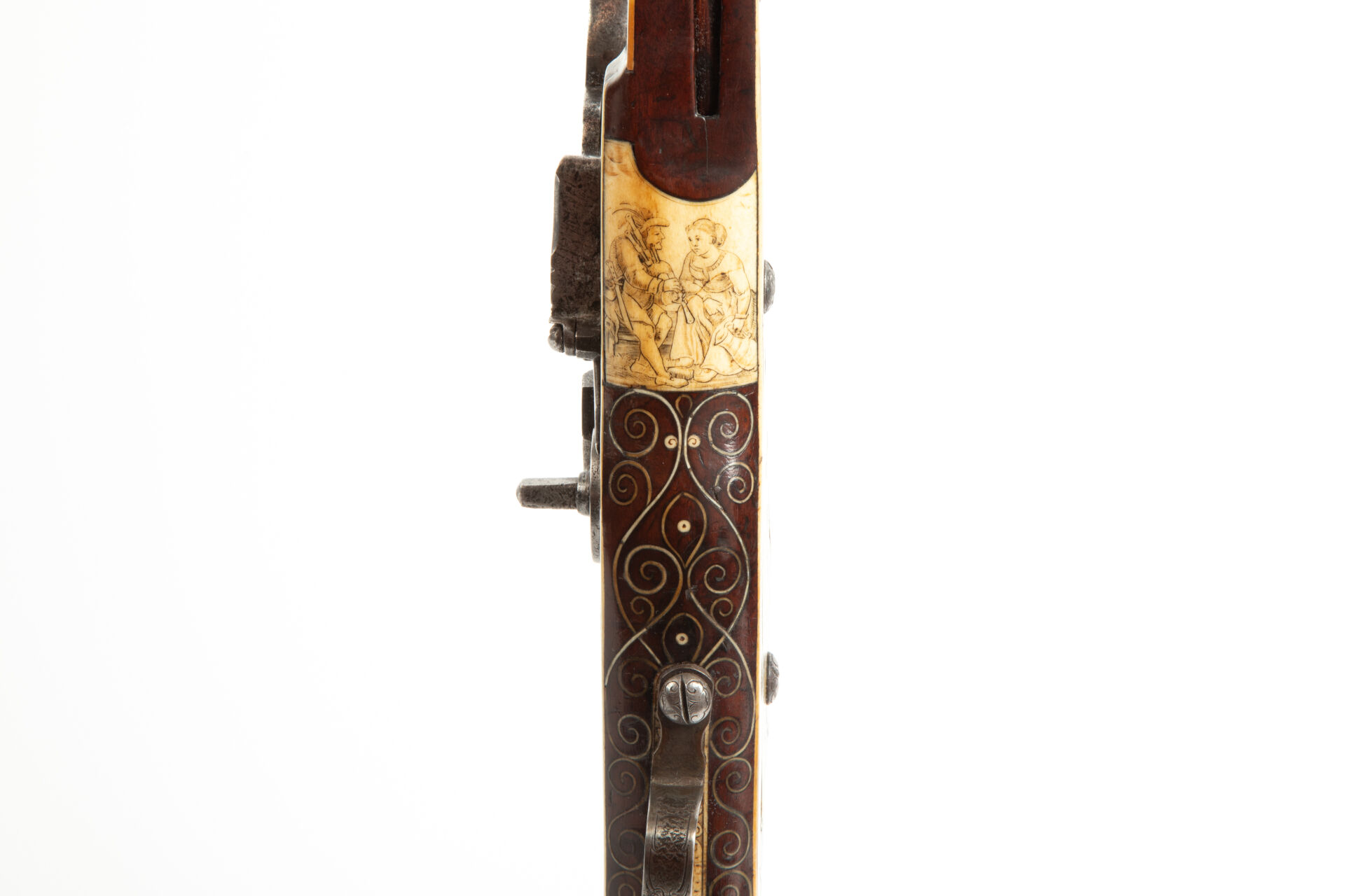 Sur les flancs de la crosse à droite cerf et biche au repos, à gauche cerf et chiens de meute affrontés. La pièce de pouce représente une polissonnerie sous la forme d’un personnage épicurien vu de dos d’une grande souplesse. A l’emplacement de la contre-platine, une plaque d’ivoire de morse représente un chasseur lutinant sa compagne adossée à un buisson, ses chiens attachés à un arbre, regardent, désespérés un lièvre s’enfuir, le texte suivant à la base complète la scène « Er richt reklein nach dem faun ernst noilt so facht er schon fraun ». Les goupilles de crosse sont habillées d’incrustations de serpents de mer lovés et affrontés, des entrelacs incrustés également en ivoire de morse, décorent tous les plats de la monture sauf le fût de l’arme. Une très belle plaque gravée selon la technique du schrimshaw montre un chasseur musicien armé de son coutelas et d’une cabrette discutant avec une servante d’auberge dont la main tient un pot de bière. Détente directe, pontet à repose doigts, la crosse au niveau de la plaque de couche est enroulée en volutes supérieures et inférieures, le centre est concave et l’emplacement du dos de la crosse est habillé par un cylindre rappelant un bâton de maréchal en ivoire de morse massif à décor spiralé. Baguette bois à embout en ivoire de morse postérieure (d’un plus gros diamètre que l’âme du canon). Mécanisme fonctionnel.