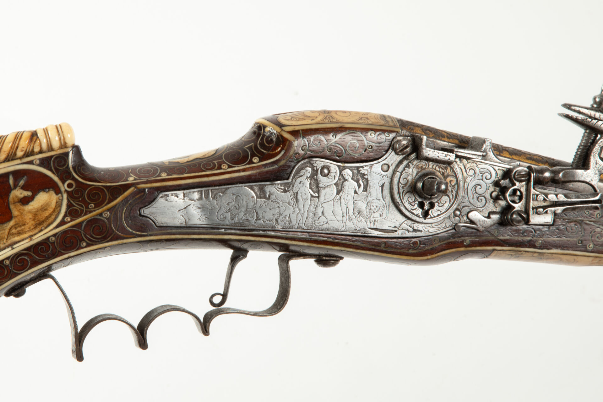 Sublime petite arquebuse à rouet de 860 mm de long par Hieronymus Borstorffer, armurier à Munich (qui exerça en tant que Compagnon dès 1596 il devint Maître en 1598, à partir de 1604 il travaille presque exclusivement en tant qu’Armurier de la Cour pour les Princes électeurs Maximilien et Albrecht). Canon cylindrique de 625 mm de long au calibre très petit comme usuellement sur ces armes de 60 balles à la livre (âme lisse). Le canon cylindrique en acier est décoré d’une frise florale à fond doré au niveau du tonnerre ou se trouve le poinçon du Maître « H.B »en lettres majuscule, le canon porte ensuite une série de flutes à fond doré, un autre cartouche floral, une autre suite de flûtes identiques et un dernier décor floral au niveau de la bouche. Tous les fonds de ces décors sont dorés à l’or moulu. Belle platine gravée avec finesse d’une scène du Jardin d’Eden ou, sous la surveillance d’une licorne et d’un lion, Adam et Eve contemplent le serpent enroulé autour de son arbre. Dans le dos d’Eve, on remarque divers animaux dont un cheval, un bouc et un éléphant. Bassinet à couvre bassinet, bride de roue avec un décor découpé en coeur, ressort de chien guilloché, chien gravé sur ses flancs de feuillages. Belle monture en noyer se prolongeant jusqu’à la bouche, incrustée de volutes et de cartouches. Riche décor gravé sur plaques et filets incrustés d’ivoire de morse (Odobenus Rosmarus). La présence confirmée d’ostéodentine (dentine secondaire), aux nodosités reconnaissables est une caractéristique morphologique probante constitutive de l’ivoire de morse (cf. ill. UV).