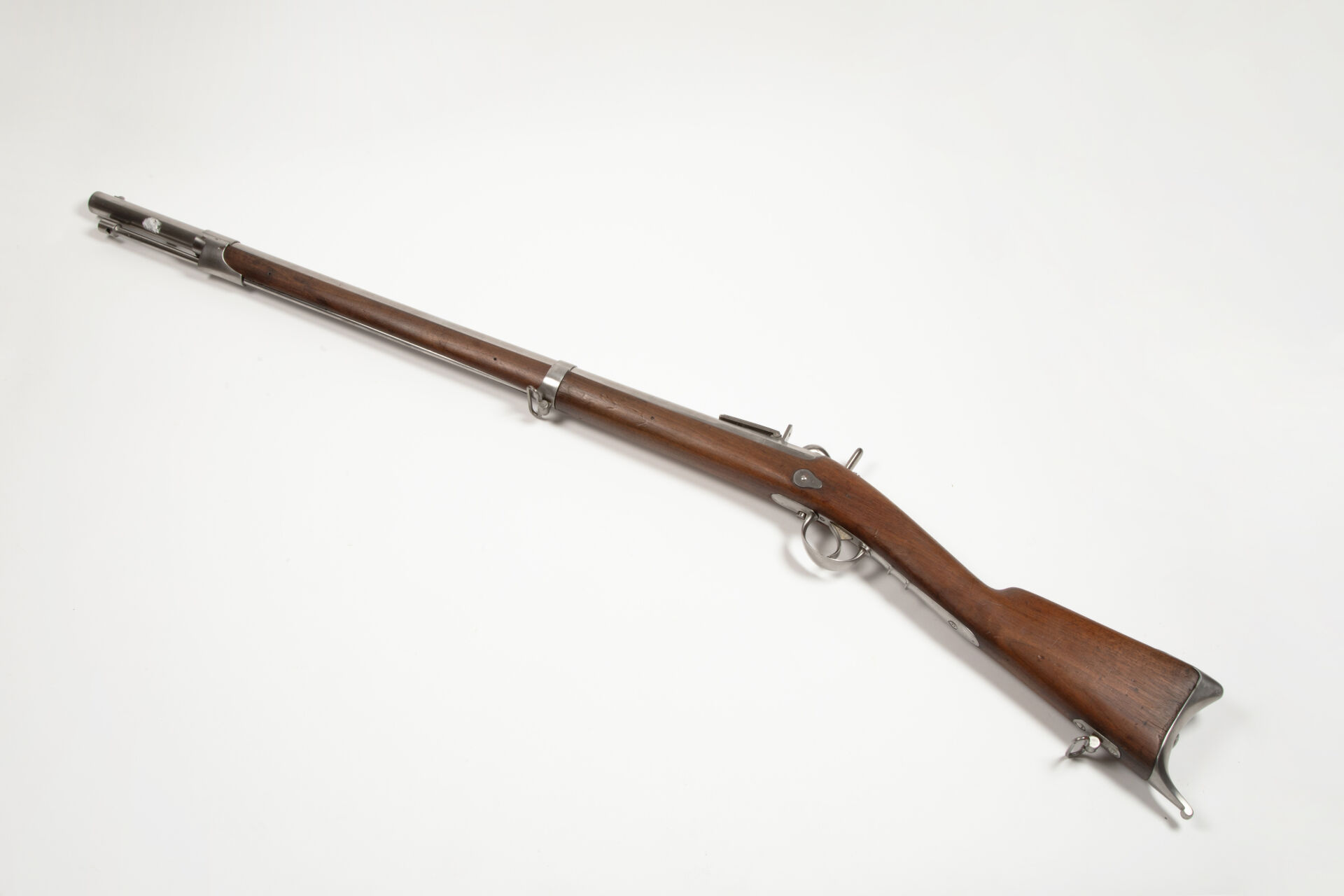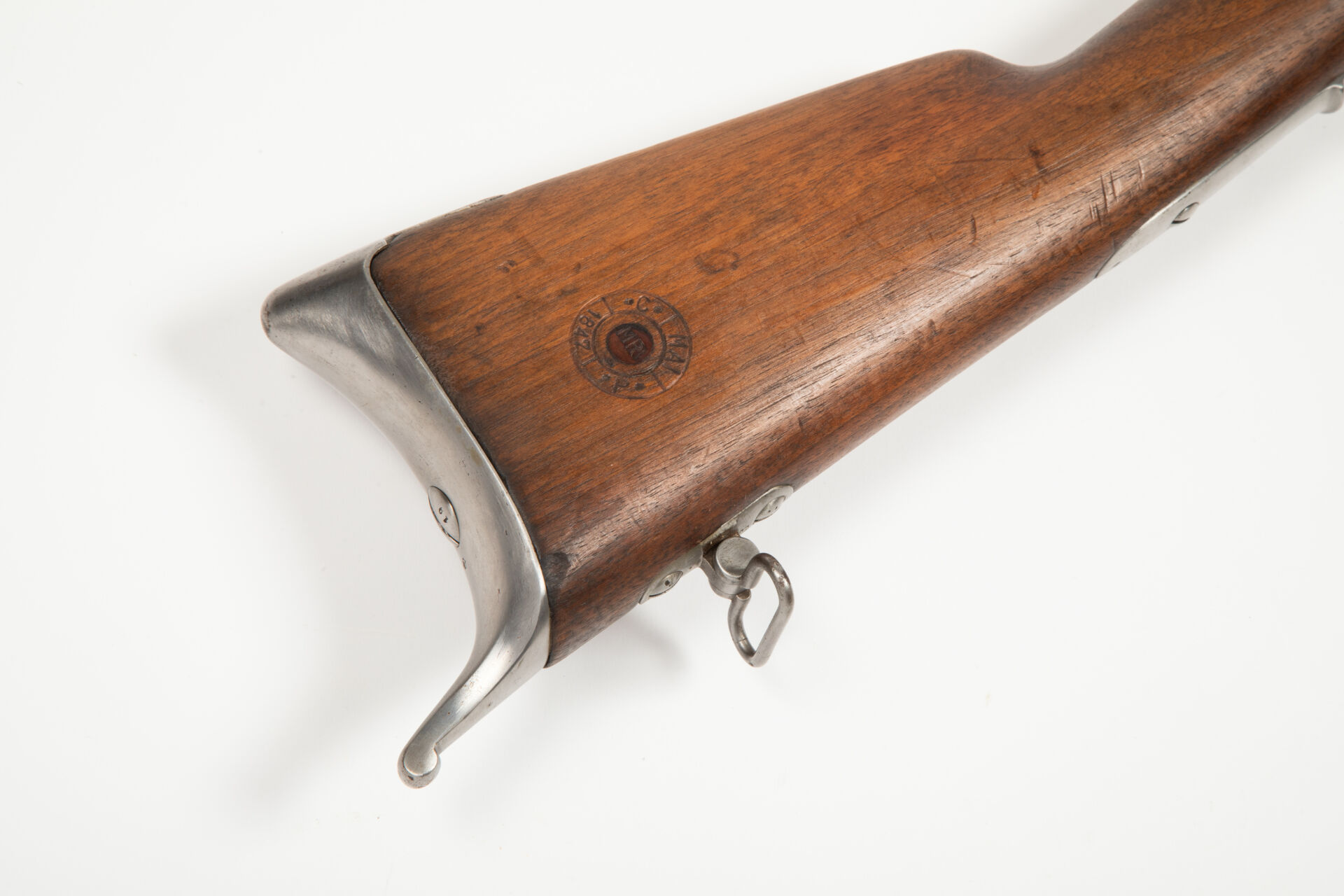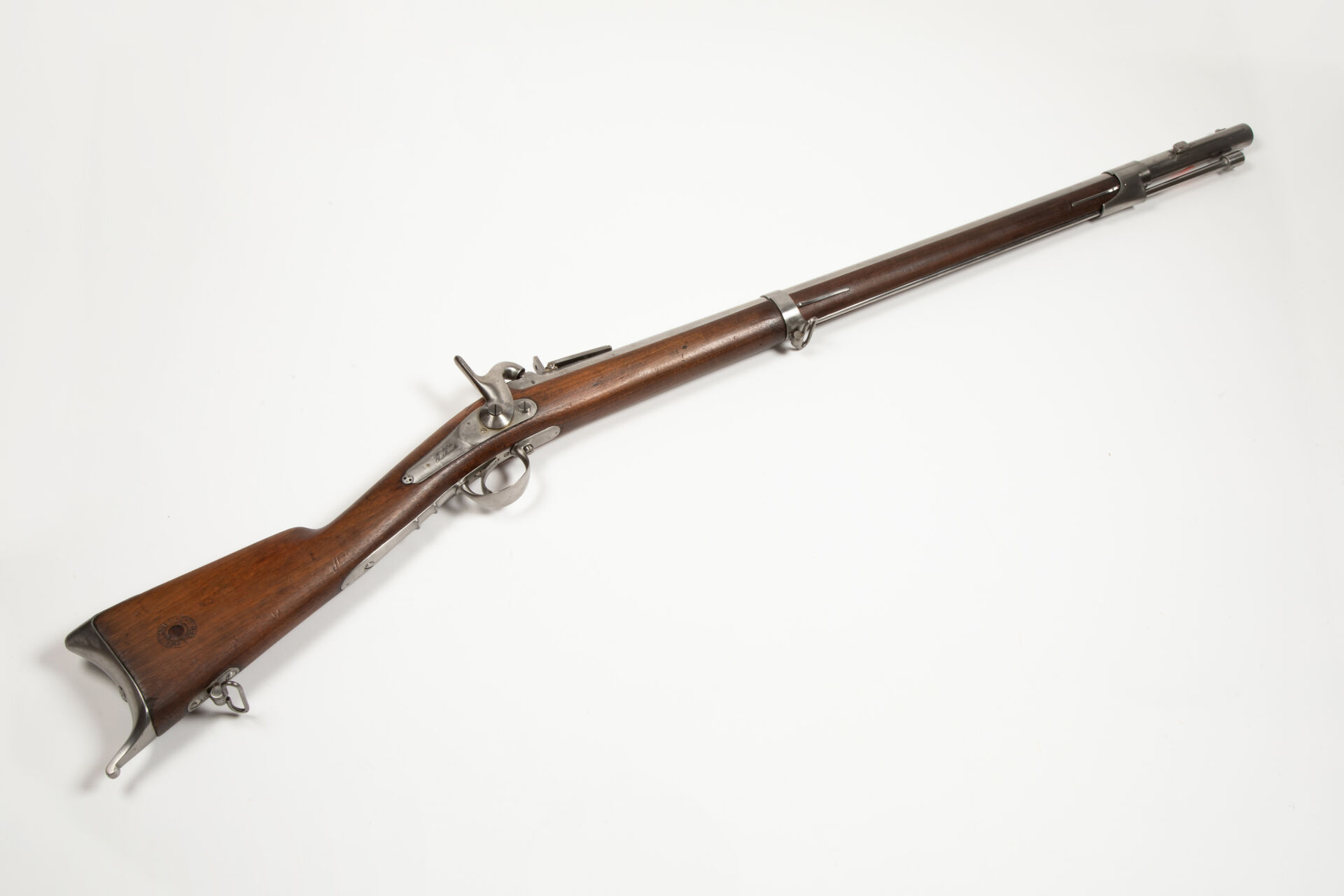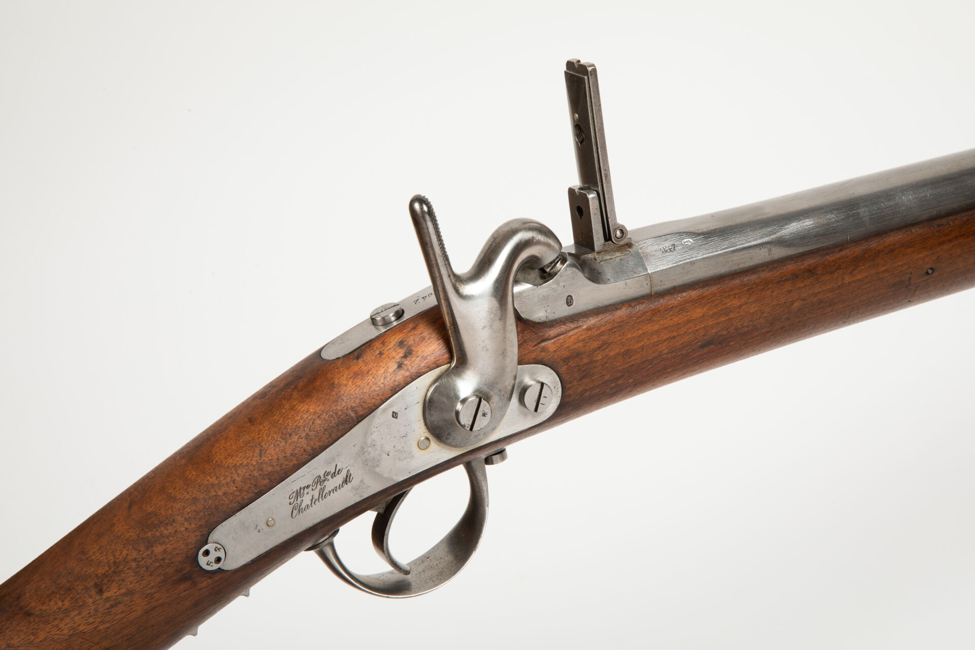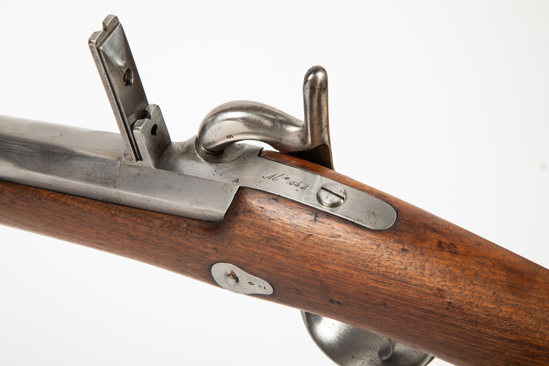 Fort fusil de rempart règlementaire à percussion et platine à l’arrière modèle 1842, corps de platine signé « Manufacture Royale de Châtellerault », canon daté 1847 rayé au calibre de 6 balles à la livre (20.6 mm sur sommet de rayure). Canon octogonal puis rond, tenon de baïonnette à droite, forte queue de culasse à pans retenant la masselotte porte cheminée ainsi qu’une hausse rabattable à deux feuillets. Toutes garnitures fer, baguette fer. Belle monture en noyer havane, macaron de crosse à cheville centrale en buis portant le marquage « MR » pour manufacture royale et la date périphérique Mai 1847. Plaque de couche à croc. Arme en parfait état d’origine. Mécanisme fonctionnel.