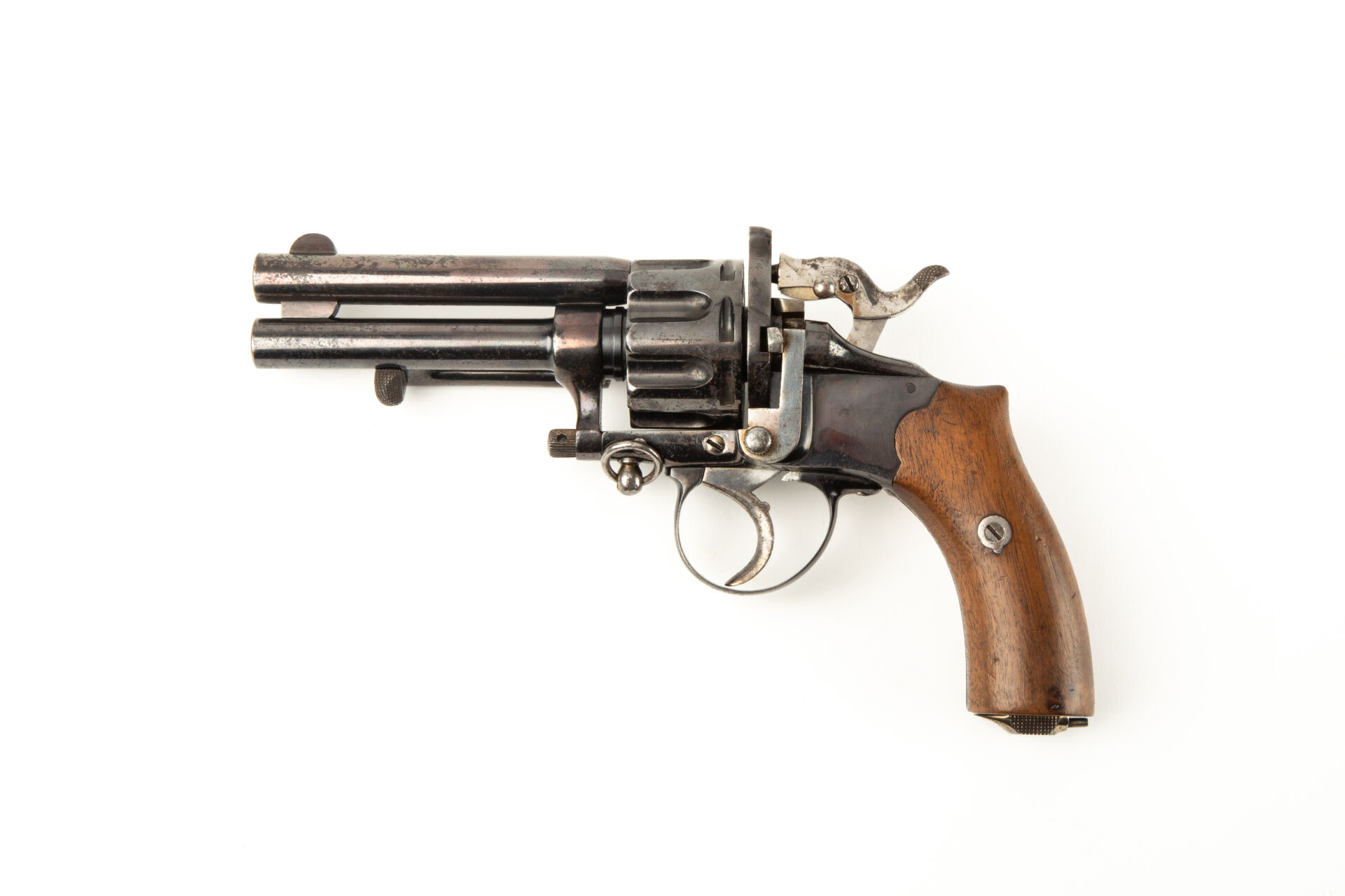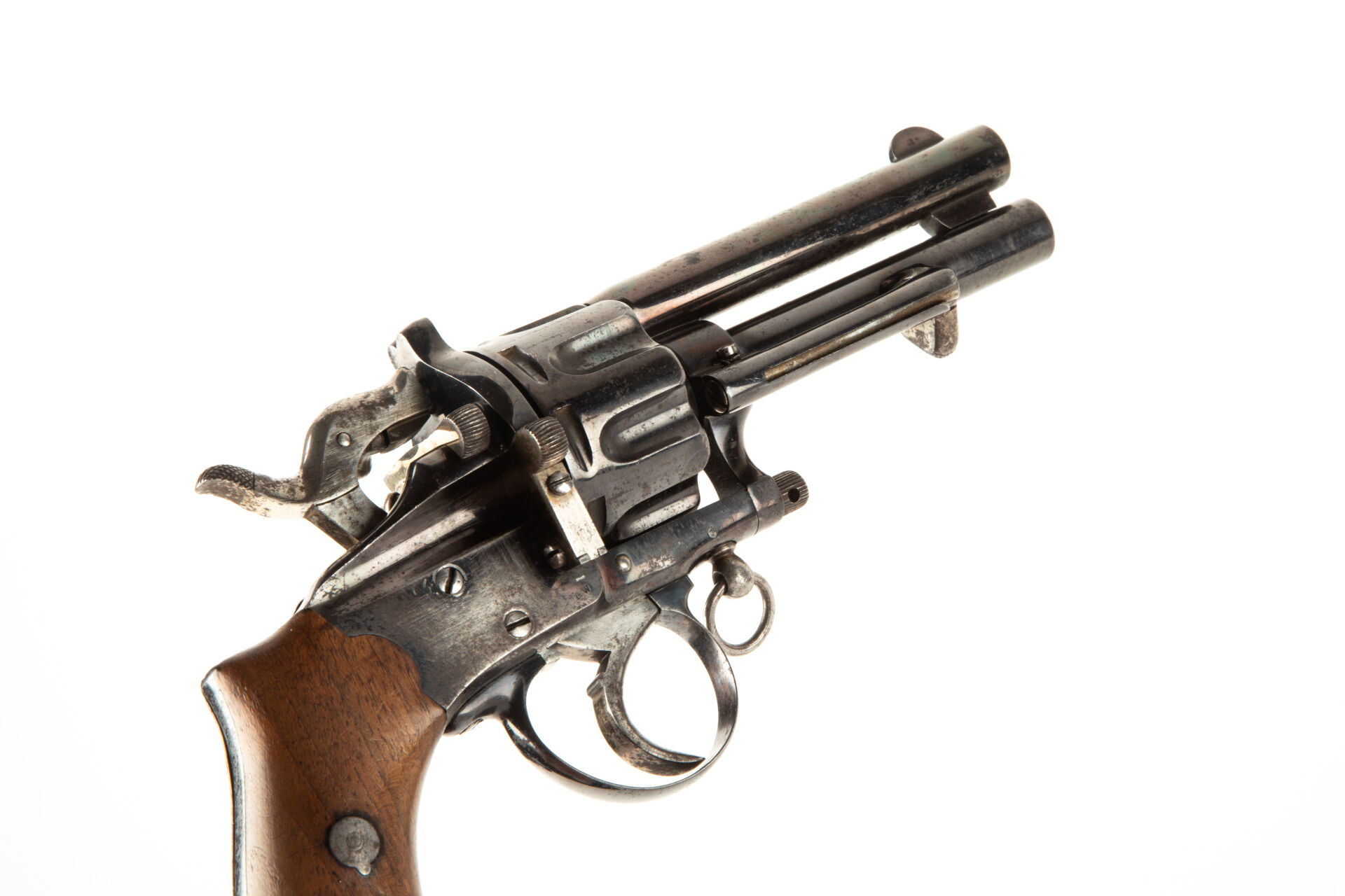 Extraordinairement rare prototype d’un révolver Le Mat en double action, barillet évidé en calibre 9 mm Nagant (9 x 22 R modèle 1878) à 8 coups portant le poinçon ovale non couronné du banc d’épreuve de Liège entre deux chambres et un poinçon K couronné entre deux autres chambres, coup central également en 9 mm Nagant, canon rayé. Arme bronzée noir brillant (rebronzage ancien) avec quelques manques au niveau du flanc droit de la carcasse, pièces périphériques jaunies, le pied de canon porte un canal de baguette et une baguette à tête quadrillée maintenue en place par un ressort. Portière de chargement à droite basculant vers le bas, culasse du coup central pivotant à gauche avec extracteur automatique, chien à percussion centrale à deux positions, plaquettes de crosse en noyer lisse. Un logement situé au niveau de l’anneau de calotte retient vissé un outil multifonction (chasse goupille et double tournevis plat). Arme exempte de marquage de numéro, ce qui n’est pas étonnant pour une arme de pré-série. Mécanisme fonctionnel tant en simple qu’en double action. La percussion du coup central induisant le débrayage de l’élévateur de barillet. Canons en parfait état, rayures franches et nettes.