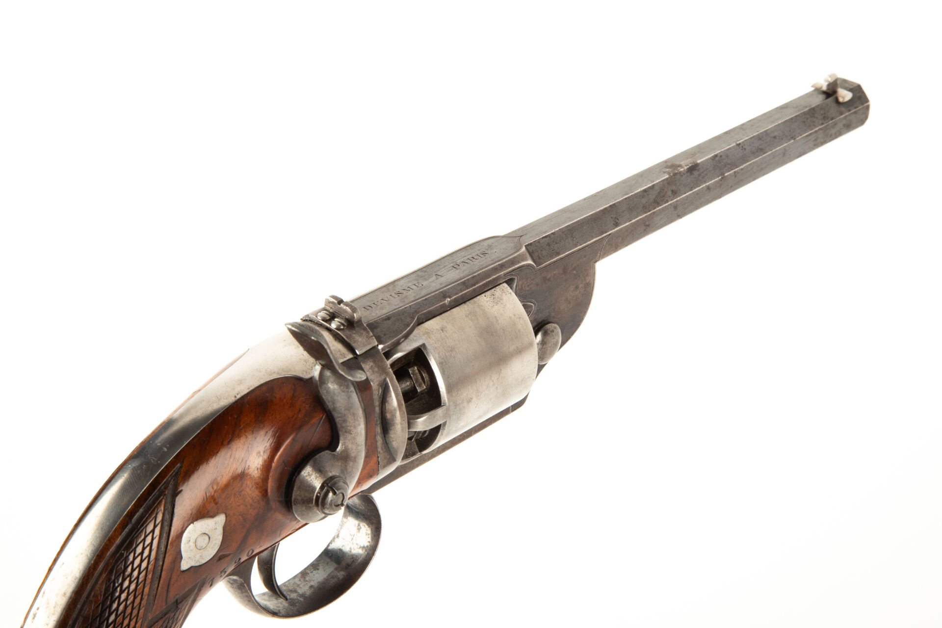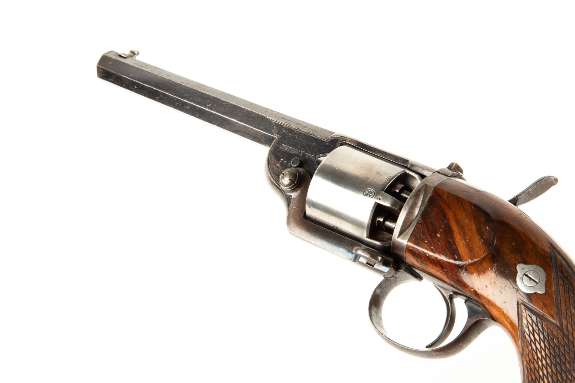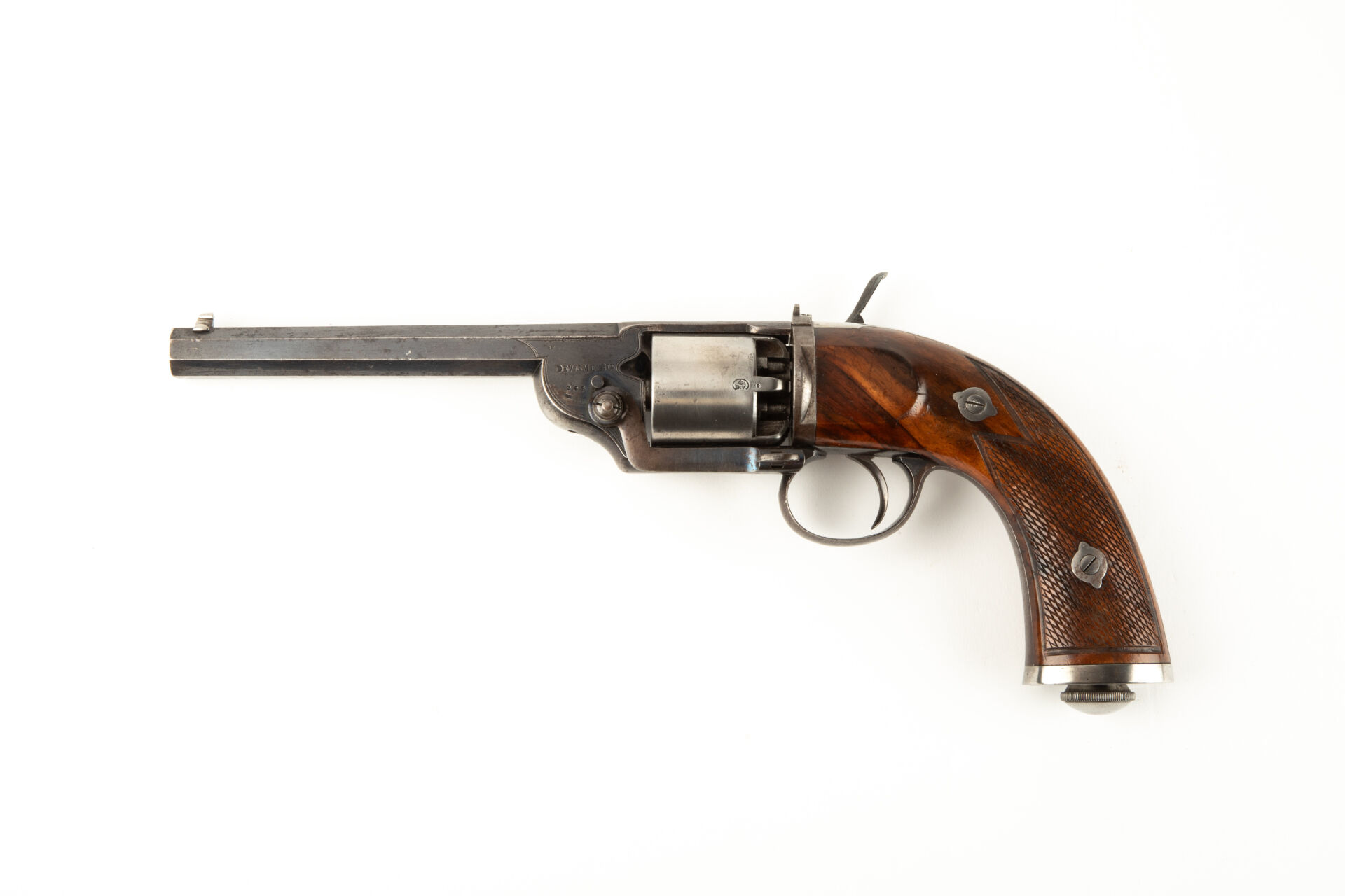 Joli coffret monté à l’anglaise sur lit de velours vert légèrement insolé, contenant un révolver à percussion Devisme, calibre 10.6 mm, canon octogonal marqué « Devisme Bté » sur le pied gauche et numéro 365, le renfort du canon joignant le rempart de barillet porte le marquage en lettres majuscules « DEVISME A PARIS », guidon sur queue d’aronde, bronzage noir brillant, barillet lisse portant un poinçon « DV » couronné, levier de démontage à gauche du canon, chien externe à droite commandant et actionnant en simple action un percuteur axial inclus dans le mécanisme caché par les plaquettes. La calotte porte un pousse balle dévissable, plaquettes de crosse en noyer quadrillé retenues par deux rosettes et vis. Le coffret, outre le grand révolver de 335 mm à mécanisme fonctionnel et en bel état contient aussi une réserve d’amorce en buis, une poire à poudre, un maillet de chargement (manche buis, tête acier), un tournevis plat à manche en buis, une baguette de nettoyage et un moule à balles à cavité unique et coupe jet permettant de fabriquer des balles ogivales. Le manche du moule à balles se termine en clef démonte cheminée. Ce moule à balles ne s’ouvre pas mais en pivotant le coupe jet on peut extraire l’ogive du moule sans avoir à l’ouvrir. Quelques balles d’époque en plomb accompagnent ce coffret dont le couvercle porte un écusson en laiton gravé « A. DE B. ». La clef du coffret est présente dans un logement.
