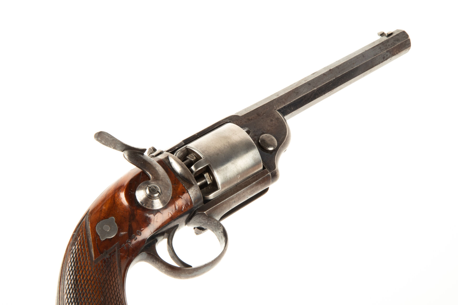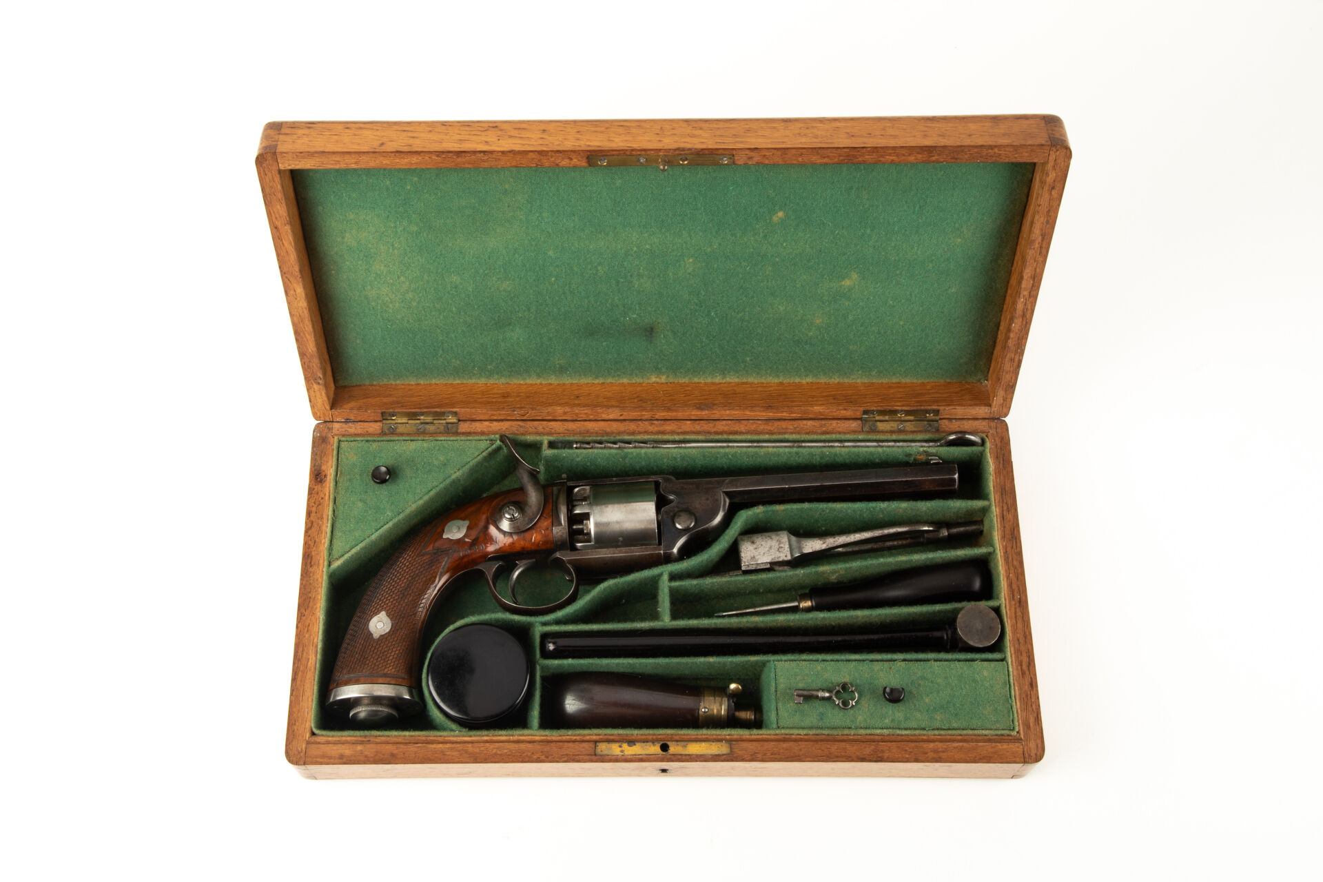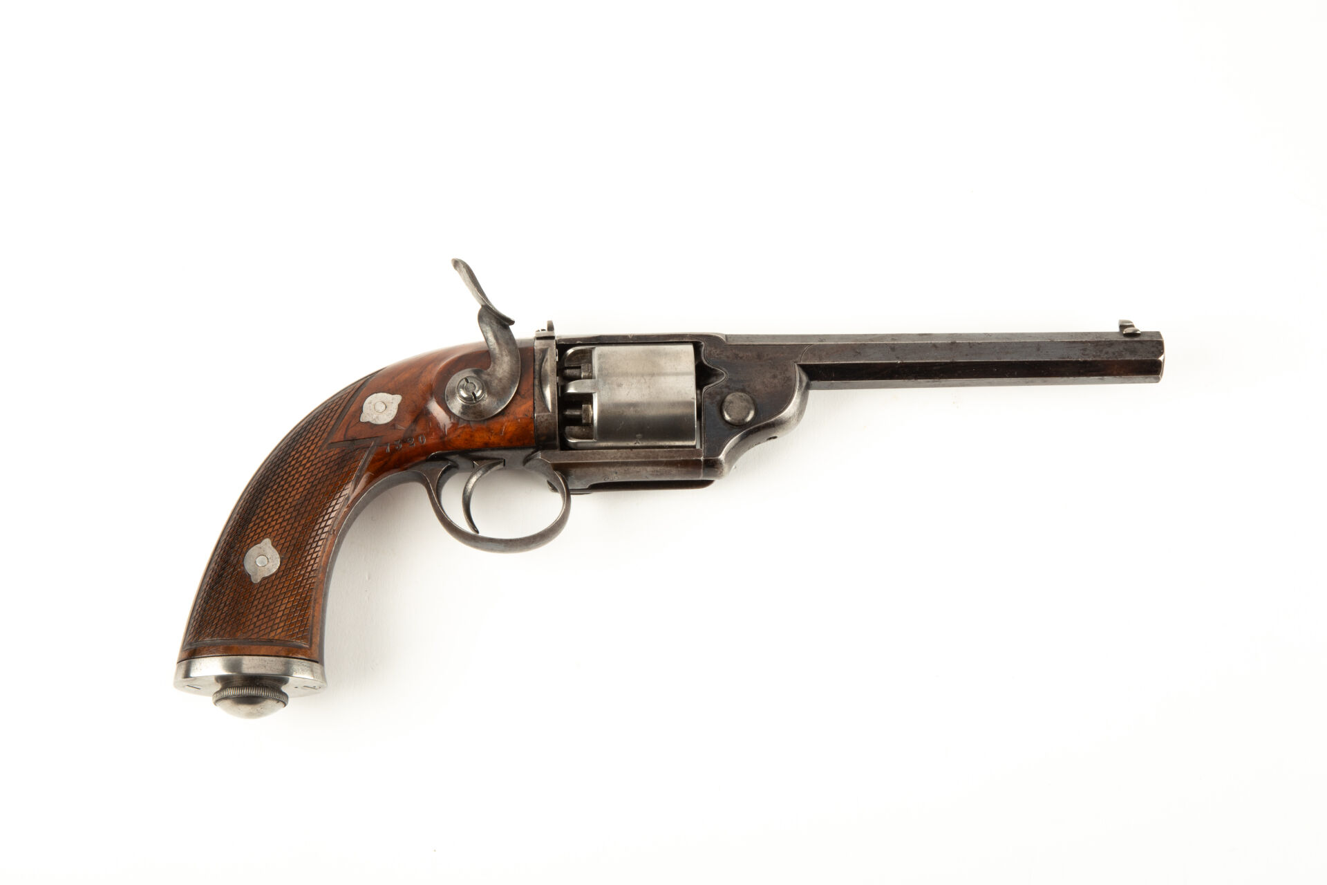 Joli coffret monté à l’anglaise sur lit de velours vert légèrement insolé, contenant un révolver à percussion Devisme, calibre 10.6 mm, canon octogonal marqué « Devisme Bté » sur le pied gauche et numéro 365, le renfort du canon joignant le rempart de barillet porte le marquage en lettres majuscules « DEVISME A PARIS », guidon sur queue d’aronde, bronzage noir brillant, barillet lisse portant un poinçon « DV » couronné, levier de démontage à gauche du canon, chien externe à droite commandant et actionnant en simple action un percuteur axial inclus dans le mécanisme caché par les plaquettes. La calotte porte un pousse balle dévissable, plaquettes de crosse en noyer quadrillé retenues par deux rosettes et vis. Le coffret, outre le grand révolver de 335 mm à mécanisme fonctionnel et en bel état contient aussi une réserve d’amorce en buis, une poire à poudre, un maillet de chargement (manche buis, tête acier), un tournevis plat à manche en buis, une baguette de nettoyage et un moule à balles à cavité unique et coupe jet permettant de fabriquer des balles ogivales. Le manche du moule à balles se termine en clef démonte cheminée. Ce moule à balles ne s’ouvre pas mais en pivotant le coupe jet on peut extraire l’ogive du moule sans avoir à l’ouvrir. Quelques balles d’époque en plomb accompagnent ce coffret dont le couvercle porte un écusson en laiton gravé « A. DE B. ». La clef du coffret est présente dans un logement.