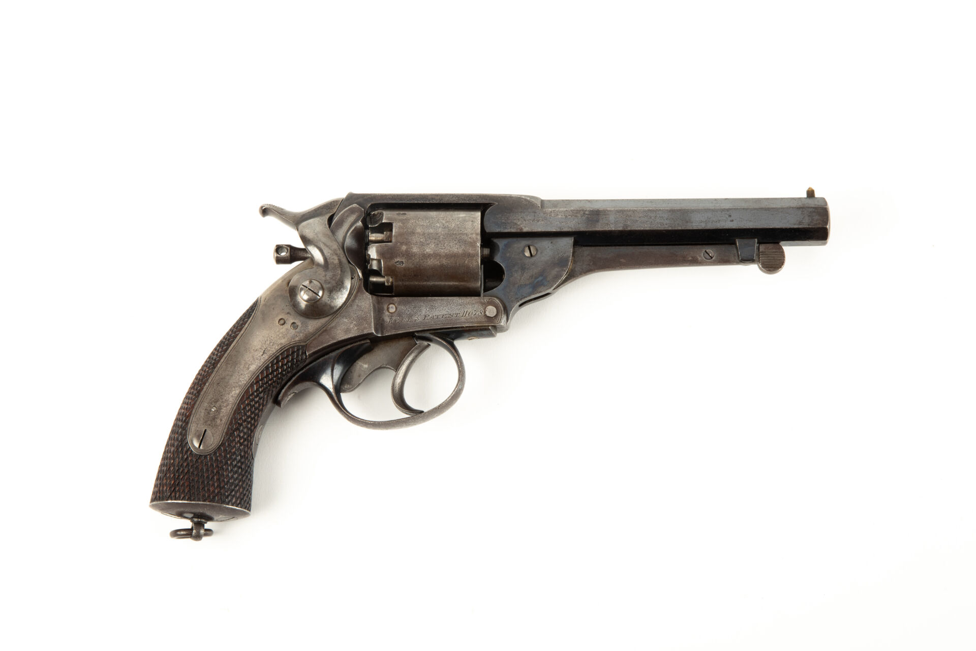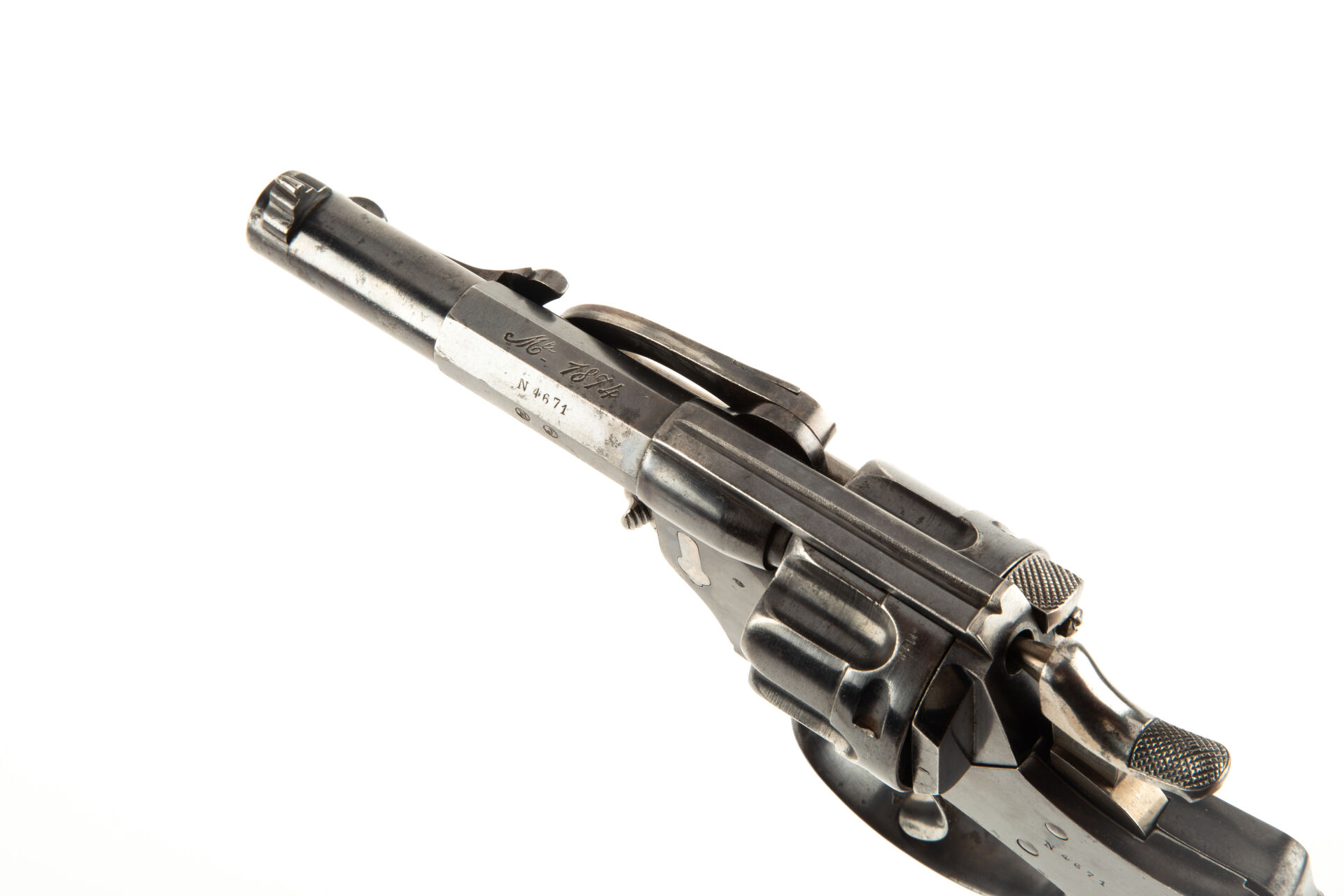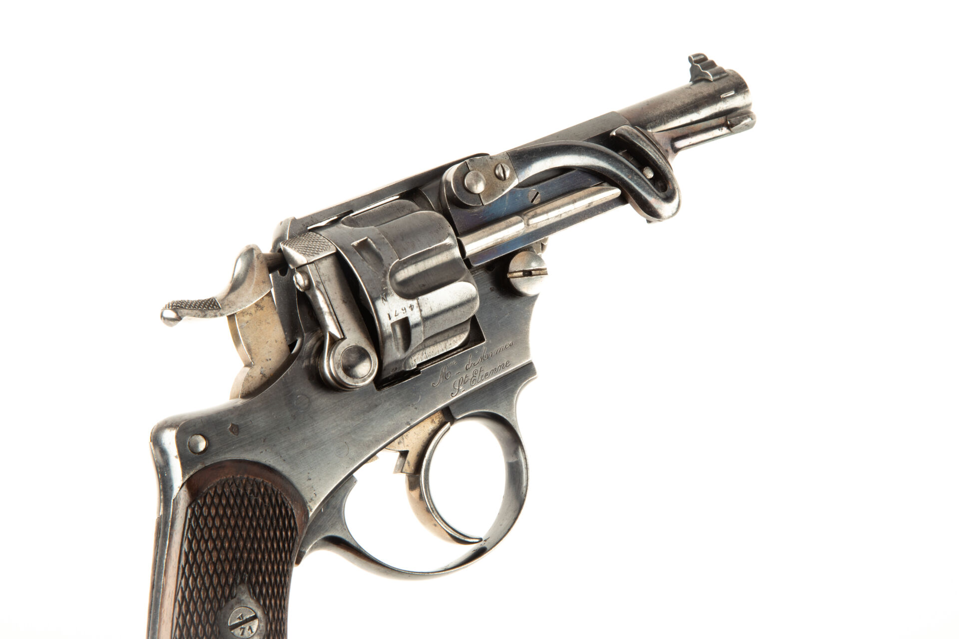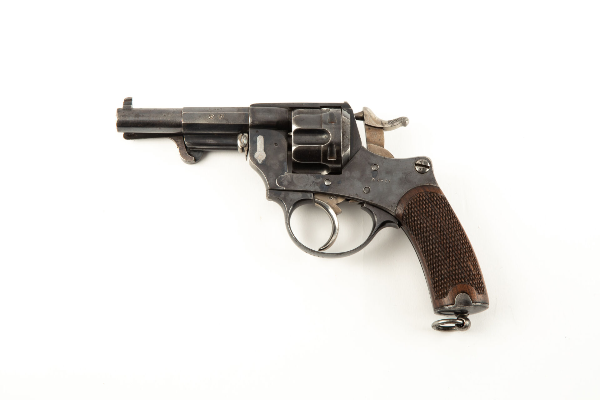 Révolver d’Officier français modèle 1874, système d’extraction modifié selon de brevet De I’Espée Aumont avec poussoir basculant vers le bas entrainant, dans sa descente, le recul de la baguette d’extraction. En fin de course le levier se verrouille en place par l’entremise d’un téton saillant sur le flanc droit du canon. Arme n°N4671. Excellent canon pour le tir, finitions d’origine (bronzage brillant et revenu jaune paille pour les pièces annexes). Mécanisme fonctionnel.