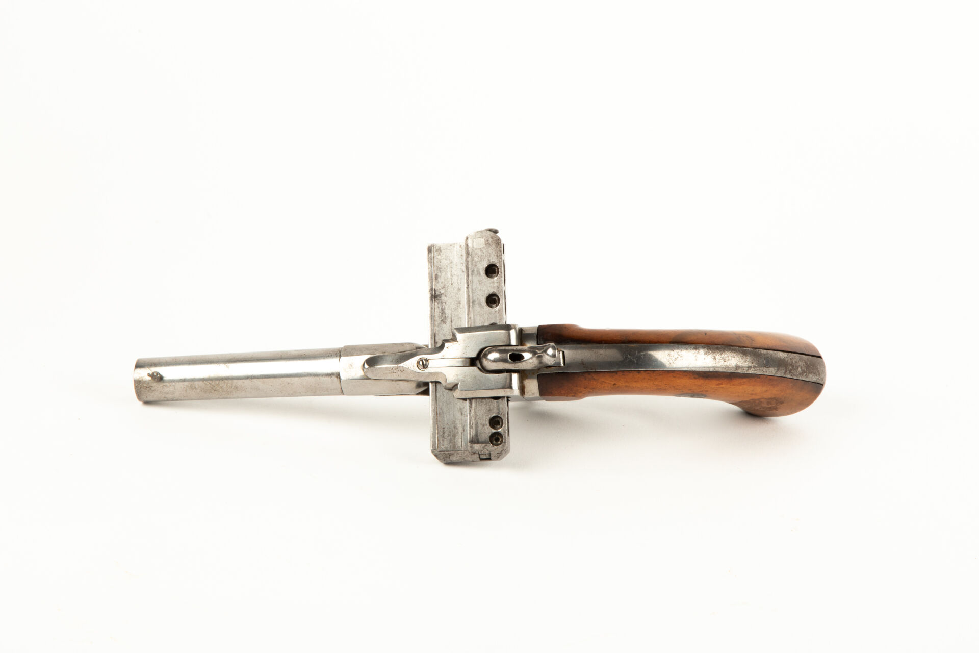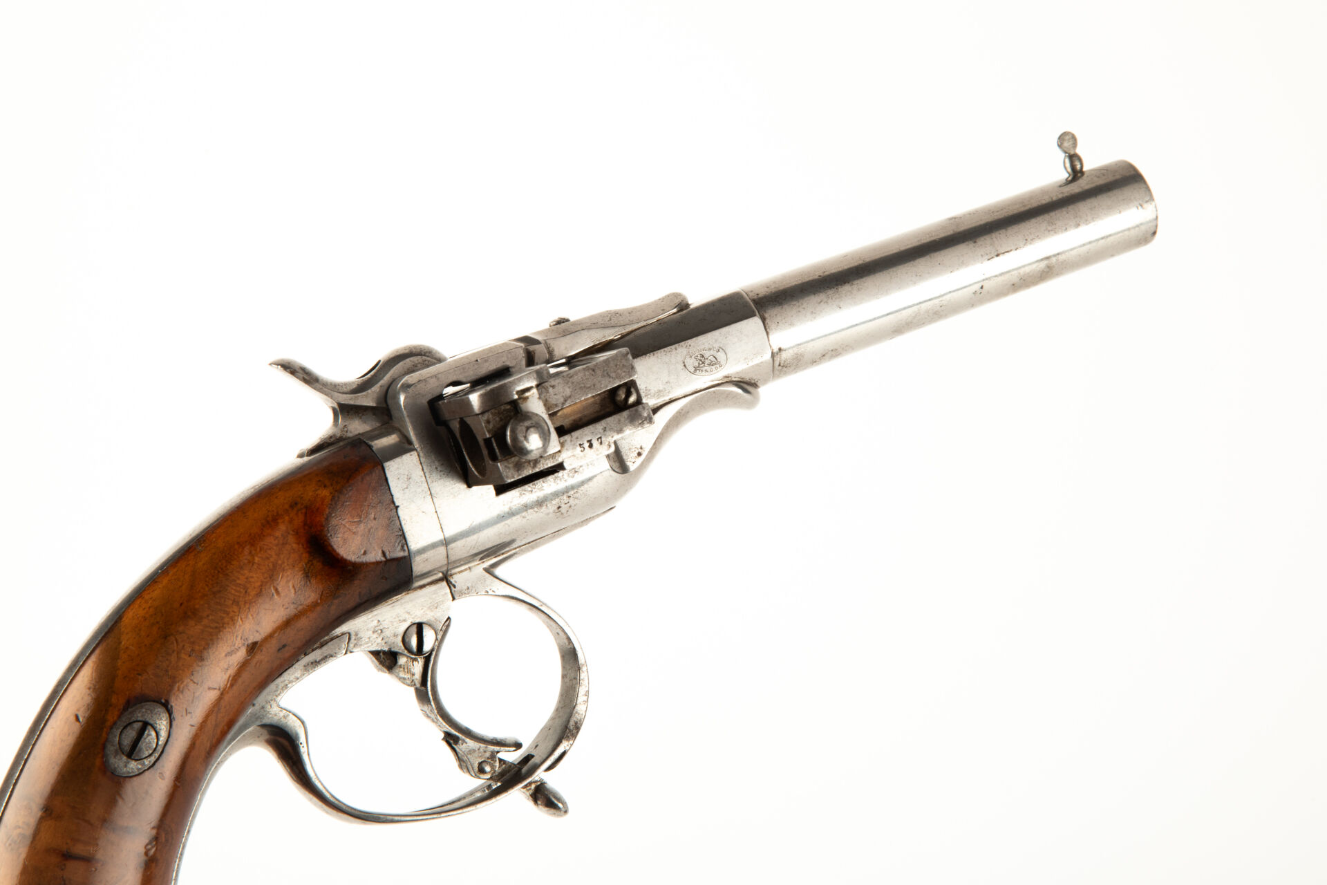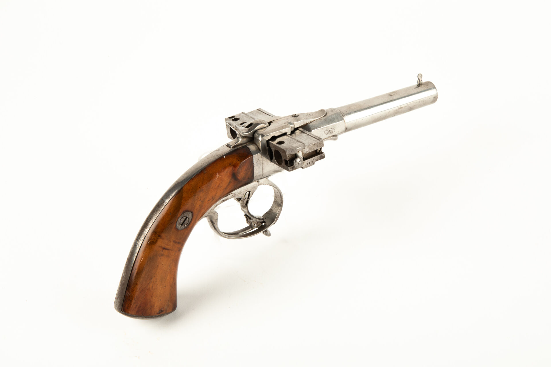 Joli pistolet Jarre deuxième modèle à chargeur latéral en calibre 9 mm à broche à six coups Jarre type Harmonica, arme polie blanc, chargeur d’origine translatant de droite à gauche, armement séparé du chien par action de l’excroissance de la détente traversant le pontet pour bloquer l’arme en simple action, possibilité de tir en double action en actionnant directement la détente à l’intérieur du pontet. Canon octogonal au départ puis rond rayé surmonté d’un guidon très proéminent, marquage sur le pan droit du canon, dans un cartouche ovale au lion rampent « Jarre & Cie Bte S.G.D.G ». Arme n°537 avec chargeur au numéro. Deux plaquettes de crosse vissées en noyer blond vernis, calotte ovale. Mécanisme fonctionnel, très bel état pour le tir.