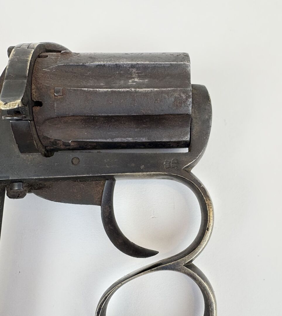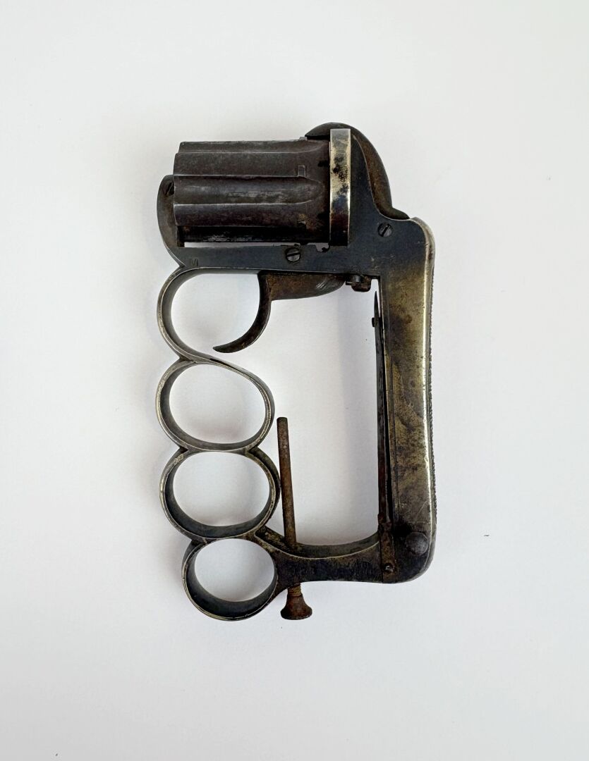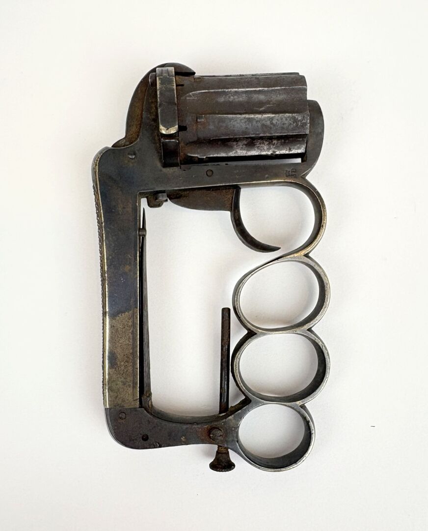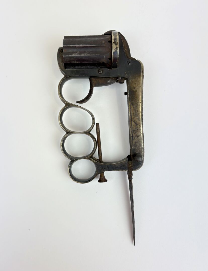 Révolver-poivrière combiné (révolver, poing américain et poignard) à broche calibre 7 mm, système Delhaxe dit révolver Apache à six coups. Barillet cannelé, mécanisme à double action uniquement (pas de crête de chien), la poignée forme coup de poing américain, le dos de la poignée est quadrillée et porte sur sa face interne une lame symétrique à quatre pans repliable à cran d’arrêt. L’arrière des emplacement de doigts portent eux, vissée, la baguette extractrice. Ressort de rappel de détente un peu faible, mécanisme fonctionnel. Marquage à la base de la poignée « J. Delhaxe » et numéro 420.