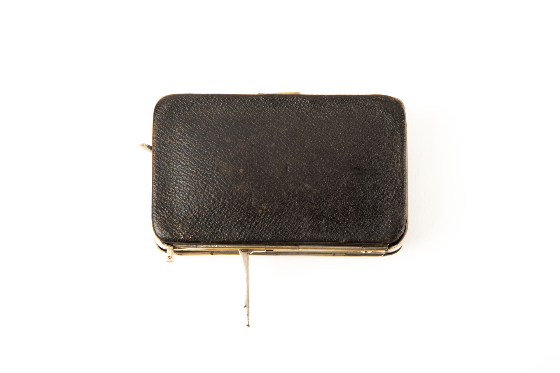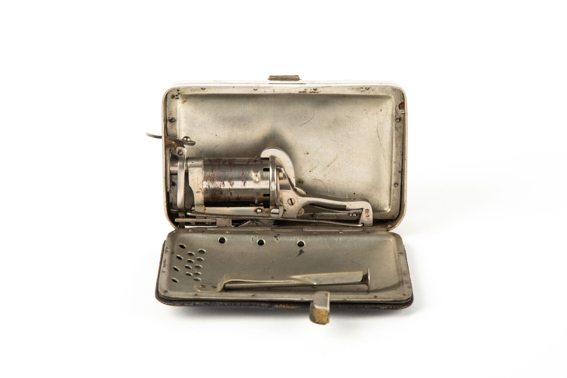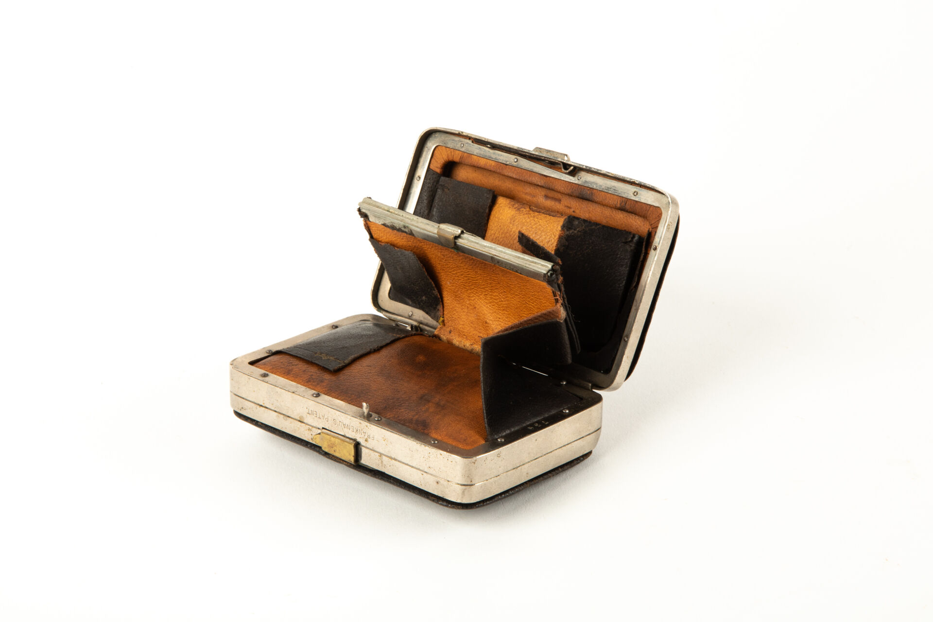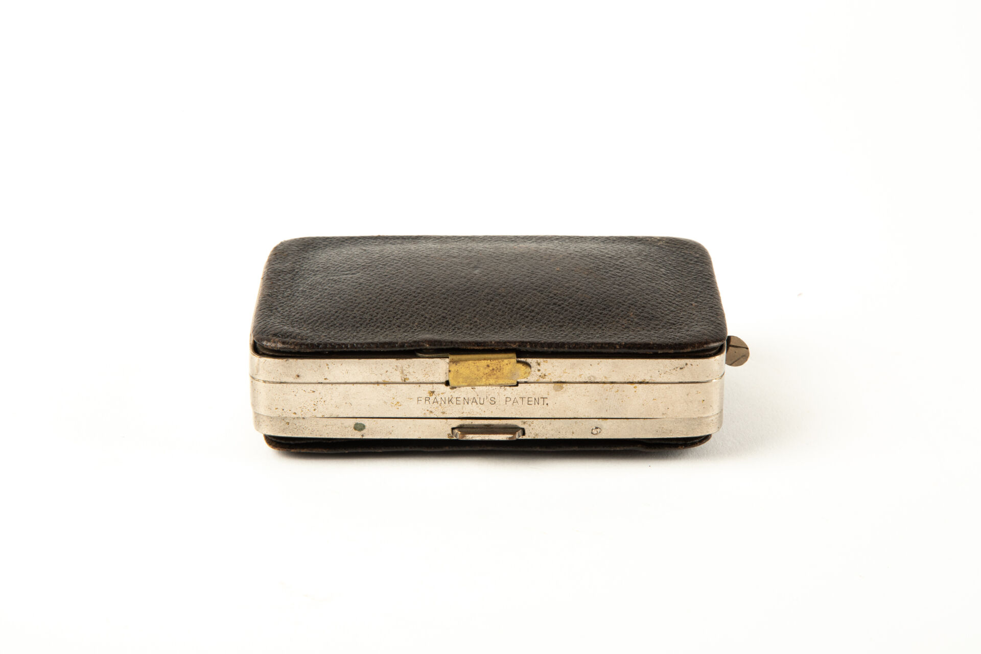 Rare et intéressant porte-monnaie révolver par Oscar Frankenau (armurier à Liège, brevet de 1877). Le logement de gauche de ce porte-monnaie contient un mécanisme de révolver à broche inspiré du système Lefaucheux, calibre 5 mm, chien sans crête à double action uniquement. Le logement et le couvercle sont habillés d’une feuille de métal emboutie isolant le révolver du reste du porte-monnaie. La baguette est retenue dans le couvercle par une patte repliée, un verrou maintenant se logement en position fermée. Détente repliable faisant saillie à l’extérieur du porte-monnaie permettant l’utilisation de l’arme lorsque ce dernier est fermé. Trappe d’occultation du canon pivotante. Le logement de gauche contient un portefeuille et un porte-monnaie à soufflet de cuir également verrouillé par un poussoir. Mécanisme fonctionnel.