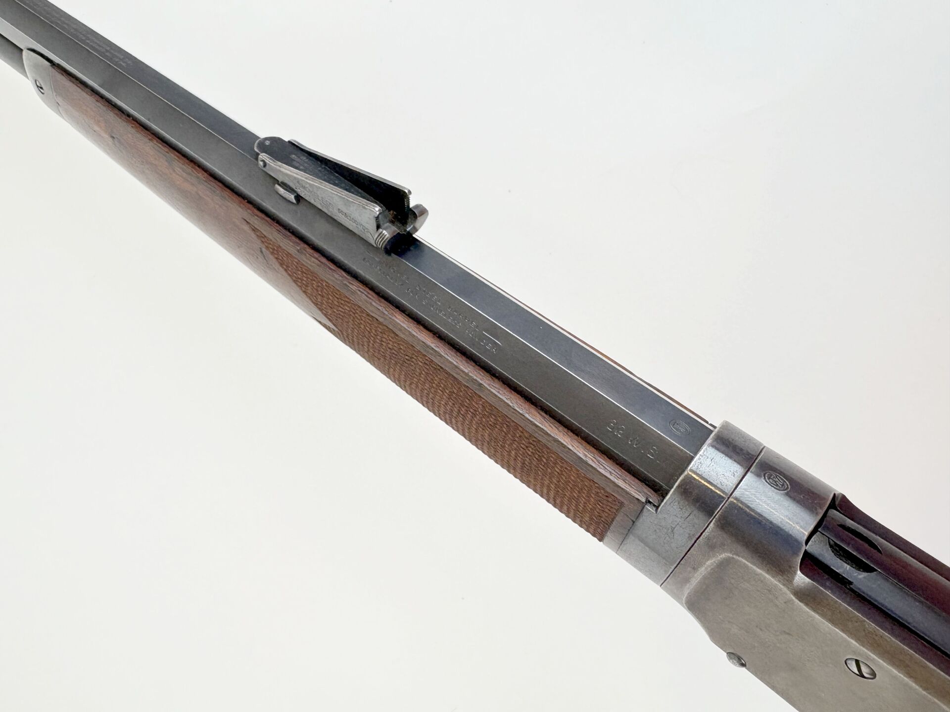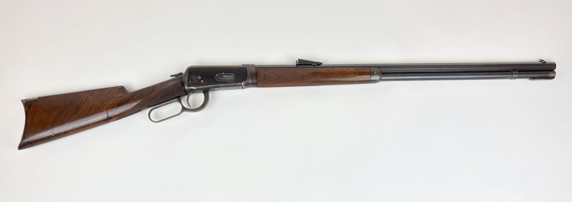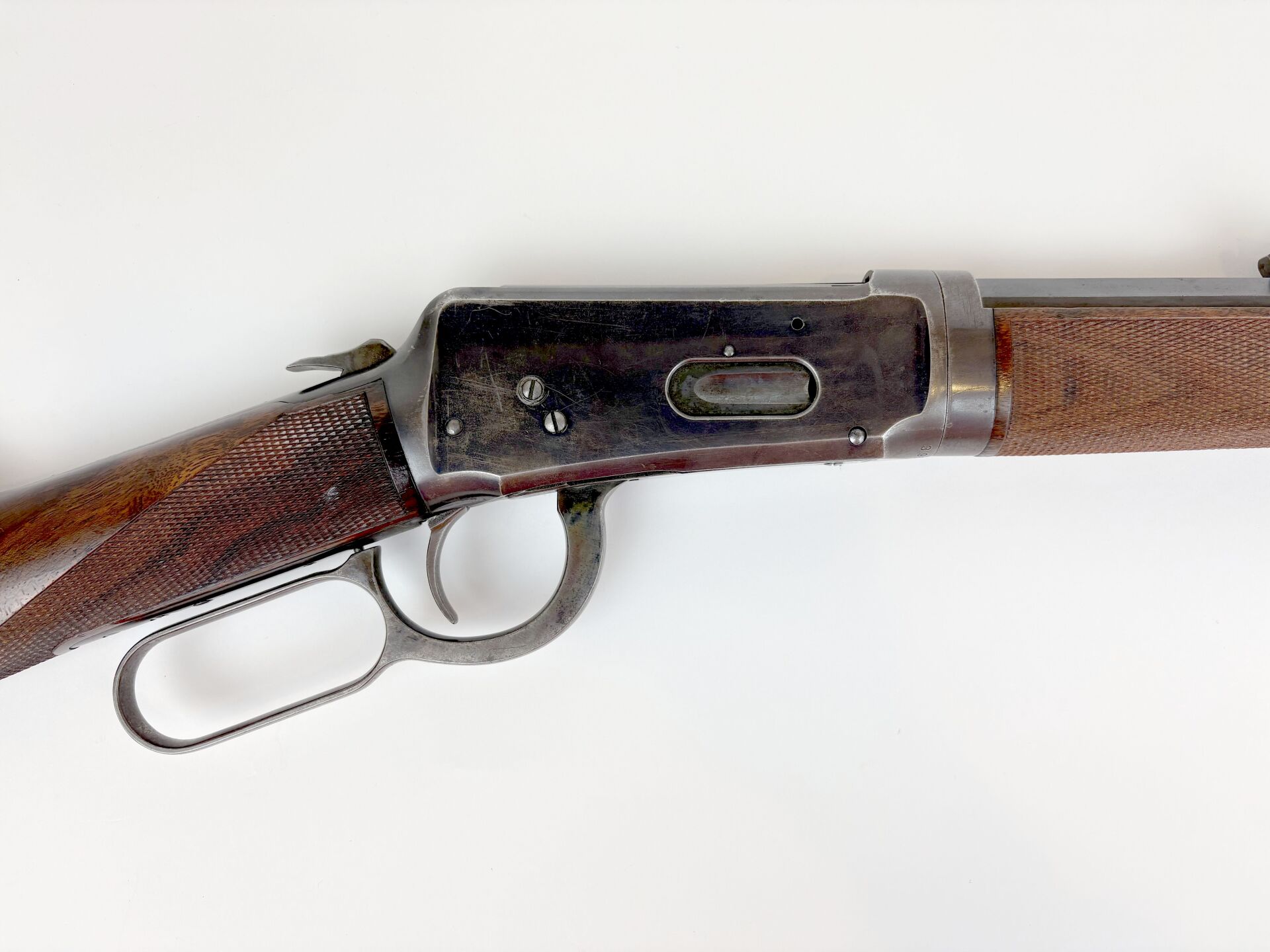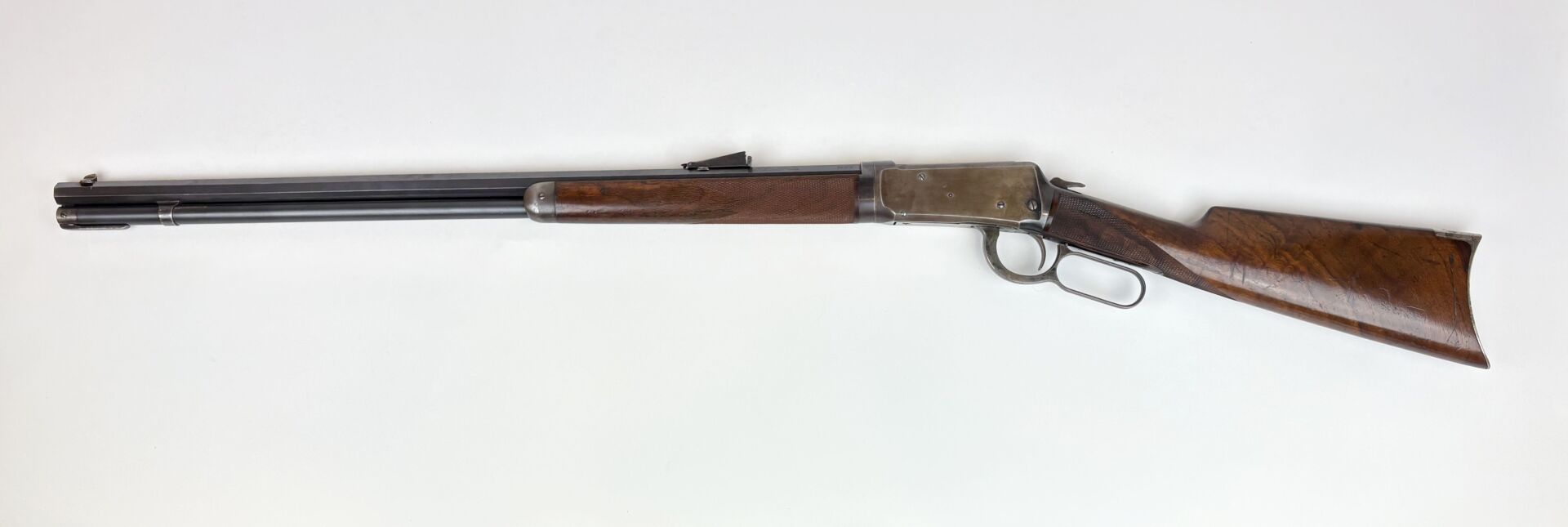 Joli rifle take down Winchester modèle 1894, calibre 32 WS, numéro 396075 (fabrication 1906). Canon octogonal de 26 pouces, hausse brevetée winchester à crans réglables par pression du pouce. Marquage sur deux lignes sur le plat du canon à l’avant de la hausse et sur la pan gauche à l’arrière de la hausse marquage « nickel steel barrel espacialy for smockeless powder ». Le plat du canon et le sommet de la chambre portent face à face un poinçon oravel portant les initiales « WP ». Le tube magasin se dévisse lorsqu’on déverrouille un levier replié sur ce dernier, le dévissage du tube magasin permettant de faire pivoter l’avant de la carabine pour la démonter par le truchement d’un filetage interrompu. Bronzage d’origine ayant très légèrement viré au tabac par endroits, crosse anglaise en noyer choisi vernis et quadrillé à la poignée (on retrouve la même quadrille sur le devant). Plaque de couche incurvée en acier avec restes de trempe au paquet. Mécanisme fonctionnel, canon aux rayures parfaites.