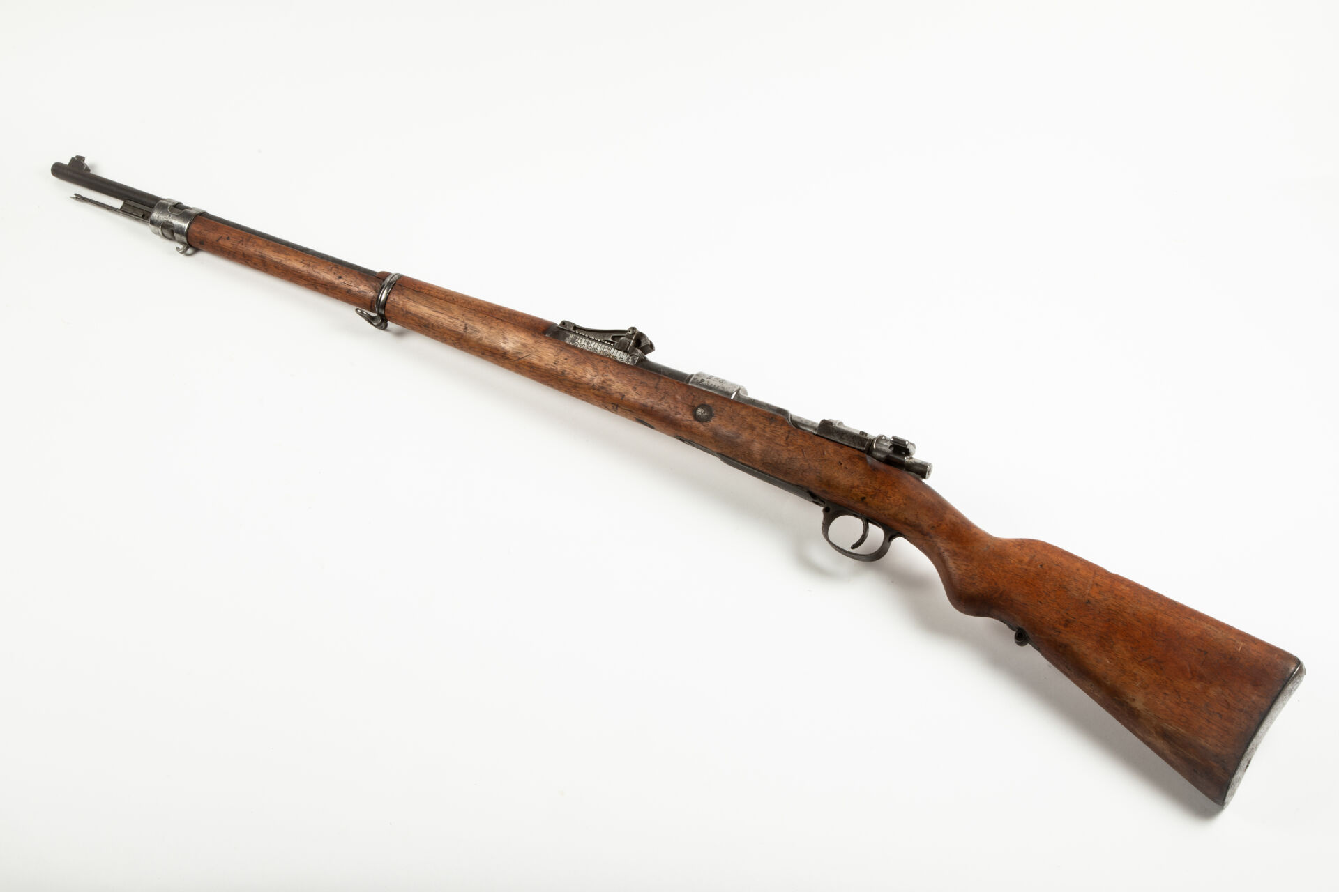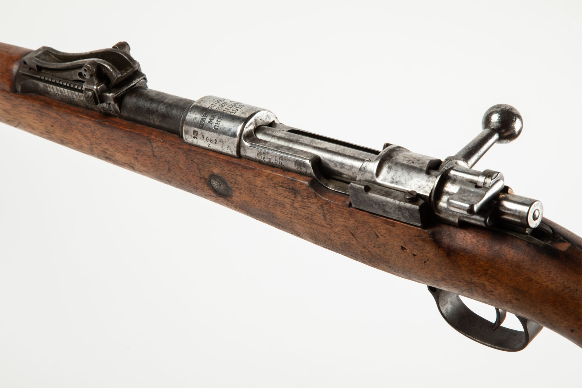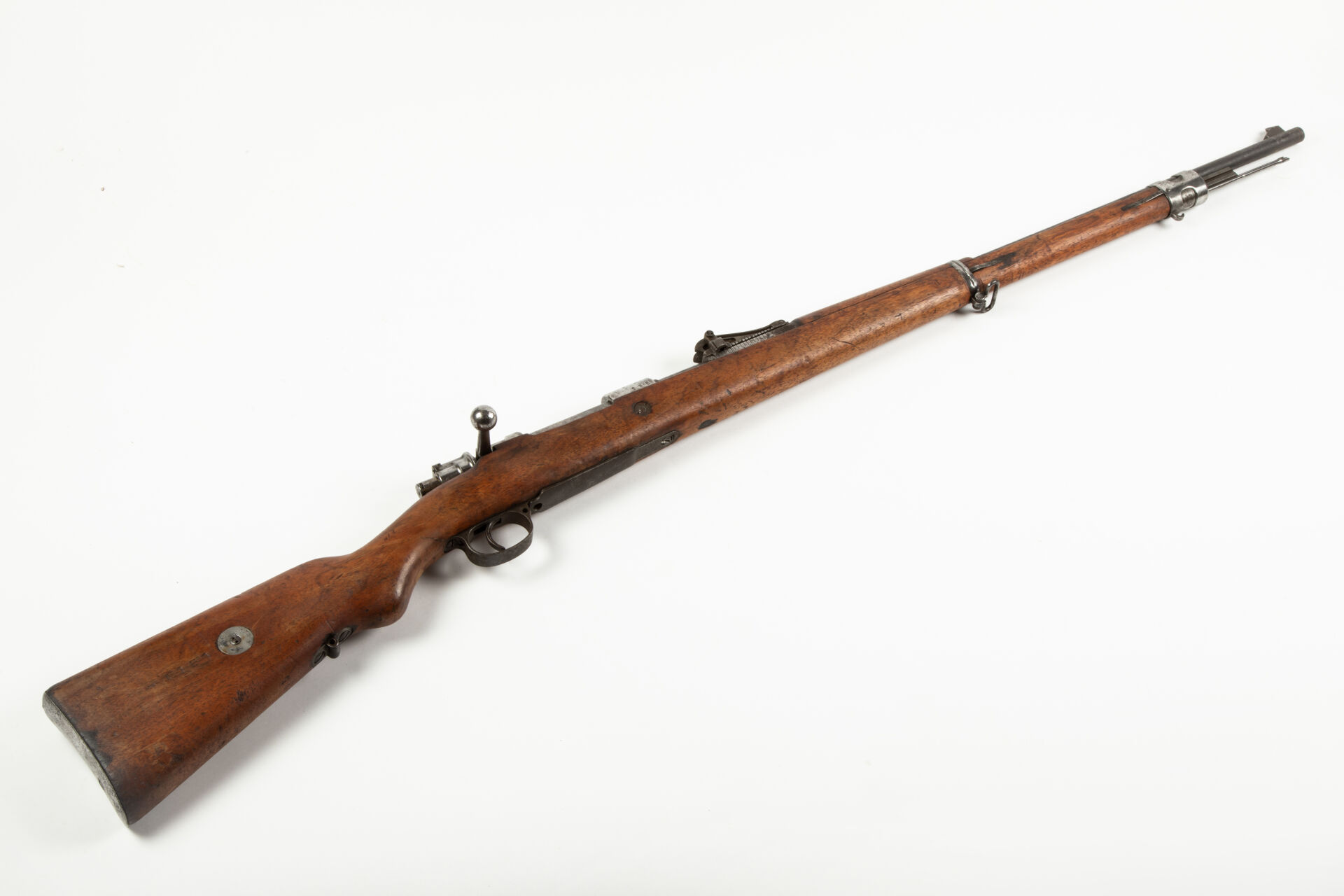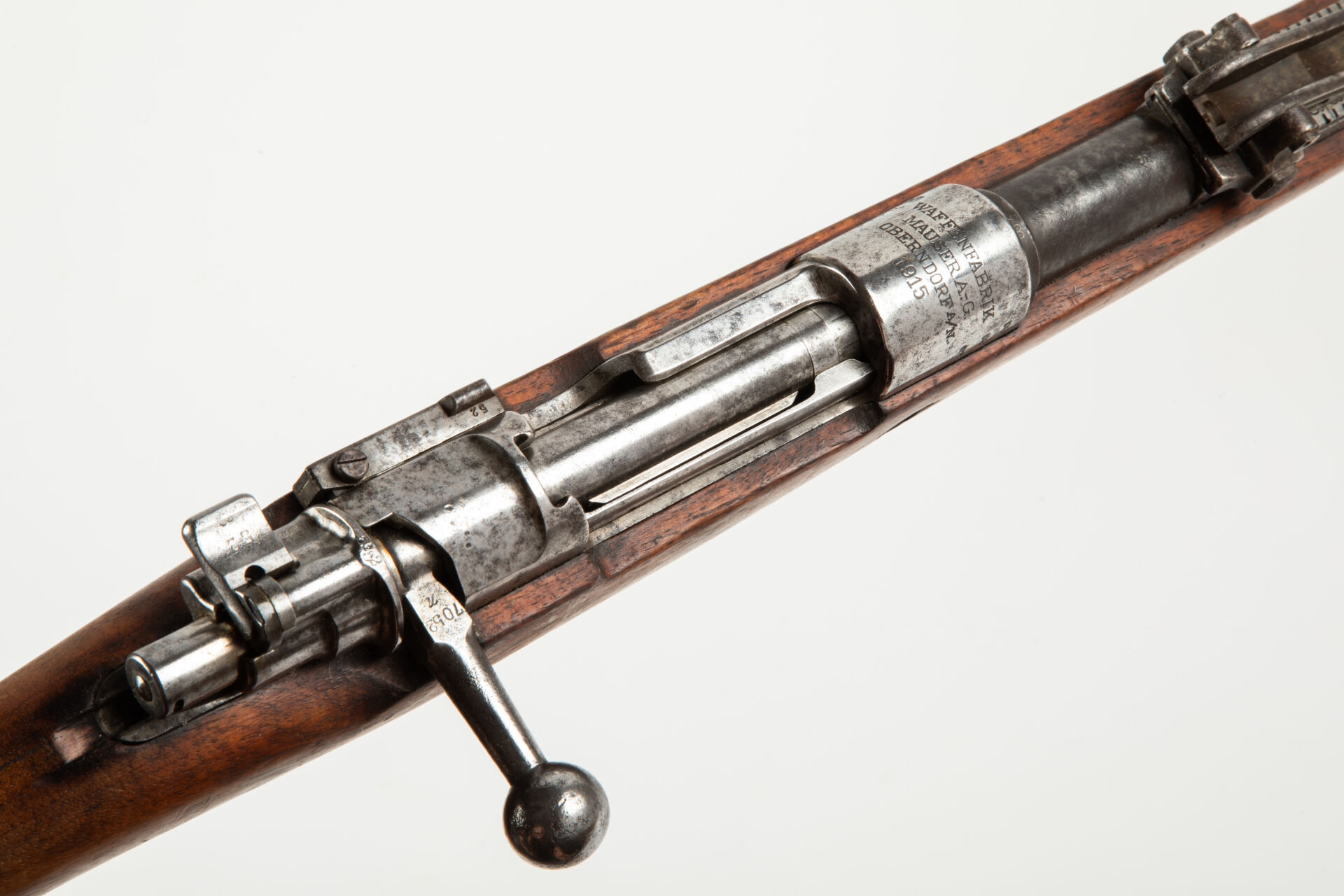 Fusil règlementaire allemand Mauser G98, fabrication Waffenfabrik Mauser A-G Oberndorf A/N en 1915. Certaines pièces pas au numéro, crosse réparée au col, bronzage absent, baguette (tête cassée), bon canon pour le tir, boite de culasse repolie, mécanisme fonctionnel.