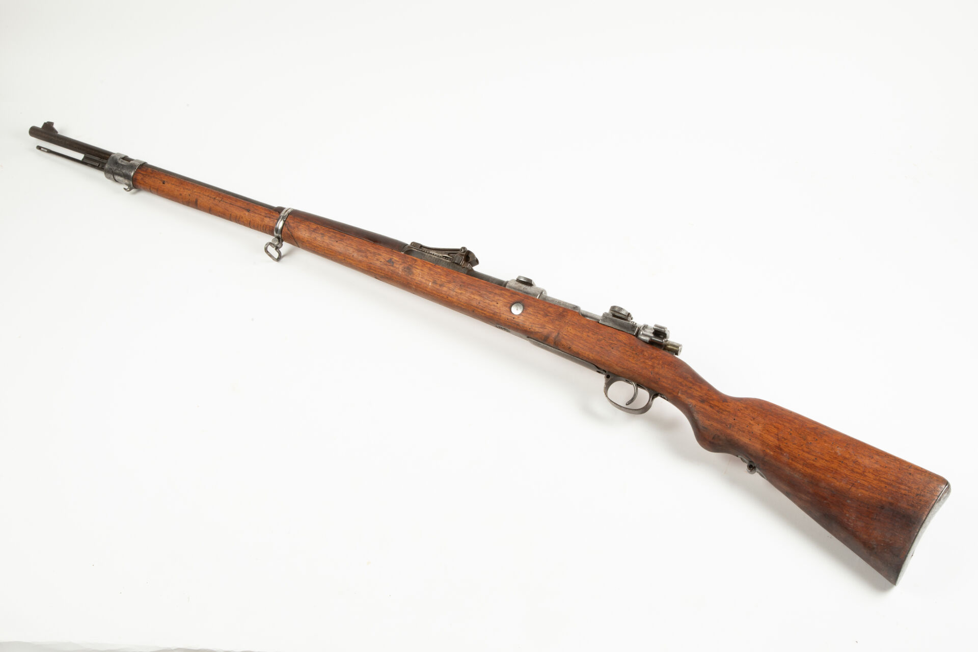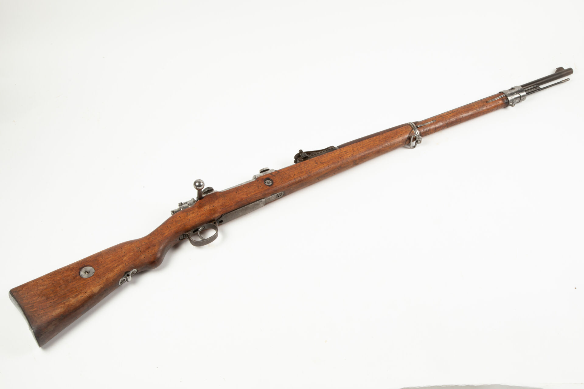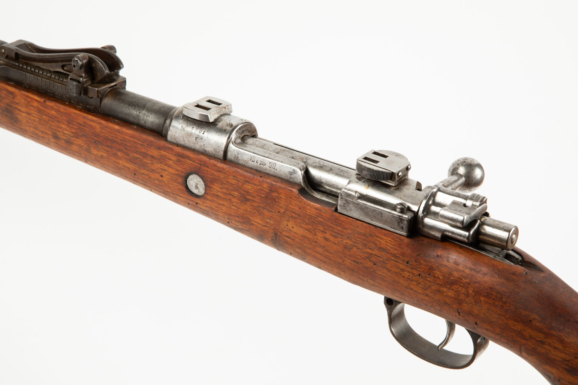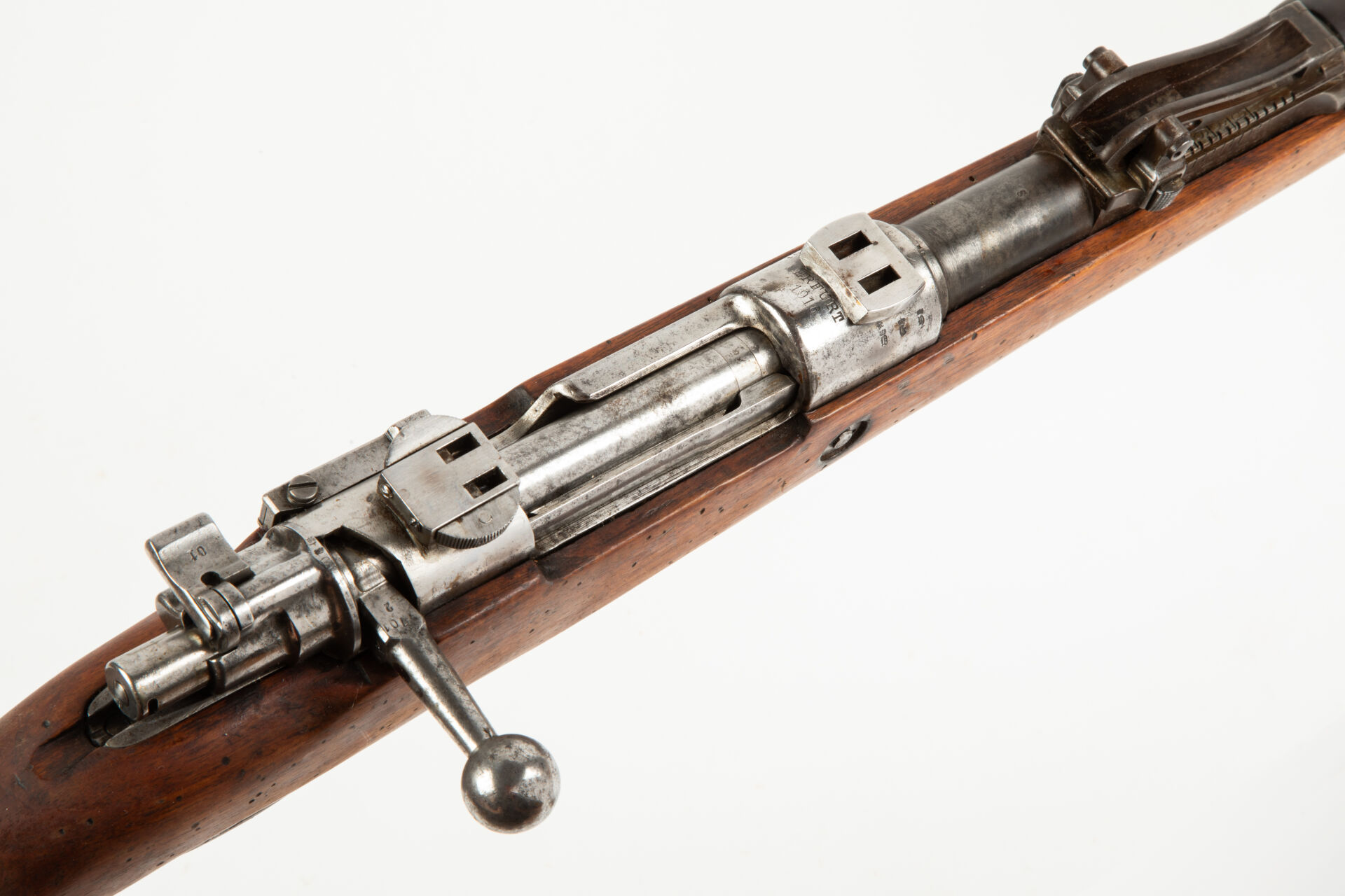 Fusil Mauser 1898 issu de l’arsenal d’Erfurt en 1916. Arme monomatricule, modification S, hausse commencant à 400 m, montage à crochet (attente d’optique), le pied avant est monté en queue d’aronde sur le tonnerre, la serrure arrière est soudée (montage sans garantie). Garde-main changé, très bon canon pour le tir. Mécanisme fonctionnel.