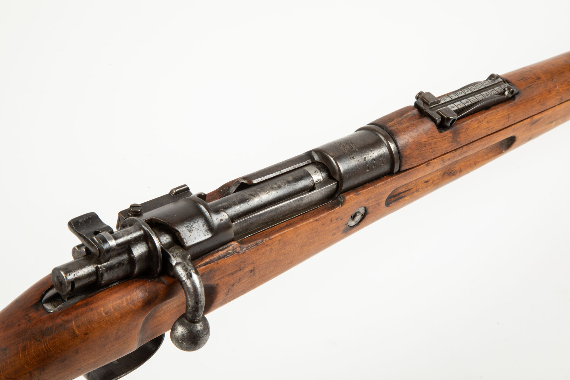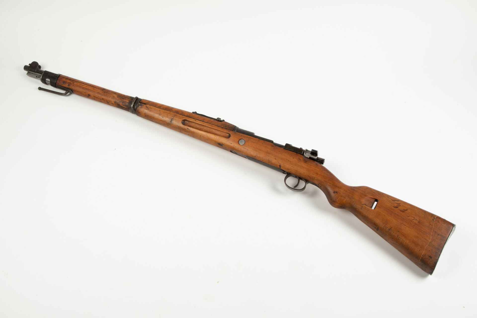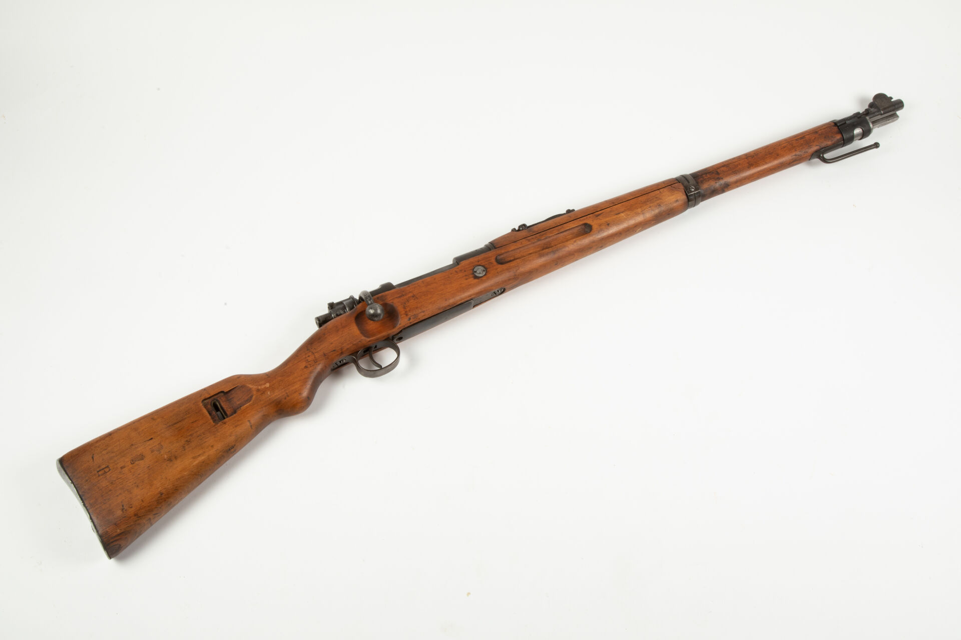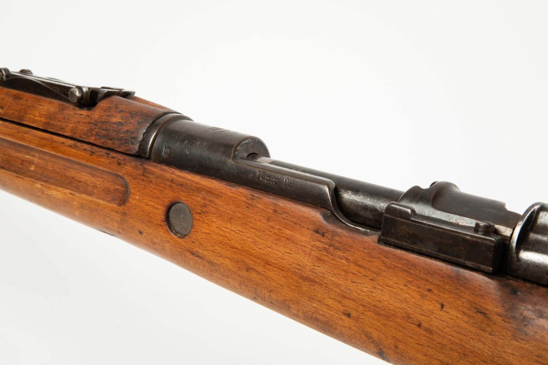 Karabiner 98, fabrication Arsenal d’Erfurt 1917. Arme non monomatricule. Impact à la tuile de la monture, sous le canon (à refixer), pontet de fixation du glissant de hausse à gauche cassé. Bon canon pour le tir, Mécanisme fonctionnel.