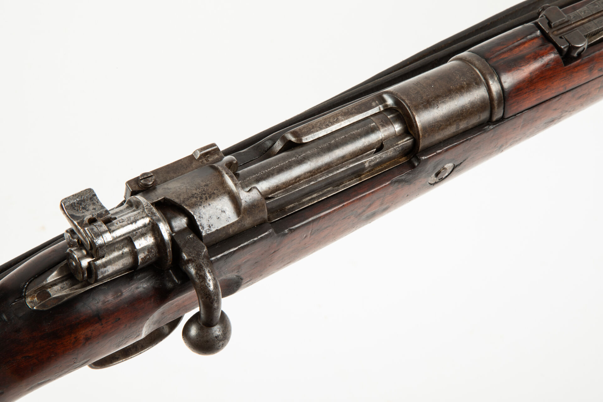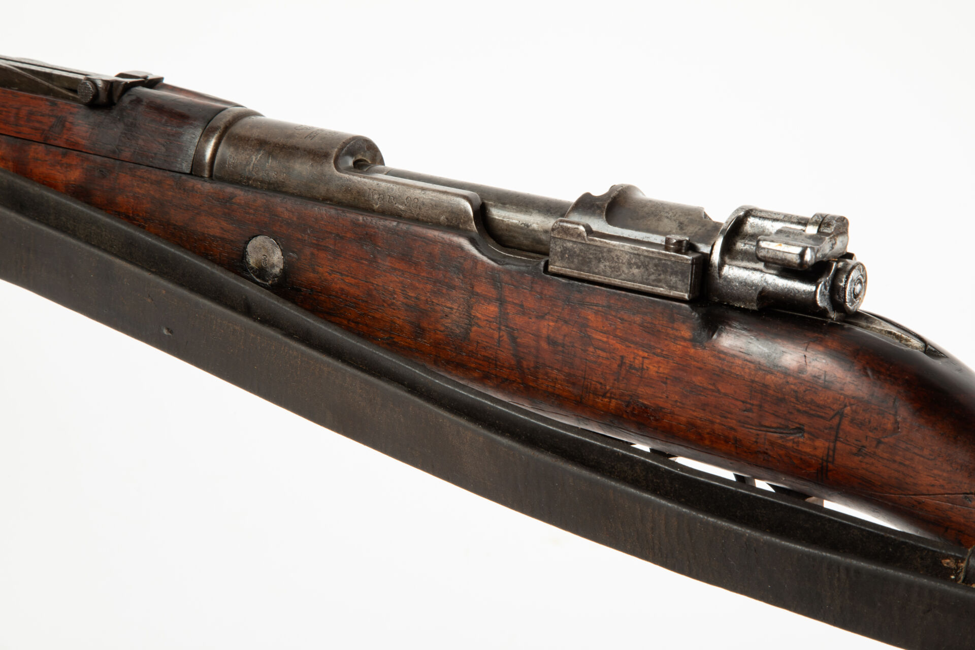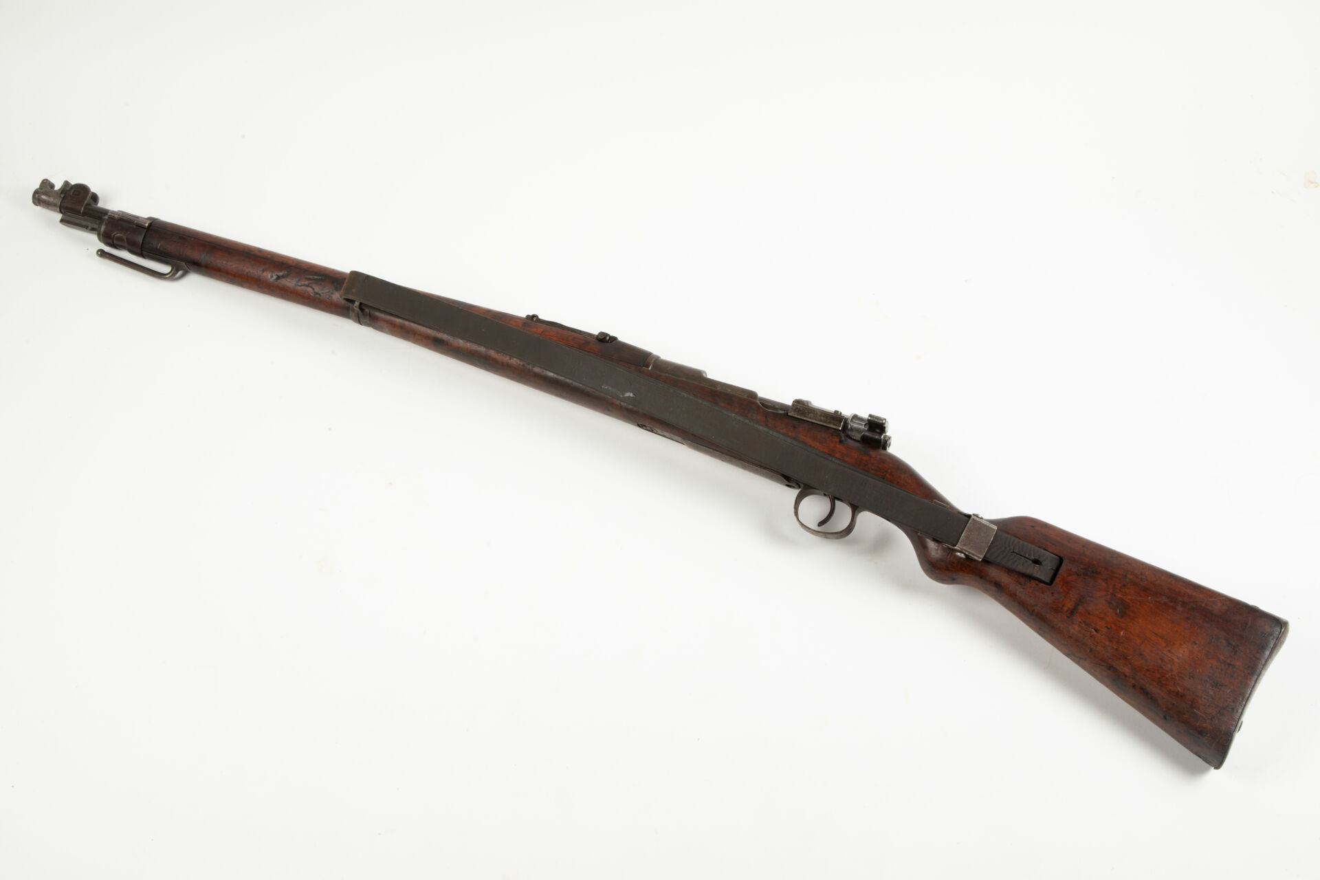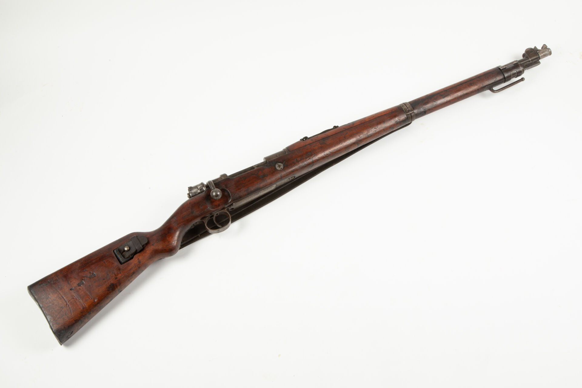 Karabiner 98, fabrication Erfurt 1908, arme monomatricule sauf la noix et le drapeau, légère oxydation générale, avec son rare bouchon de canon à clapet spécifique pour le modèle, mécanisme fonctionnel avec sa bretelle.