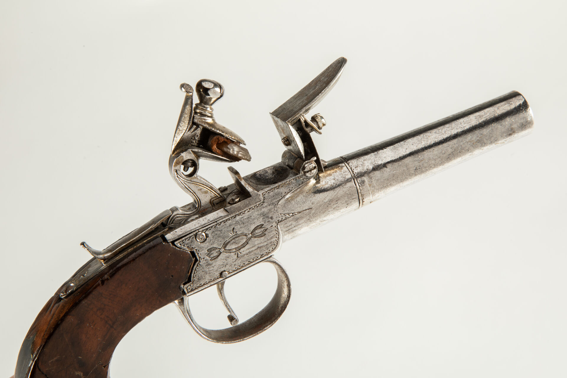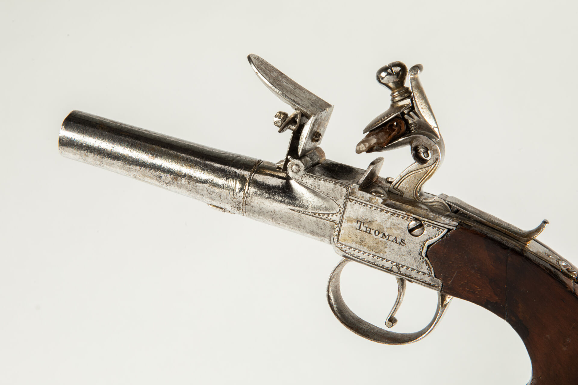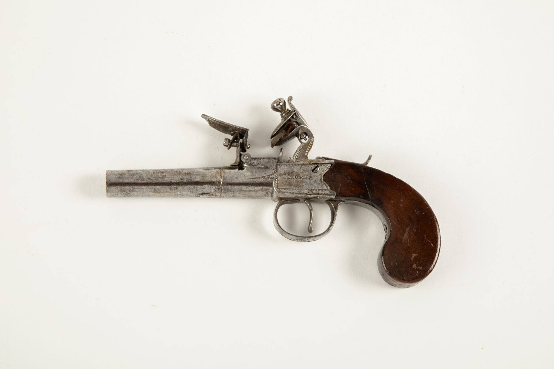 103 ESTIMATION: 120 / 150 € Pistolet à silex à coffre signé « THOMAS », crosse en noyer, canon rond à balles forcées Longueur totale : 180 mm Etat 1- Arme de Catégorie D