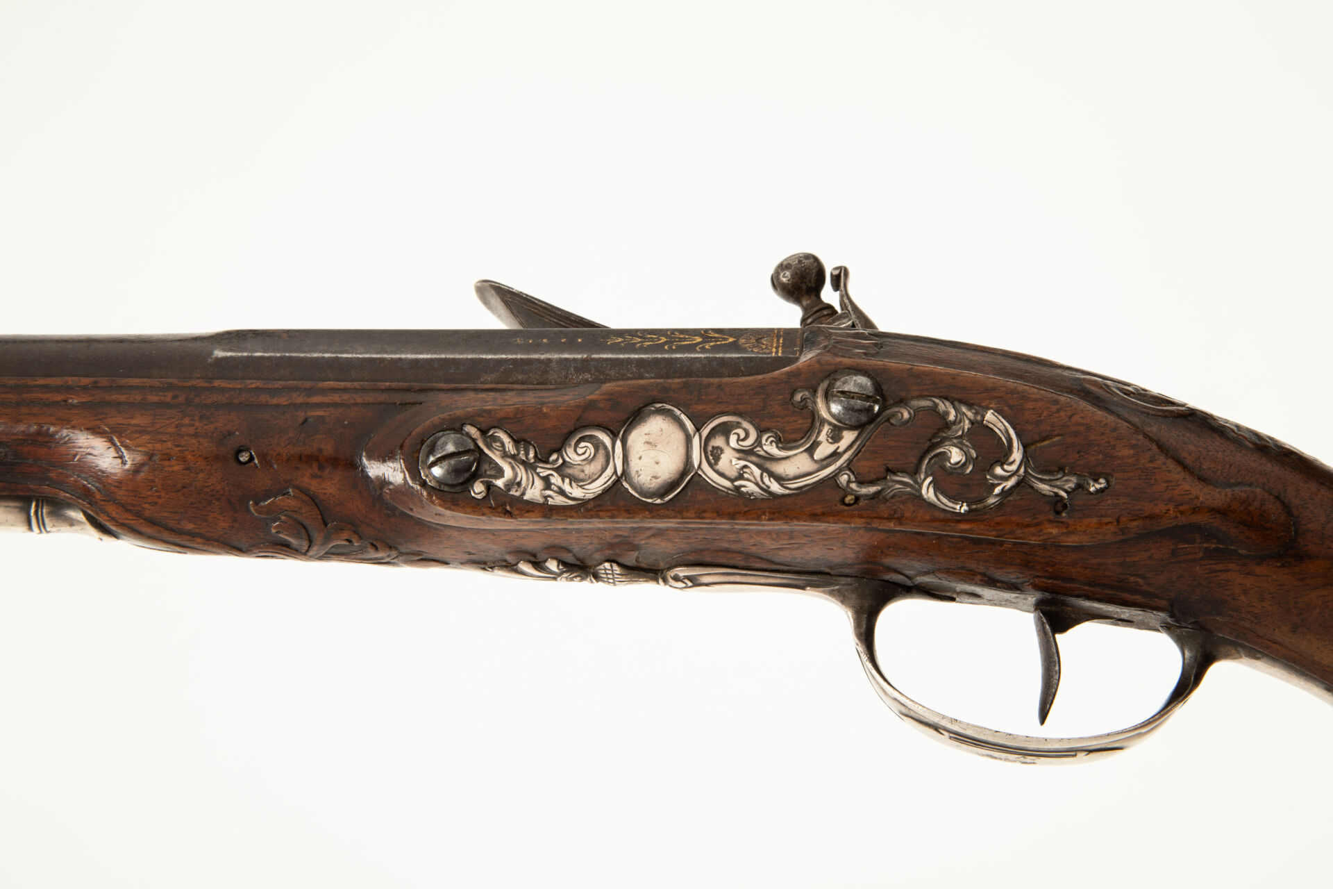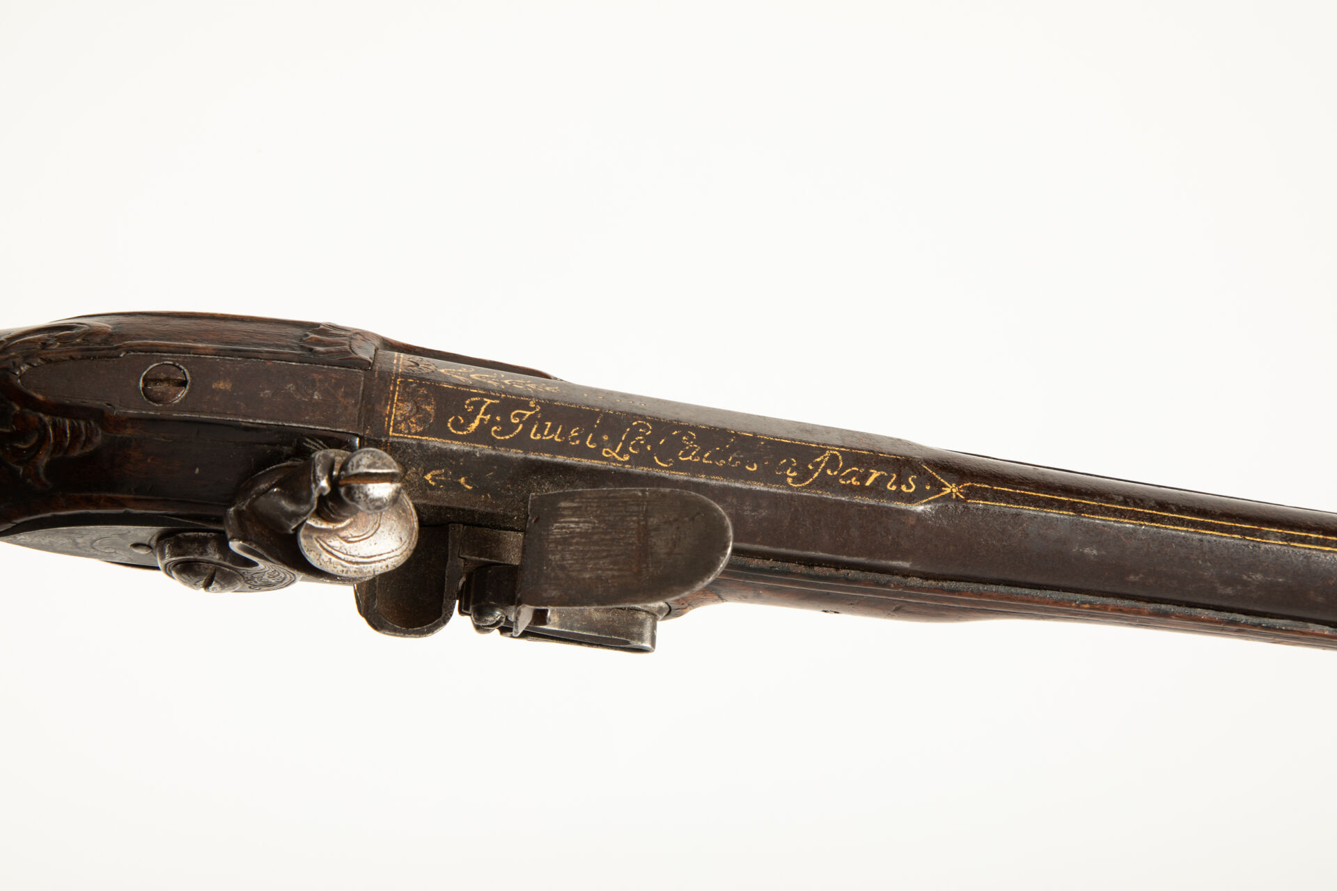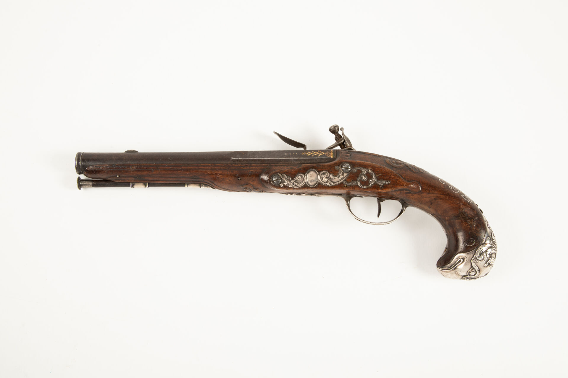 Grand pistolet à silex par F. FIVET le cadet à Paris comme en atteste la double signature à l’or sur le plat du canon et gravé sur le corps de platine, canon octogonal puis rond renforcé à la bouche, lisse au calibre de 26 balles à la livre, corps de platine plat, chien col de cygne plat, bassinet à pans, ressort de batterie vissé de l’intérieur, arme garnie argent, contre-platine à médaillon central ajouré, calotte en bec de passereau, pontet orné d’une urne à l’avant, incrustations de fils d’argent décorative au niveau de la poignée, belle monture en noyer vernis se prolongeant jusqu’à la bouche, la mise en bois des garnitures et surlignée, pour un effet décoratif, de belles sculptures en relief les encadrant, une larme est sculptée à l’arrière de la mise en bois de la platine ainsi qu’à l’arrière de l’emplacement de la contre-platine, le canon retient sa couleur tabac d’origine avec une légère peau d’orange, mécanisme fonctionnel, baguette corne à embout à tête de clou en argent. Pistolet de belle fabrication.