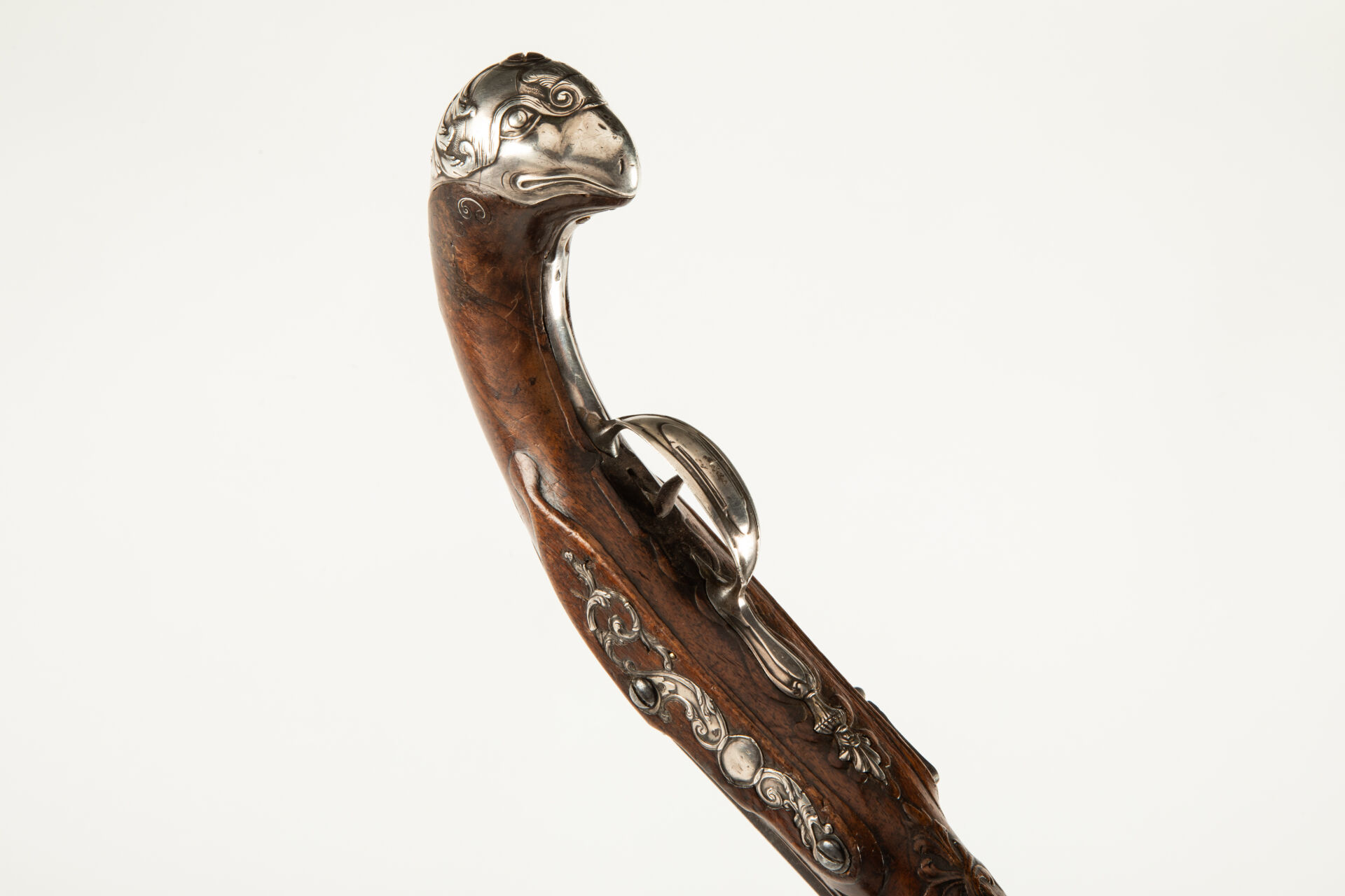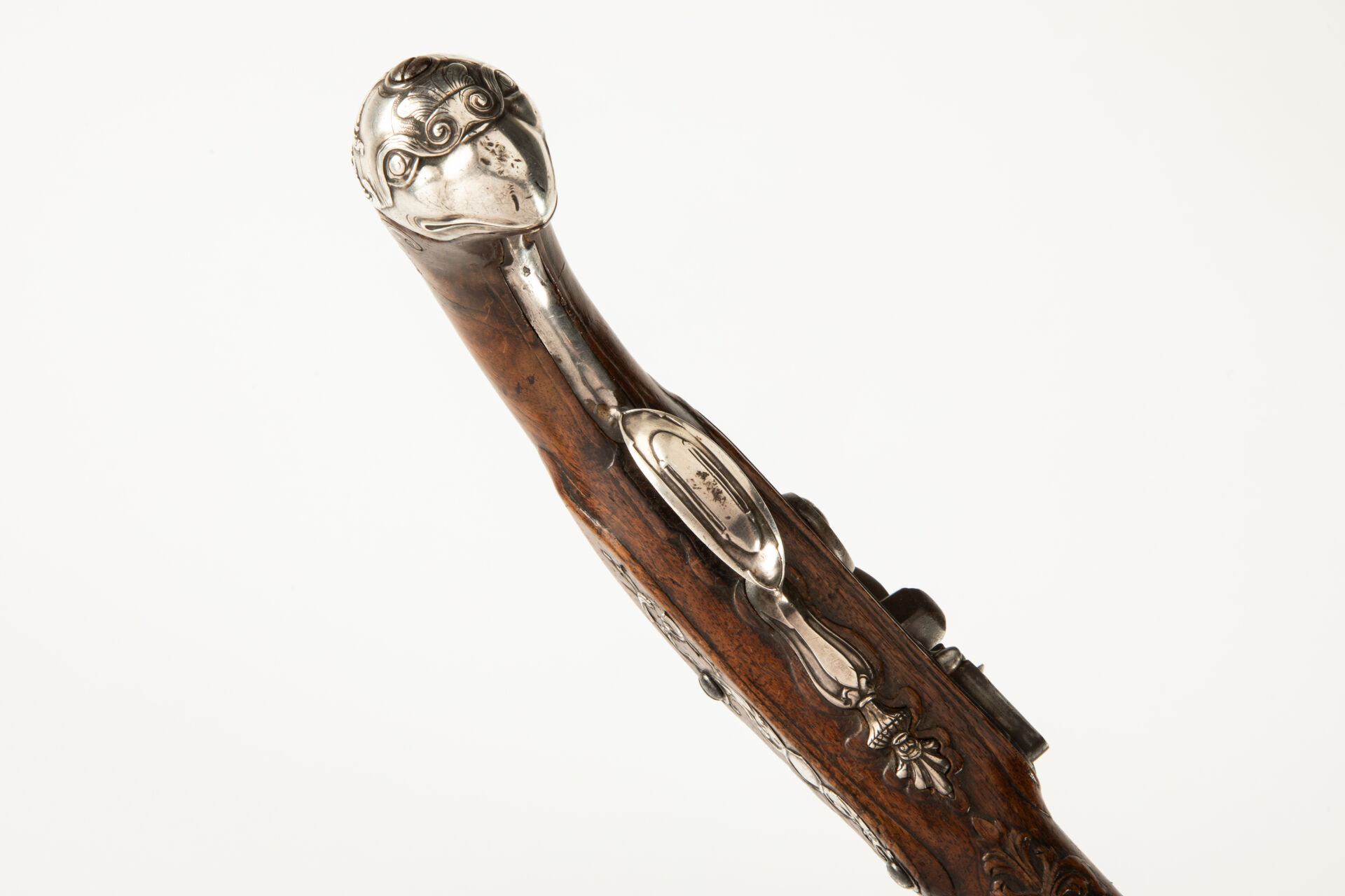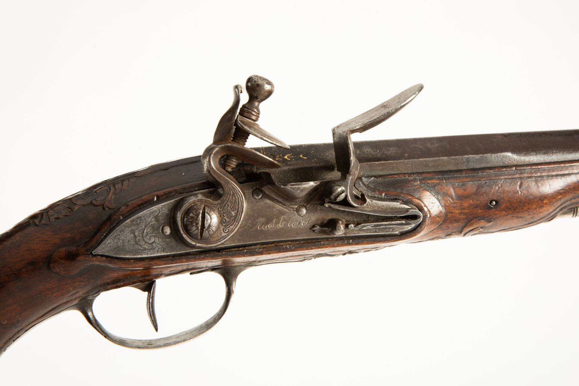 Grand pistolet à silex par F. FIVET le cadet à Paris comme en atteste la double signature à l’or sur le plat du canon et gravé sur le corps de platine, canon octogonal puis rond renforcé à la bouche, lisse au calibre de 26 balles à la livre, corps de platine plat, chien col de cygne plat, bassinet à pans, ressort de batterie vissé de l’intérieur, arme garnie argent, contre-platine à médaillon central ajouré, calotte en bec de passereau, pontet orné d’une urne à l’avant, incrustations de fils d’argent décorative au niveau de la poignée, belle monture en noyer vernis se prolongeant jusqu’à la bouche, la mise en bois des garnitures et surlignée, pour un effet décoratif, de belles sculptures en relief les encadrant, une larme est sculptée à l’arrière de la mise en bois de la platine ainsi qu’à l’arrière de l’emplacement de la contre-platine, le canon retient sa couleur tabac d’origine avec une légère peau d’orange, mécanisme fonctionnel, baguette corne à embout à tête de clou en argent. Pistolet de belle fabrication.