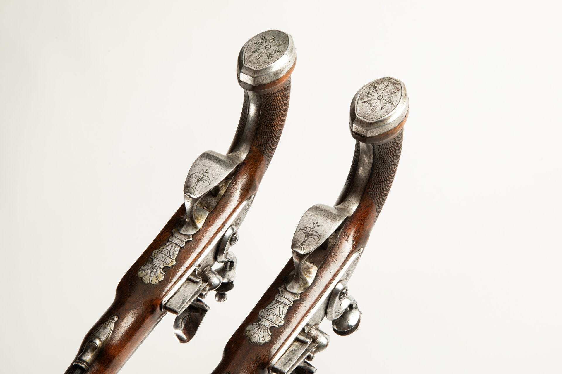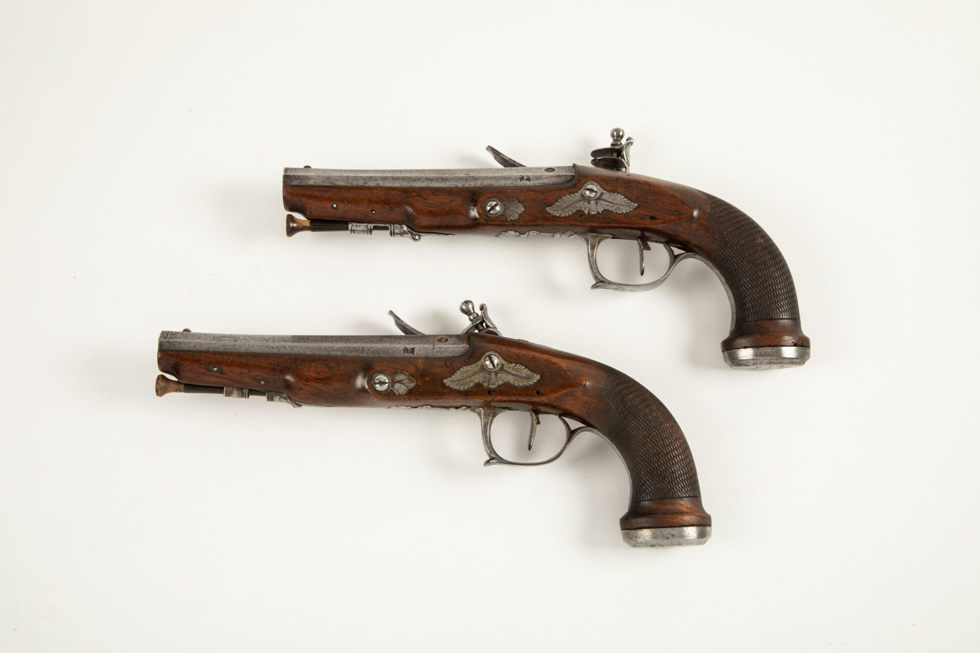 Belle paire de pistolets d’Officier à silex contemporains du Premier Empire, canons octogonaux lisses au calibre de 36 balles à la livre évasé à la bouche portant trois poinçons en creux sur chaque pan au niveau du tonnerre, col de platine plat, chien col de cygne plat, bassinet fer rond, ressort de batterie vissé de l’intérieur, arme montée fer, pontet rond, calotte plate à deux degrés, pontet à décor d’urnes enflammées à l’avant, deux rosettes de contre-platine sculptées, baguette corne à embout corne, mécanismes fonctionnels.