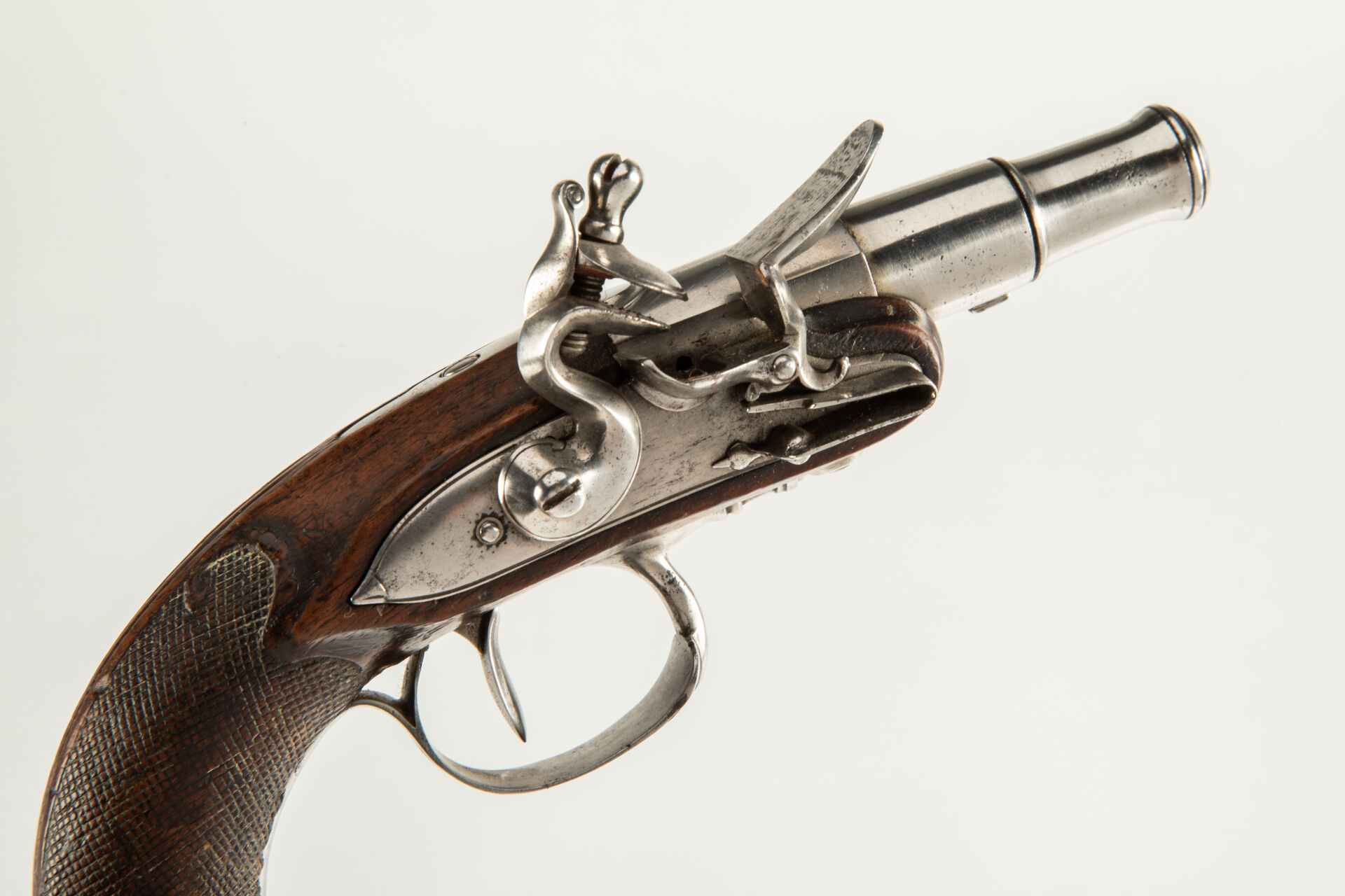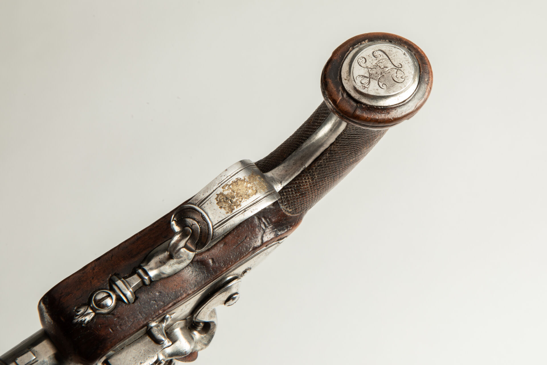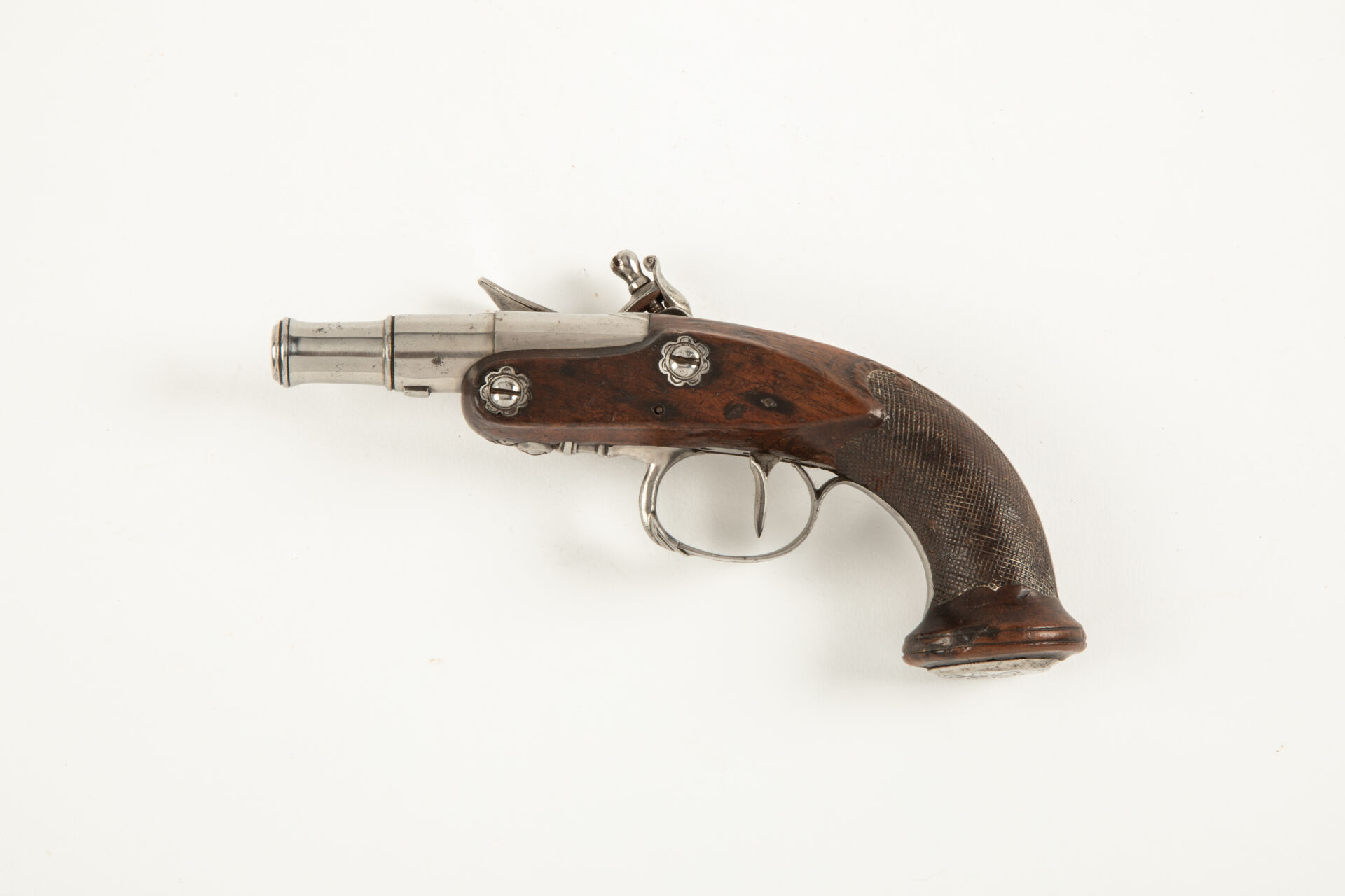 Joli pistolet de gousset à silex et à balle forcée au calibre de 52 balles à la livre, court canon rond renforcé à la bouche, corps de platine rond, chien col de cygne renforcé, ressort de batterie vissé de l’intérieur, bassinet rond en fer, rosette de vis de contre-platine florale, arme montée fer, avant du pontet découpé en urne enflammée, calotte de crosse ovale portant des initiales et à pourtours concaves, belle monture en noyer à angle droit rappelant le Premier Empire, fine quadrille à la poignée, mécanisme fonctionnel, arme polie blanc