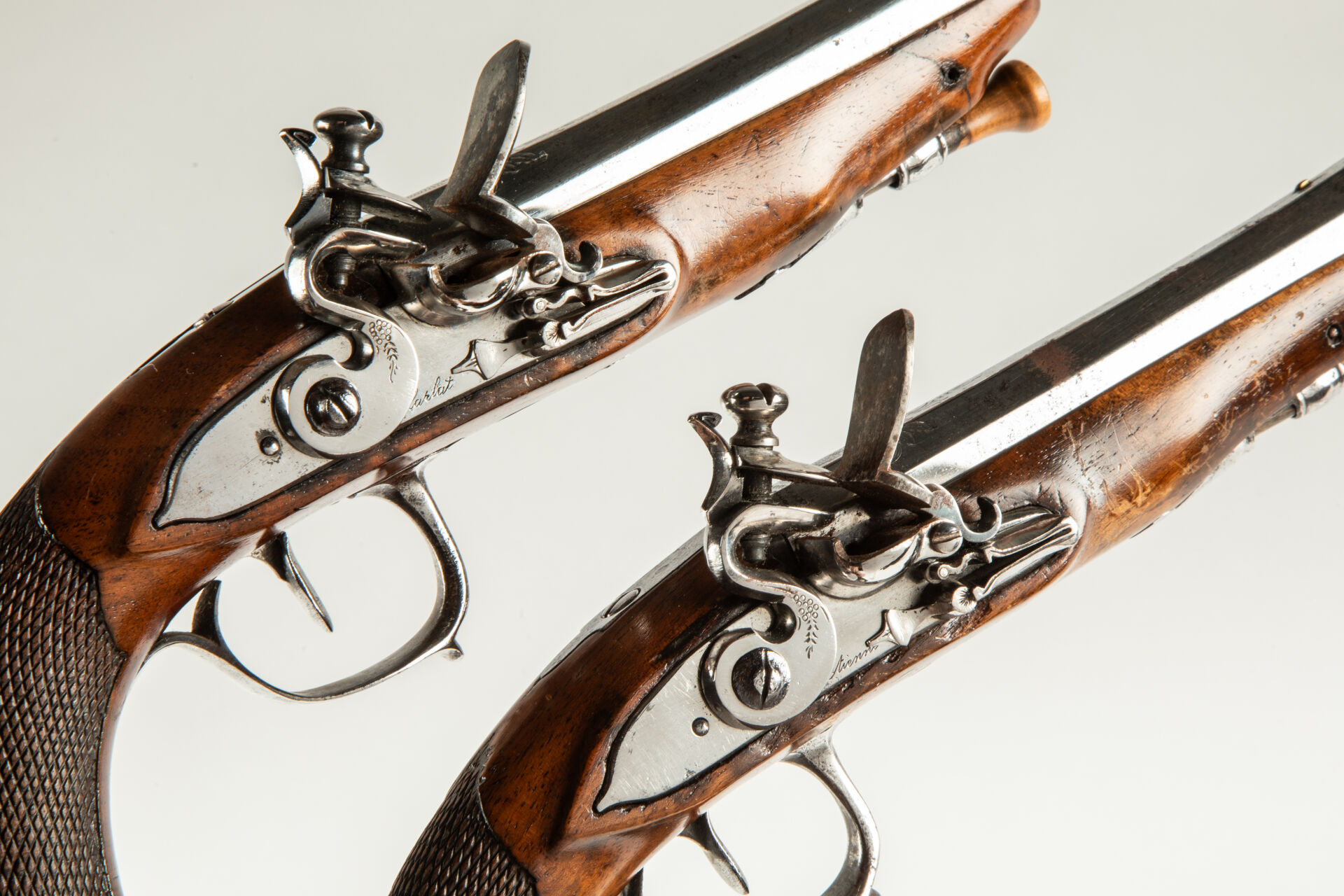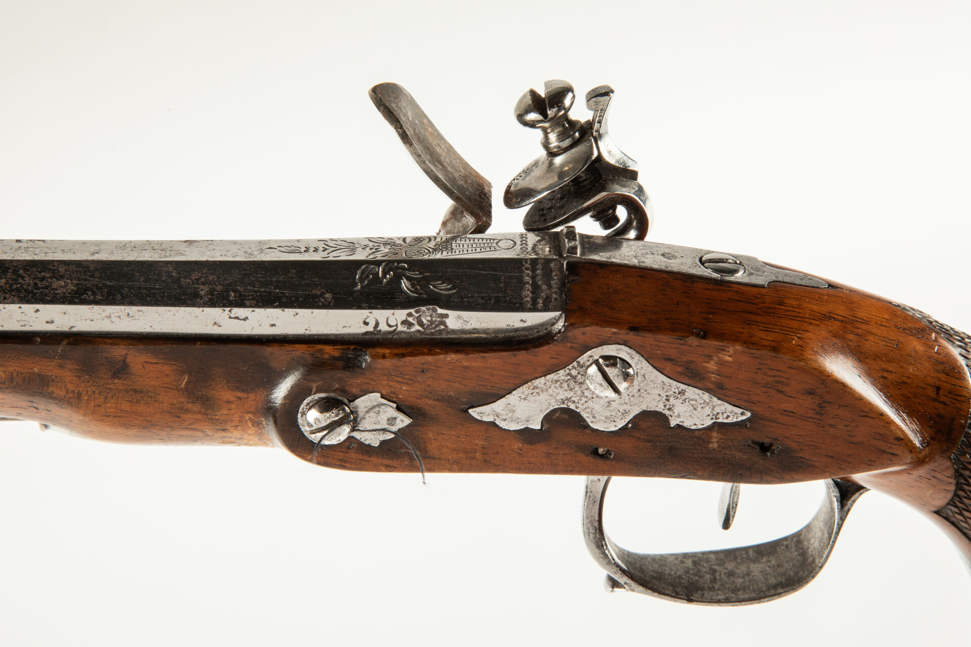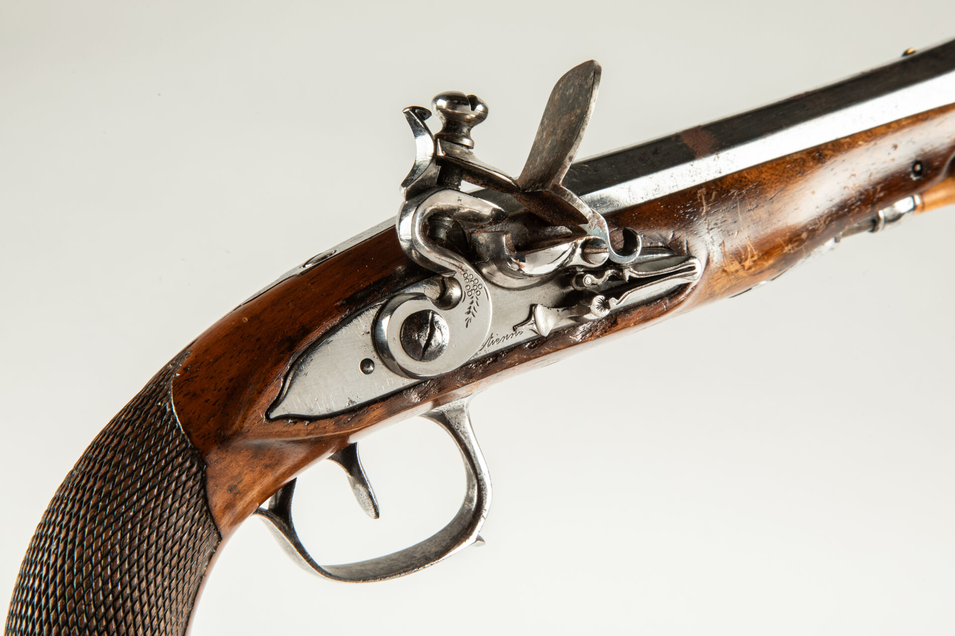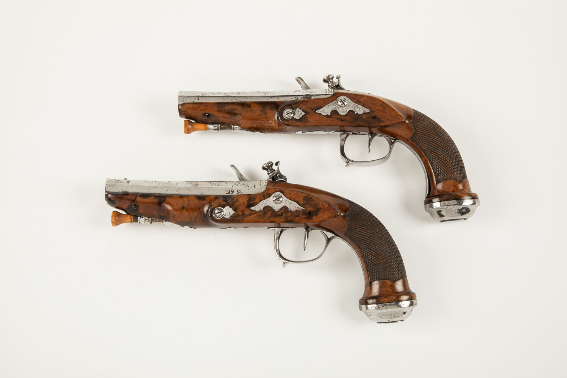 Paire de pistolets de demi-arçon à silex par « Carlat à Saint Etienne », canons octogonaux lisses au calibre de 34 balles à la livre, bouche légèrement évasée, pans des canons à décors d’urnes florales repolies, corps de platine plat portant pour l’un la signature de l’armurier et pour l’autre la mention de la ville, chien col de cygne plat, bassinet fer, batterie à retroussis, ressort de batterie à rouleau vissée de l’intérieur et guilloché, arme montée fer, monture en noyer vernis quadrillée à la pognée, léger fèl à la tuile d’un des pistolets au niveau de la baguette, mécanisme fonctionnel, armes repolies avec leurs baguettes