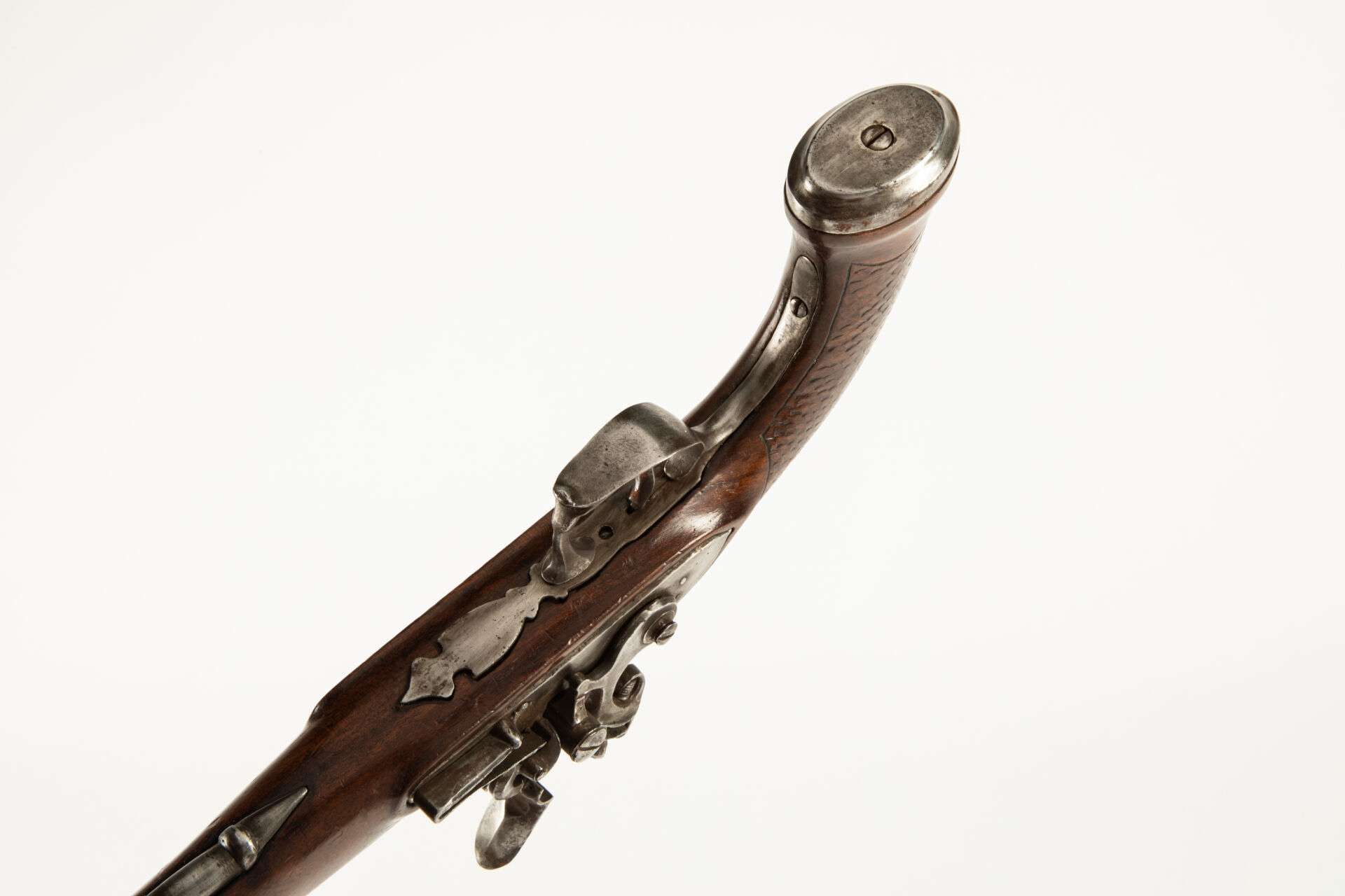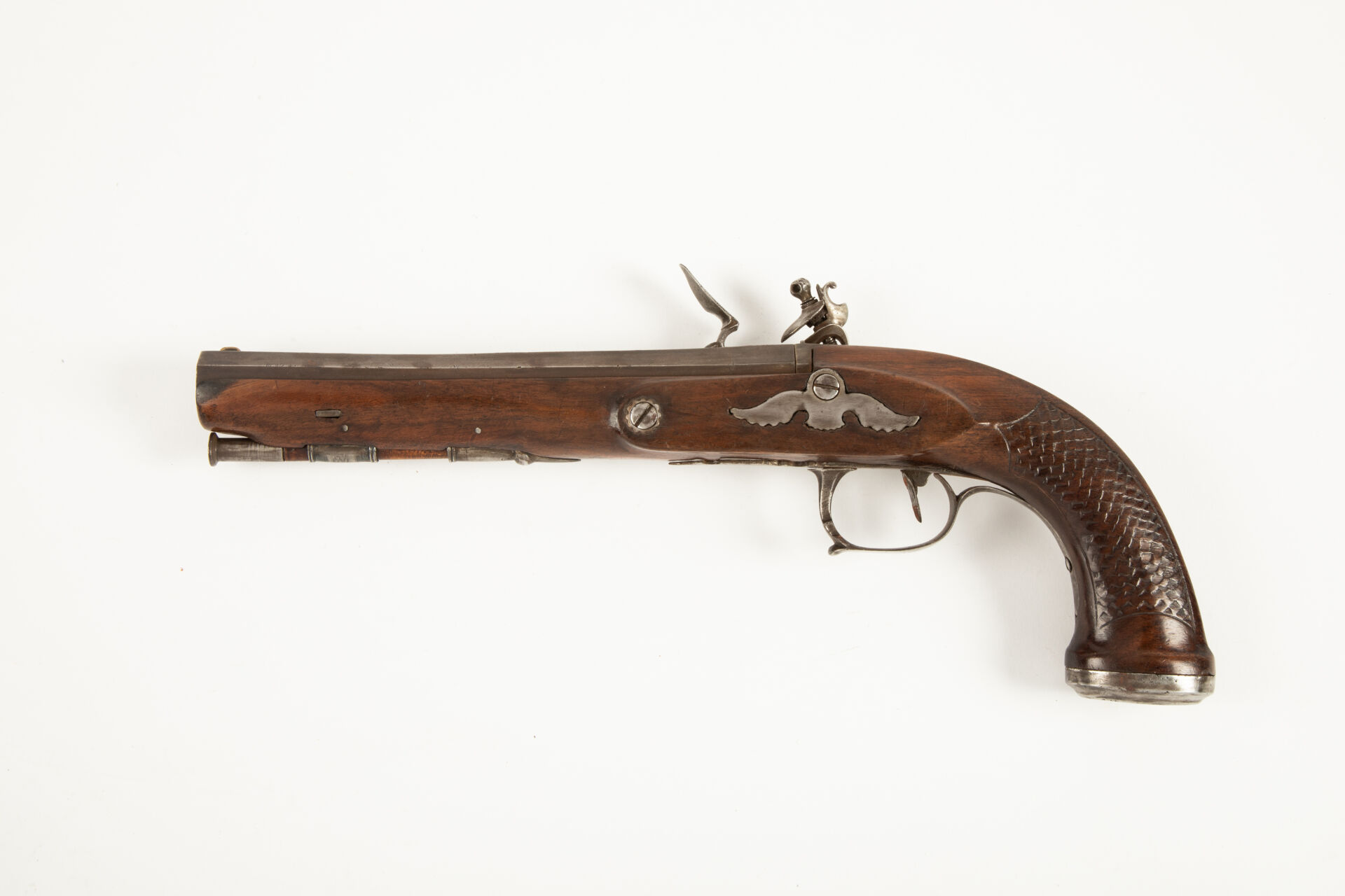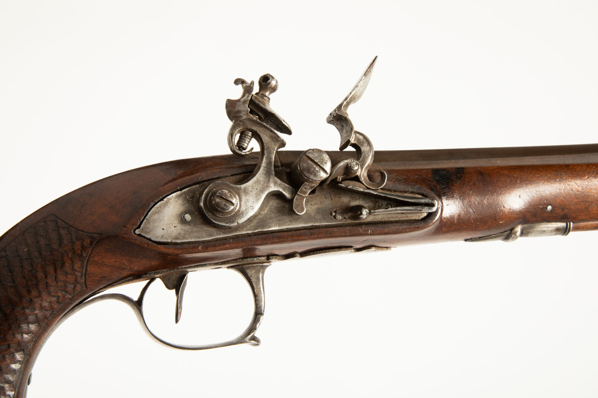 Intéressant pistolet à silex, canon octogonal lisse de fort calibre de 20 balles à la livre, évasé à la bouche, lisse, corps de platine plat, monté avec un curieux chien à silex à ergot dont le pied avant lors de l’abattue du chien fait pivoter le couvercle de bassinet à tambour. Ressort de batterie vissé de l’intérieur, corps de platine en épigraphe, arme montée fer, pontet à lèvre avant (à refixer), calotte plate ovale à deux degrés séparés par une relief concave, contre-platine à moustache, monture en noyer vernis se prolongeant jusqu’à la bouche, agrémentée d’une quadrille en écaille de poisson au niveau de la poignée (en partie estompée), mécanisme fonctionnel.