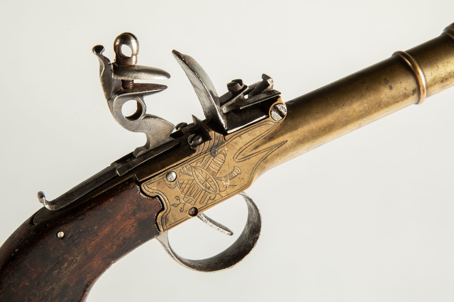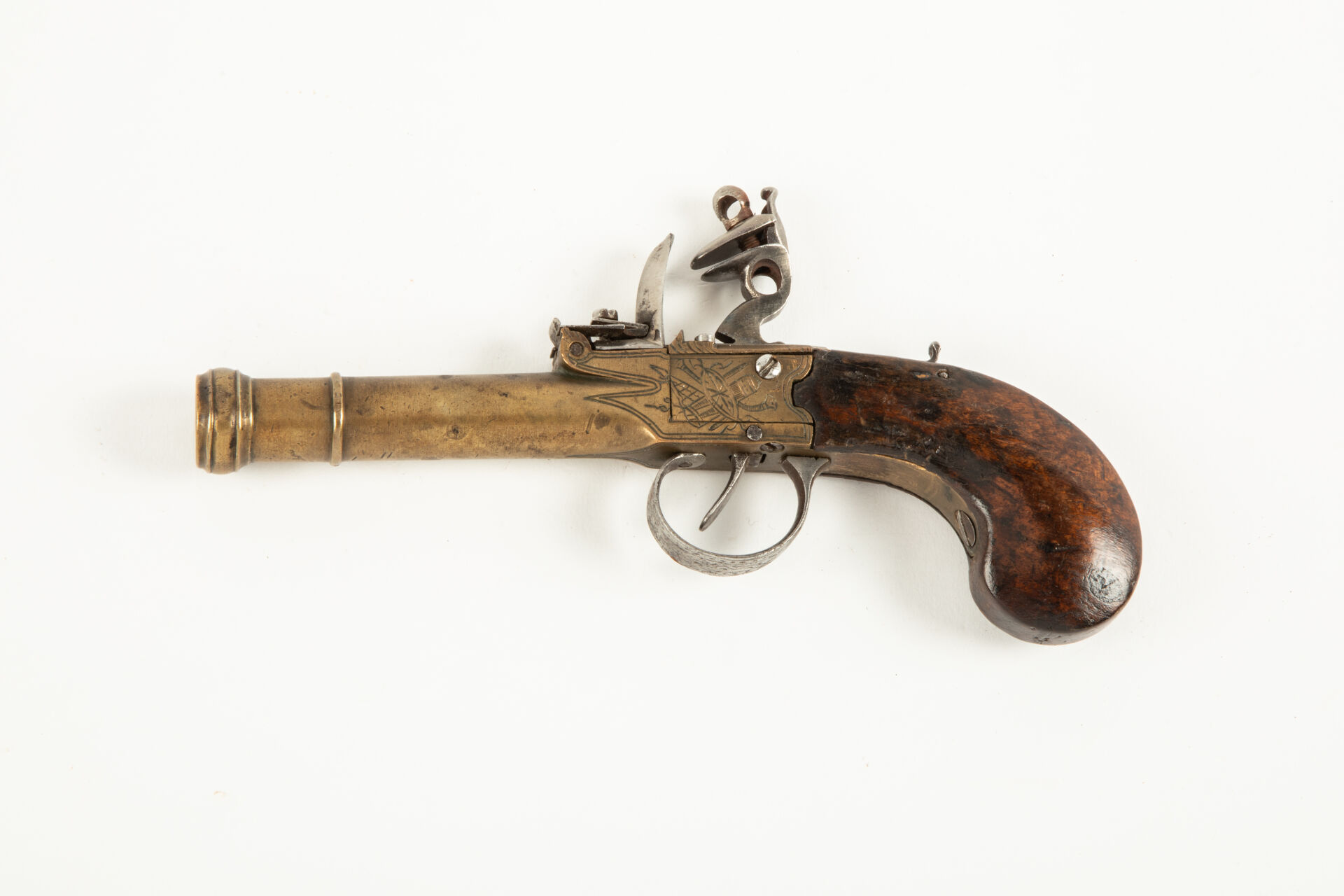 Pistolet à coffre et à silex monté bronze, bouche renforcée, canon lisse au calibre de 36 balles à la livre, flanc du coffre gravé de trophées d’armes, chien à espalet plat, vis de mâchoire sans garantie, sureté à glissant bloquant le bassinet en position fermée, monture ronde à flanc plat bombé en noyer vernis, accroche du chien à revoir, faiblesse au niveau du ressort de rappel de détente