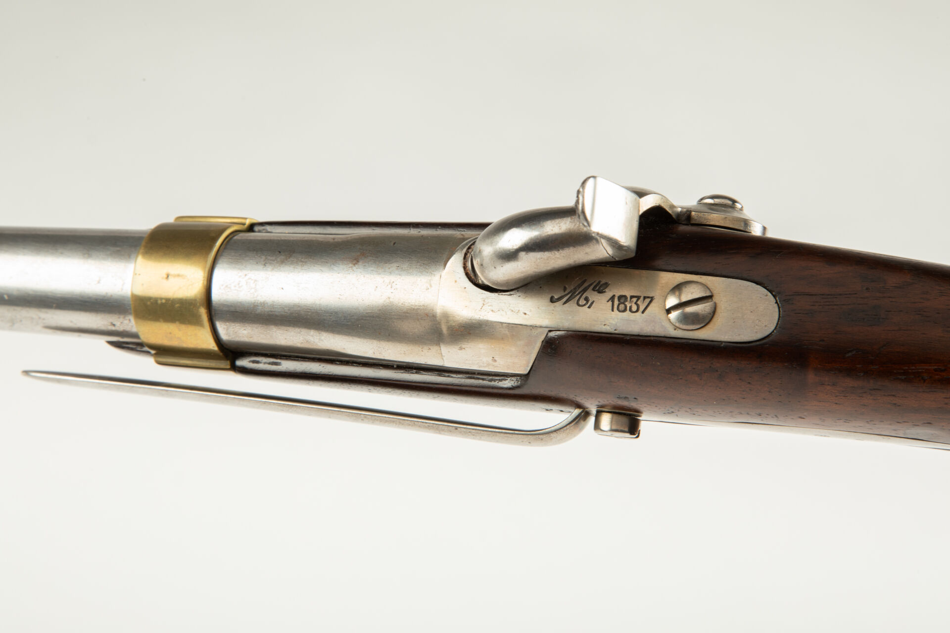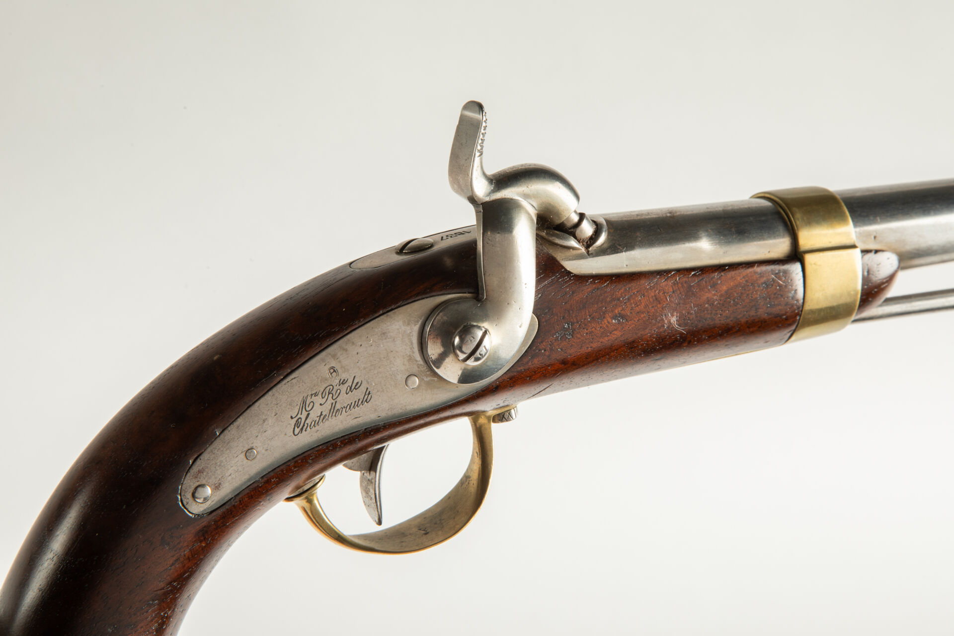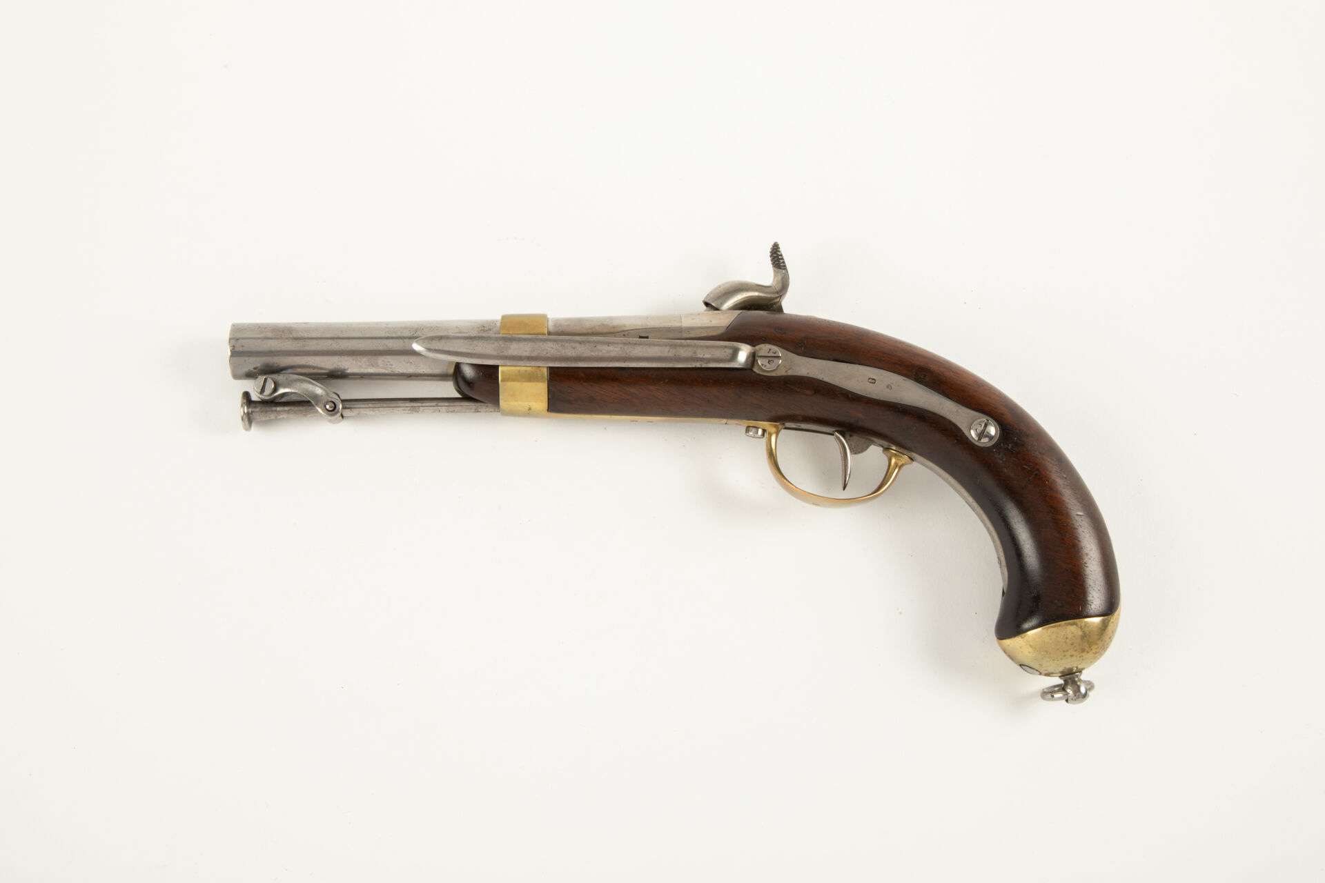 Joli pistolet règlementaire de Marine, modèle 1837 issu de la Manufacture Royale de Châtellerault, queue de culasse marquée « Mle 1837 », baguette articulée, crochet de ceinture présent, toutes garnitures laiton, calotte réceptionnée à l’ancre de marine, monture en noyer verni intacte, très bel exemplaire, mécanisme fonctionnel.
