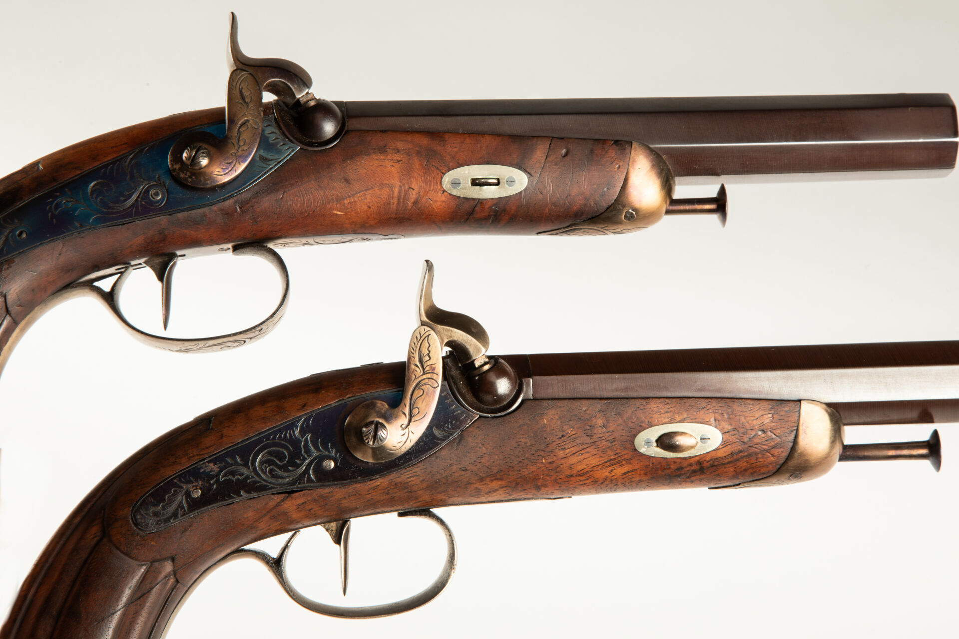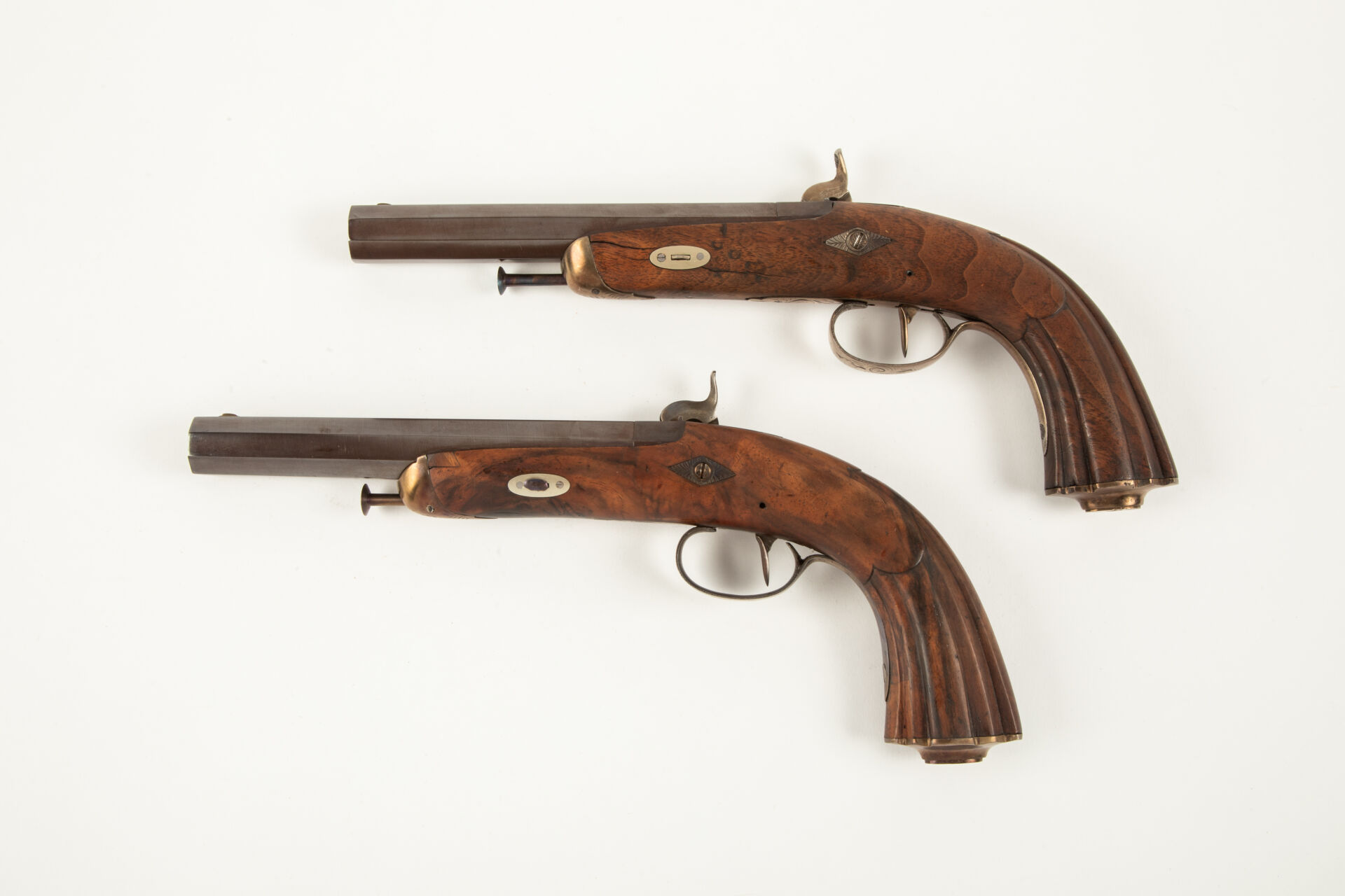 Grande paire de pistolets de combat à percussion, canons octogonaux lisses au calibre de 22 balles à la livre en damas remis en couleur tabac, corps de platines à l’arrière, gravures de rinceaux, masselottes sur queues de culasses rapportées, pontets ronds, canons montés à tiroir, crosses renaissance en noyer, calottes proéminentes, enture au niveau de la calotte et sur le flanc gauche de la capuche sur l’un des pistolets, légère fente à la tuile à gauche sur l’autre pistolet, toutes les parties métalliques remises en couleur (revenu ambre, foie, gorge de pigeon, facilement nettoyable), mécanisme fonctionnel.